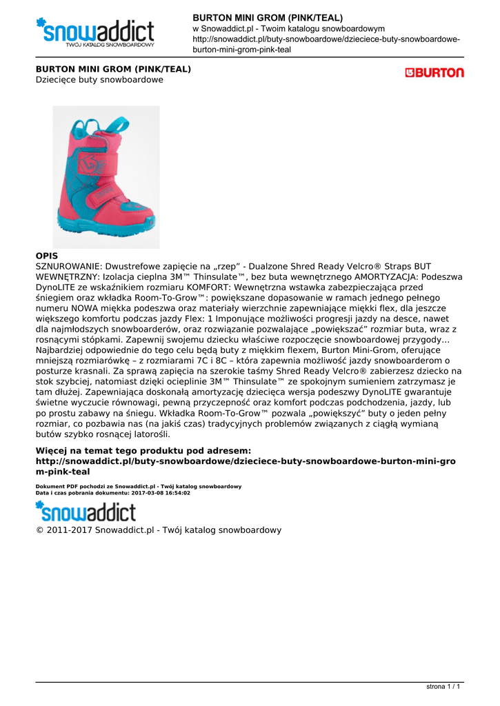 BURTON MINI GROM (PINK/TEAL) w Snowaddict.pl - Twoim katalogu snowboardowym http://snowaddict.pl/buty-snowboardowe/dzieciece-buty-snowboardoweburton-mini-grom-pink-teal BURTON MINI GROM (PINK/TEAL) Dziecięce buty snowboardowe OPIS SZNUROWANIE: Dwustrefowe zapięcie na „rzep” - Dualzone Shred Ready Velcro® Straps BUT WEWNĘTRZNY: Izolacja cieplna 3M™ Thinsulate™, bez buta wewnętrznego AMORTYZACJA: Podeszwa DynoLITE ze wskaźnikiem rozmiaru KOMFORT: Wewnętrzna wstawka zabezpieczająca przed śniegiem oraz wkładka Room-To-Grow™: powiększane dopasowanie w ramach jednego pełnego numeru NOWA miękka podeszwa oraz materiały wierzchnie zapewniające miękki flex, dla jeszcze większego komfortu podczas jazdy Flex: 1 Imponujące możliwości progresji jazdy na desce, nawet dla najmłodszych snowboarderów, oraz rozwiązanie pozwalające „powiększać” rozmiar buta, wraz z rosnącymi stópkami. Zapewnij swojemu dziecku właściwe rozpoczęcie snowboardowej przygody… Najbardziej odpowiednie do tego celu będą buty z miękkim flexem, Burton Mini-Grom, oferujące mniejszą rozmiarówkę – z rozmiarami 7C i 8C – która zapewnia możliwość jazdy snowboarderom o posturze krasnali. Za sprawą zapięcia na szerokie taśmy Shred Ready Velcro® zabierzesz dziecko na stok szybciej, natomiast dzięki ocieplinie 3M™ Thinsulate™ ze spokojnym sumieniem zatrzymasz je tam dłużej. Zapewniająca doskonałą amortyzację dziecięca wersja podeszwy DynoLITE gwarantuje świetne wyczucie równowagi, pewną przyczepność oraz komfort podczas podchodzenia, jazdy, lub po prostu zabawy na śniegu. Wkładka Room-To-Grow™ pozwala „powiększyć” buty o jeden pełny rozmiar, co pozbawia nas (na jakiś czas) tradycyjnych problemów związanych z ciągłą wymianą butów szybko rosnącej latorośli. Więcej na temat tego produktu pod adresem: http://snowaddict.pl/buty-snowboardowe/dzieciece-buty-snowboardowe-burton-mini-gro m-pink-teal Dokument PDF pochodzi ze Snowaddict.pl - Twój katalog snowboardowy Data i czas pobrania dokumentu: 2017-03-08 16:54:02 © 2011-2017 Snowaddict.pl - Twój katalog snowboardowy strona 1 / 1 Powered by TCPDF (www.tcpdf.org)
