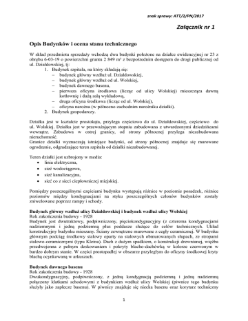 znak sprawy: ATT/2/PN/2017 Załącznik nr 1 Opis Budynków i ocena stanu technicznego W skład przedmiotu sprzedaży wchodzą dwa budynki położone na działce ewidencyjnej nr 23 z obrębu 6-03-19 o powierzchni gruntu 2 849 m² z bezpośrednim dostępem do drogi publicznej od ul. Działdowskiej, tj: 1. Budynek szpitala, na który składają się: budynek główny wzdłuż ul. Działdowskiej, budynek główny wzdłuż od ul. Wolskiej, budynek dawnego basenu, pierwsza oficyna środkowa (licząc od ulicy Wolskiej) mieszcząca dawną kotłownię i dużą salą wykładową, druga oficyna środkowa (licząc od ul. Wolskiej), oficyna narożna (w północno zachodnim narożniku działki). 2. Budynek gospodarczy. Działka jest w kształcie prostokąta, przylega częściowo do ul. Działdowskiej, częściowo do ul. Wolskiej. Działka jest w przeważającym stopniu zabudowana z utwardzonymi dziedzińcami wewnątrz. Zabudowa w ostrej granicy, od strony północnej przylega niezabudowana nieruchomość. Granice działki wyznaczają istniejące budynki, od strony północnej znajduje się murowane ogrodzenie, odgradzające teren szpitala od działki niezabudowanej. Teren działki jest uzbrojony w media: linia elektryczna, sieć wodociągowa, sieć kanalizacyjna, sieć co z sieci ciepłowniczej miejskiej. Pomiędzy poszczególnymi częściami budynku występują różnice w poziomie posadzek, różnice poziomów między kondygnacjami na styku poszczególnych członów budynków zostały zniwelowane poprzez rampy i schody. Budynek główny wzdłuż ulicy Działdowskiej i budynek wzdłuż ulicy Wolskiej Rok zakończenia budowy - 1928 Budynek jest dwutraktowy, podpiwniczony, pięciokondygnacyjny (z czterema kondygnacjami nadziemnymi i jedną podziemną plus poddasze służące do celów technicznych. Układ konstrukcyjny budynku mieszany. Ściany zewnętrzne murowane z cegły ceramicznej. W budynku głównym podciąg środkowy stalowy oparty na stalowych obmurowanych słupach, ze stropami stalowo-ceramicznymi (typu Kleina). Dach z dużym spadkiem, o konstrukcji drewnianej, więźba przedwojenna z pełnym deskowaniem i pokryty blacho-dachówką w kolorze czerwonym w bardzo dobrym stanie. W części prostopadłej w obszarze przyległym do oficyny środkowej kryty blachą ocynkowaną w arkuszach. Budynek dawnego basenu Rok zakończenia budowy - 1928 Dwukondygnacyjny, podpiwniczony, z jedną kondygnacją podziemną i jedną nadziemną połączony klatkami schodowymi z budynkiem wzdłuż ulicy Wolskiej (piwnice tego budynku służyły jako zaplecze basenu). W piwnicy znajduje się niecka basenu oraz korytarz techniczny 1 znak sprawy: ATT/2/PN/2017 Załącznik nr 1 dookoła basenu. Obecnie basen jest nieczynny, a niecka basenu została przykryta konstrukcją stalową, na której wydzielono pomieszczenia fizykoterapii. Stropodach pokryty papą. W stropodachu znajdują się cztery duże świetliki. Pierwsza oficyna środkowa: Rok zakończenia budowy - 1928 Budynek pięciotraktowy (piwnica i parter), podpiwniczony, trzykondygnacyjny z dwiema kondygnacjami nadziemnymi i jedną podziemną. Układ konstrukcyjny budynku mieszany, szkielet żelbetowy. Ściany zewnętrzne murowane z cegły ceramicznej. Stropodach o małym spadku kryty blachą trapezową. Na piętrze pierwszym znajduje się duża sala wykładowa. Po obu stronach sali znajdują się galerie , na które można wejść z wnętrza sali stromymi schodami. Sala jest doświetlona obustronnie od góry poprzez podwyższenie w części środkowej (w układzie bazylikowym). Druga oficyna środkowa Rok zakończenia budowy - 1928 Budynek trójtraktowy, podpiwniczony, pięciokondygnacyjnym (z czterema kondygnacjami nadziemnymi i jedną podziemną wykorzystywaną do celów technicznych i magazynowych, poddasze do celów technicznych. Układ konstrukcyjny budynku szkieletowo-ryglowy. Ściany zewnętrzne murowane z cegły ceramicznej. Dach o niewielkim spadku, o konstrukcji drewnianej, poszycie pokryte papą – stan dobry. Oficyna narożna Rok zakończenia budowy - 1928 Budynek jednotraktowy przylegający jedną ścianą do granicy działki sąsiedniej, niepodpiwniczony czterokondygnacyjny, z dachem jednospadowym krytym blachą ocynkowaną. Opis techniczny całego budynku: Fundamenty murowane z cegły ceramicznej pełnej. Piwnice: ściany fundamentowe częściowo murowane z cegły, stan piwnic wykazuje znaczne zużycie. W południowo wschodnim zewnętrznym narożniku u zbiegu ulic Wolskiej i Działdowskiej widoczne są ślady po znacznym zawilgoceniu, odpadający tynk wskazuje na zły stan izolacji przeciwwilgociowej ścian zewnętrznych. Ściany fundamentowe od strony wewnętrznej w stanie średnim bez widocznych oznak zawilgoceń. W piwnicach pomieszczenia wymagają gruntownego remontu. Ściany konstrukcyjne, klatek schodowych oraz działowe murowane są z cegły ceramicznej pełnej. Ściany działowe z cegły ceramicznej, częściowo lekkie na szkielecie drewnianym. Na wszystkich kondygnacjach stropy Kleina na belkach stalowych. Biegi klatek schodowych żelbetowe, wylewane. Więźba dachowa drewniana. Dach pokryty blachą. Rynny i rury spustowe z blachy. Stolarka okienna przeważnie wymieniona na okna PCV. Drzwi zewnętrzne i wewnętrzne, które są przeszklone - o konstrukcji aluminiowej. Stolarka drzwiowa wewnętrzna budynku głownie z płyty, częściowo drewniana. Tynki wewnętrzne cementowo-wapienne, malowane farbami emulsyjnymi. Balustrady przy schodach wewnętrznych stalowe, malowane farbą olejną. Elewacja – budynek otynkowany, malowany. Elewacja wymaga wielu napraw, częściowo odpadający tynk, widoczne zawilgocenia i odpadające fragmenty tynku. Komunikacja - główne wejście do budynku od ulicy Działdowskiej prowadzi na półpoziom, z którego ponownie schodzi się do pomieszczeń recepcji – brak urządzeń umożliwiających dostęp 2 znak sprawy: ATT/2/PN/2017 Załącznik nr 1 osobom niepełnosprawnym. Drugie wejście od ulicy Działdowskiej bli