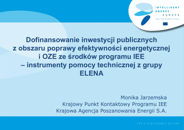 Dofinansowanie inwestycji publicznych z obszaru poprawy efektywności energetycznej i OZE ze środków programu IEE – instrumenty pomocy technicznej z grupy ELENA Monika Jarzemska Krajowy Punkt Kontaktowy Programu IEE Krajowa Agencja Poszanowania Energii S.A. FUNDUSZ ELENA – środki na pomoc techniczną na przygotowanie programów inwestycyjnych przez jednostki publiczne Zużycie energii w miastach > Obszary miejskie generują około 70% całkowitego zapotrzebowania na energię pierwotną w UE > Według scenariuszy International Energy Agency zużycie energii w miastach ma w przyszłości dwukrotnie przekroczy średnie wskaźniki zużycia w UE > Zużycie gazu, energii elektrycznej i ciepła w miastach przekracza średnią UE > Wykorzystanie OŹE w miastach jest zbyt małe w stosunku do potencjału Instrumenty finansowe w IEE >Już funkcjonujące: > EIB-ELENA (stara ELENA) – > w ramach kontraktu pomiędzy Europejskim Bankiem Inwestycyjnym a Komisją Europejską > nabór wniosków w trybie ciągłym zgodnie z wytycznymi EIB > Priorytet - „Mobilizowanie lokalnych inwestycji związanych z energią” > w ramach wezwania do składania wniosków o dofinansowanie projektów Instrumenty finansowe w IEE >W przygotowaniu: > KfW-ELENA – > w ramach kontraktu pomiędzy bankiem KfW a Komisją Europejską > nabór wniosków w trybie ciągłym zgodnie z wytycznymi, które przedstawi KfW > CEB – ELENA > W ramach kontraktu pomiędzy Bankiem Rozwoju Rady Europy a Komisją Europejską > nabór wniosków w trybie ciągłym zgodnie z wytycznymi, które przedstawi CEB Budżet na instrumenty finansowe >EIB-ELENA: > 15 mln na 2009r. (już wykorzystane); > 15 mln na 2010r. > 19 mln na 2011r. >Priorytet „Mobilizowanie inwestycji…” > 16 mln na 2011r. (łącznie na działania zintegrowane) >KfW ELENA: > 8 mln euro na 2011r. >CEB ELENA: > 3 mln euro na 2011r. Europejskie wsparcie EE i OŹE na poziomie lokalnym – najważniejsze informacje na temat instrumentu EIB-ELENA > Współpraca Komisji Europejskiej i Europejskiego Banku Inwestycyjnego celem wsparcia władz lokalnych i regionalnych w osiągnięciu celów UE 3x20 – przejście od planów do realizacji > Instrument pomocy technicznej zarządzany przez EBI, finansowany przez UE z budżetu Programu IEE (CIP) > Dofinansowanie efektywności energetycznej, lokalnych źródeł energii odnawialnej, czystego transportu miejskiego > Wymagany „efekt dźwigni” na poziomie 25 (koszt inwestycji musi wynosid co najmniej 25-krotnośd kwoty udzielonego wsparcia) > 90% poziom dofinansowania EIB-ELENA EIB - ELENA Wsparcie techniczne władz lokalnych i regionalnych: > Studia wykonalności > Dodatkowe wsparcie techniczne w postaci pracowników > Badania techniczne PROGRAMY/PROJEKTY INWESTYCYJNE Budynki prywatne i publiczne, w tym mieszkania socjalne, a także oświetlenie uliczne i światła ruchu drogowego (modernizacja budynków, sieci ciepłowniczych, integracja OZE itp.) Transport miejski (wymiana floty, inwestycje ułatwiające wprowadzenie samochodów elektrycznych, nowe rozwiązania w zakresie efektywności energetycznej usprawniające logistykę w obszarach miejskich itp.) > Przetargi > Struktura finansowa Infrastruktura lokalna, w tym inteligentne sieci oraz infrastruktura teleinformatyczna wspierająca efektywnośd energetyczną, instalacje miejskie, transportowe centra intermodalne oraz infrastruktura tankowania pojazdów napędzanych alternatywnymi paliwami. EIB ELENA - beneficjenci > Pomoc techniczna na opracowanie programu inwestycyjnego może zostad udzielona władzom lokalnym, regionalnym lub innym jednostkom publicznym z krajów uprawnionych do korzystania z programu IEE (UE+Norwegia, Lichtenstein, Chorwacja, Islandia). > Program inwestycyjny lub jego częśd może byd realizowany przez jednostki inne niż publiczne np. posiadaczy koncesji na realizację zadao jednostki publicznej, firmy oferujące usługi energetyczne (ESCO). EIB-ELENA – dwustopniowa aplikacja > Wniosek przedaplikacyjny: > Bez formularza wniosku > Zakres wymaganych informacji: > krótki opis planowanego projektu inwestycyjnego, w tym rodzaj inwestycji i podejście do realizacji projektu > oczekiwany koszt inwestycji i harmonogram realizacji projektu > koszt, zakres i główne potrzeby, które mają zostad pokryte z uzyskanej pomocy technicznej > Czas oczekiwania na odpowiedź: około 2 tygodnie > Aplikacja właściwa (po pozytywnej ocenie pomysłu) EIB-ELENA więcej informacji > Bezpośrednio w Europejskim Banku Inwestycyjnym > Faks, list lub lub e-mail na adres [email protected] > W języku angielskim lub francuskim > Informacje szczegółowe dostępne na stronie ELENA www.eib.org/elena > Czas oczekiwania na odpowiedź: około 2 tygodnie EIB ELENA – podpisane umowy >11 podpisanych kontraktów, kolejne 25 w fazie negocjacji; >szeroki zakres obszarów objętych inwestycjami: efektywnośd energetyczna, sieci ciepłownicze, ogniwa fotowoltaiczne, samochody elektryczne; >zróżnicowana wielkośd inwestycji: od 50 mln – 500 mln euro; >prognozowany wskaźnik dźwigni: od 50 – 200; Priorytet - Mobilizowanie lokalnych inwestycji związanych z energią Pomoc techniczna dla władz lokalnych przeprowadzających inwestycje w obszarze zrównoważonej energii (związanych z wdrażaniem SEAP). Pomoc ta ma ułatwid zapewnienie kredytów bankowych lub dotacji UE (np. z funduszy strukturalnych lub spójności). > Beneficjentem mogą byd instytucji publiczne z krajów członkowskich UE > Aplikant musi zobowiązad się do wypełnienia celów redukcji CO2 > Efekt dźwigni > 15 > Min. inwestycja 6mln €, w ciągu 36 miesięcy od podpisania umowy Nowe instrumenty W budżecie Programu IEE na rok 2011 pojawiły się nowe instrumenty finansujące pomoc techniczną w zakresie efektywności energetycznej i odnawialnych źródeł energii: analogiczny do instrumentu ELENA (EIB), ale dla mniejszych inwestycji tj. do 50 mln euro ELENA KfW; instrument dostarczający pomoc techniczną na opracowanie 