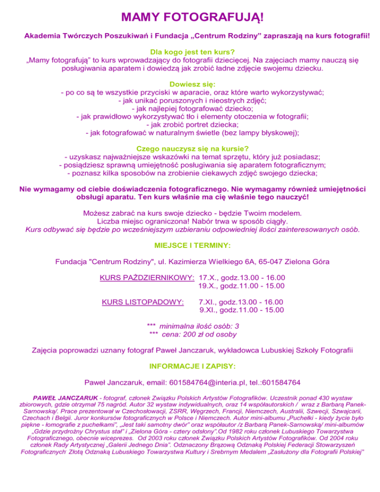 MAMY FOTOGRAFUJĄ! Akademia Twórczych Poszukiwań i Fundacja „Centrum Rodziny” zapraszają na kurs fotografii! Dla kogo jest ten kurs? „Mamy fotografują” to kurs wprowadzający do fotografii dziecięcej. Na zajęciach mamy nauczą się posługiwania aparatem i dowiedzą jak zrobić ładne zdjęcie swojemu dziecku. Dowiesz się: - po co są te wszystkie przyciski w aparacie, oraz które warto wykorzystywać; - jak unikać poruszonych i nieostrych zdjęć; - jak najlepiej fotografować dziecko; - jak prawidłowo wykorzystywać tło i elementy otoczenia w fotografii; - jak zrobić portret dziecka; - jak fotografować w naturalnym świetle (bez lampy błyskowej); Czego nauczysz się na kursie? - uzyskasz najważniejsze wskazówki na temat sprzętu, który już posiadasz; - posiądziesz sprawną umiejętność posługiwania się aparatem fotograficznym; - poznasz kilka sposobów na zrobienie ciekawych zdjęć swojego dziecka; Nie wymagamy od ciebie doświadczenia fotograficznego. Nie wymagamy również umiejętności obsługi aparatu. Ten kurs właśnie ma cię właśnie tego nauczyć! Możesz zabrać na kurs swoje dziecko - będzie Twoim modelem. Liczba miejsc ograniczona! Nabór trwa w sposób ciągły. Kurs odbywać się będzie po wcześniejszym uzbieraniu odpowiedniej ilości zainteresowanych osób. MIEJSCE I TERMINY: Fundacja "Centrum Rodziny", ul. Kazimierza Wielkiego 6A, 65-047 Zielona Góra KURS PAŻDZIERNIKOWY: 17.X., godz.13.00 - 16.00 19.X., godz.11.00 - 15.00 KURS LISTOPADOWY: 7.XI., godz.13.00 - 16.00 9.XI., godz.11.00 - 15.00 *** minimalna ilość osób: 3 *** cena: 200 zł od osoby Zajęcia poprowadzi uznany fotograf Paweł Janczaruk, wykładowca Lubuskiej Szkoły Fotografii INFORMACJE I ZAPISY: Paweł Janczaruk, email: [email protected], tel.:601584764 PAWEŁ JANCZARUK - fotograf, członek Związku Polskich Artystów Fotografików. Uczestnik ponad 430 wystaw zbiorowych, gdzie otrzymał 75 nagród. Autor 32 wystaw indywidualnych, oraz 14 współautorskich / wraz z Barbarą PanekSarnowską/. Prace prezentował w Czechosłowacji, ZSRR, Węgrzech, Francji, Niemczech, Australii, Szwecji, Szwajcarii, Czechach i Belgii. Juror konkursów fotograficznych w Polsce i Niemczech. Autor mini-albumu „Puchełki - kiedy życie było piękne - łomografie z puchełkami”, „Jest taki samotny dwór” oraz współautor /z Barbarą Panek-Sarnowską/ mini-albumów „Gdzie przydrożny Chrystus stał” i „Zielona Góra - cztery odsłony”.Od 1982 roku członek Lubuskiego Towarzystwa Fotograficznego, obecnie wiceprezes. Od 2003 roku członek Związku Polskich Artystów Fotografików. Od 2004 roku członek Rady Artystycznej „Galerii Jednego Dnia”. Odznaczony Brązową Odznaką Polskiej Federacji Stowarzyszeń , . Fotograficznych Złotą Odznaką Lubuskiego Towarzystwa Kultury i Srebrnym Medalem „Zasłużony dla Fotografii Polskiej”