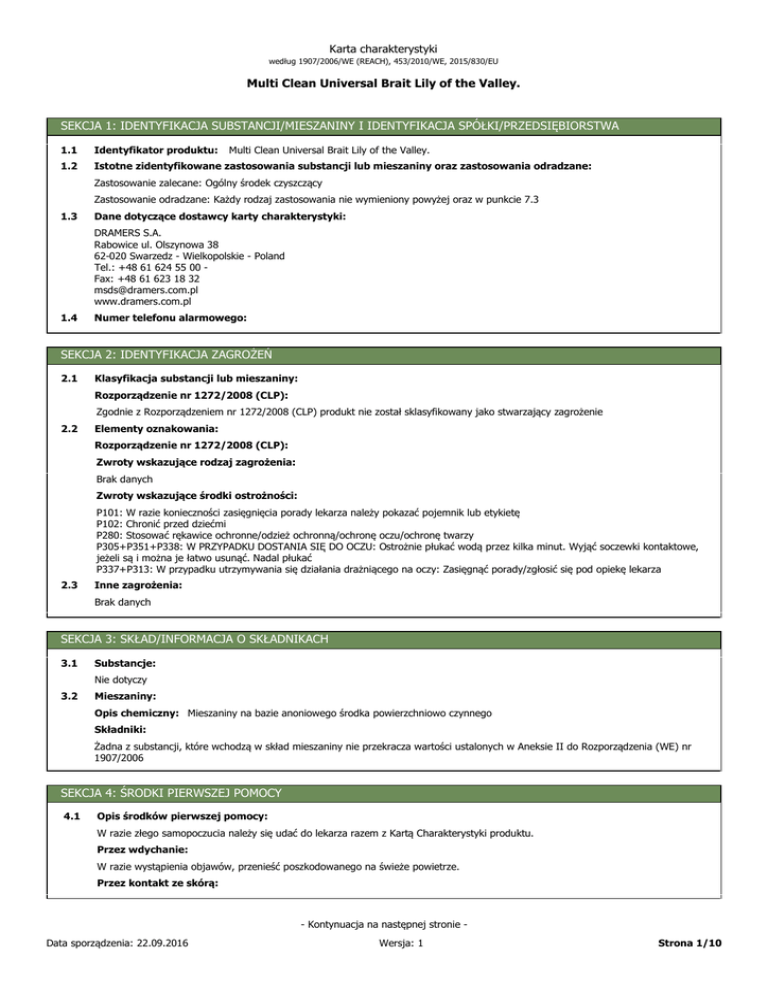 Karta charakterystyki według 1907/2006/WE (REACH), 453/2010/WE, 2015/830/EU Multi Clean Universal Brait Lily of the Valley. SEKCJA 1: IDENTYFIKACJA SUBSTANCJI/MIESZANINY I IDENTYFIKACJA SPÓŁKI/PRZEDSIĘBIORSTWA 1.1 Identyfikator produktu: 1.2 Istotne zidentyfikowane zastosowania substancji lub mieszaniny oraz zastosowania odradzane: Multi Clean Universal Brait Lily of the Valley. Zastosowanie zalecane: Ogólny środek czyszczący Zastosowanie odradzane: Każdy rodzaj zastosowania nie wymieniony powyżej oraz w punkcie 7.3 1.3 Dane dotyczące dostawcy karty charakterystyki: DRAMERS S.A. Rabowice ul. Olszynowa 38 62-020 Swarzedz - Wielkopolskie - Poland Tel.: +48 61 624 55 00 Fax: +48 61 623 18 32 [email protected] www.dramers.com.pl 1.4 Numer telefonu alarmowego: SEKCJA 2: IDENTYFIKACJA ZAGROŻEŃ 2.1 Klasyfikacja substancji lub mieszaniny: Rozporządzenie nr 1272/2008 (CLP): Zgodnie z Rozporządzeniem nr 1272/2008 (CLP) produkt nie został sklasyfikowany jako stwarzający zagrożenie 2.2 Elementy oznakowania: Rozporządzenie nr 1272/2008 (CLP): Zwroty wskazujące rodzaj zagrożenia: Brak danych Zwroty wskazujące środki ostrożności: P101: W razie konieczności zasięgnięcia porady lekarza należy pokazać pojemnik lub etykietę P102: Chronić przed dziećmi P280: Stosować rękawice ochronne/odzież ochronną/ochronę oczu/ochronę twarzy P305+P351+P338: W PRZYPADKU DOSTANIA SIĘ DO OCZU: Ostrożnie płukać wodą przez kilka minut. Wyjąć soczewki kontaktowe, jeżeli są i można je łatwo usunąć. Nadal płukać P337+P313: W przypadku utrzymywania się działania drażniącego na oczy: Zasięgnąć porady/zgłosić się pod opiekę lekarza 2.3 Inne zagrożenia: Brak danych SEKCJA 3: SKŁAD/INFORMACJA O SKŁADNIKACH 3.1 Substancje: Nie dotyczy 3.2 Mieszaniny: Opis chemiczny: Mieszaniny na bazie anoniowego środka powierzchniowo czynnego Składniki: Żadna z substancji, które wchodzą w skład mieszaniny nie przekracza wartości ustalonych w Aneksie II do Rozporządzenia (WE) nr 1907/2006 SEKCJA 4: ŚRODKI PIERWSZEJ POMOCY 4.1 Opis środków pierwszej pomocy: W razie złego samopoczucia należy się udać do lekarza razem z Kartą Charakterystyki produktu. Przez wdychanie: W razie wystąpienia objawów, przenieść poszkodowanego na świeże powietrze. Przez kontakt ze skórą: - Kontynuacja na następnej stronie Data sporządzenia: 22.09.2016 Wersja: 1 Strona 1/10 Karta charakterystyki według 1907/2006/WE (REACH), 453/2010/WE, 2015/830/EU Multi Clean Universal Brait Lily of the Valley. SEKCJA 4: ŚRODKI PIERWSZEJ POMOCY (Ciąg dalszy) W razie kontaktu ze skórą zaleca się oczyścić narażone miejsce bieżącą wodą i mydłem neutralnym. W razie zmian skórnych (piekący ból, zaczerwienienie, wysypka, pęcherze), należy udać się do lekarza z Kartą Charakterystyki produktu. Przez kontakt z oczami: Przepłukać wodą aż do usunięcia produktu. W razie dokuczliwości, udać się do lekarza z Kartą Charakterystyki produktu. Przez połknięcie / aspirację: W razie połknięcia większych ilości, zaleca się wezwać pomoc lekarską. 4.2 Najważniejsze ostre i opóźnione objawy oraz skutki narażenia: Ostre i opóźnione skutki narażenia podano w sekcji 2 i 11 4.3 Wskazania dotyczące wszelkiej natychmiastowej pomocy lekarskiej i szczególnego postępowania z poszkodowanym: Brak danych SEKCJA 5: POSTĘPOWANIE W PRZYPADKU POŻARU 5.1 Środki gaśnicze: 5.2 Produkt niepalny, dzięki swoim właściwościom w normalnych warunkach postępowania, magazynowania i użytkowania nie stwarza zagrożenia pożarem. W razie zapalenia się produktu na skutek niewłaściwego postępowania, magazynowania lub użytkowania można zastosować jakikolwiek rodzaj gaśnic (proszek ABC, woda) Szczególne zagrożenia związane z substancją lub mieszaniną: 5.3 Ze względu na stopień łatwopalności, produkt nie stanowi zagrożenia dla pożaru w normalnych warunkach przechowywania, postępowania i użytkowania. Informacje dla straży pożarnej: W zależności od rozmiarów pożaru może się okazać konieczne zastosowanie kompletnej odzieży ochronnej i autonomicznego sprzętu do oddychania. Należy mieć do dyspozycji minimalny zasób urządzeń awaryjnych i środków działania (koce przeciwpożarowe, podręczna apteczka) zgodnie z Dyrektywą 89/654/EC. Dodatkowe postanowienia: Działać zgodnie z Wewnętrznym Planem Awaryjnym i ulotkami informacyjnymi opisującymi postępowanie w razie wypadków i innych sytuacji awaryjnych. Unieszkodliwić wszystkie źródła zapłonu. W razie pożaru, schłodzić naczynia i zbiorniki służące do przechowywania produktów podatnych na zapalenie, wybuch lub wybuch BLEVE na skutek wysokich temperatur. Nie dopuścić, aby produkty wykorzystane do gaszenia pożaru dostały się do zbiornika z wodą. SEKCJA 6: POSTĘPOWANIE W PRZYPADKU NIEZAMIERZONEGO UWOLNIENIA DO ŚRODOWISKA 6.1 Indywidualne środki ostrożności, sprzęt ochronny i procedury w sytuacjach awaryjnych: Odizolować miejsca ulatniania się gazów, o ile czynność ta nie stanowi zagrożenia dla osób, które ją wykonują. 6.2 Środki ostrożności w zakresie ochrony środowiska: 6.3 Produkt nie został sklasyfikowany jako niebezpieczny. Nie dopuścić do skażenia wód gruntowych i powierzchniowych, cieków wodnych, gleby, kanalizacji. Metody i materiały zapobiegające rozprzestrzenianiu się skażenia i służące do usuwania skażenia: Zaleca się: 6.4 Odniesienia do innych sekcji: Patrz również p.8 i 13. SEKCJA 7: POSTĘPOWANIE Z SUBSTANCJAMI I MIESZANINAMI ORAZ ICH MAGAZYNOWANIE 7.1 Środki ostrożności dotyczące bezpiecznego postępowania: A.- Środki ostrożności niezbędne dla bezpiecznego obchodzenia się z produktem W kwestii zapobiegania zagrożeniom w miejscu pracy należy postępować zgodnie z obowiązującym prawem. Przechowywać naczynia szczelnie zamknięte. Kontrolować wycieki i odpady, usuwając je bezpiecznymi metodami (sekcja 6). Nie dopuścić do samoistnego wyciek