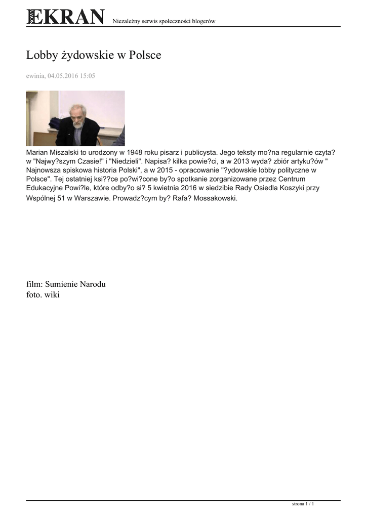 Niezależny serwis społeczności blogerów Lobby żydowskie w Polsce ewinia, 04.05.2016 15:05 Marian Miszalski to urodzony w 1948 roku pisarz i publicysta. Jego teksty mo?na regularnie czyta? w "Najwy?szym Czasie!" i "Niedzieli". Napisa? kilka powie?ci, a w 2013 wyda? zbiór artyku?ów " Najnowsza spiskowa historia Polski", a w 2015 - opracowanie "?ydowskie lobby polityczne w Polsce". Tej ostatniej ksi??ce po?wi?cone by?o spotkanie zorganizowane przez Centrum Edukacyjne Powi?le, które odby?o si? 5 kwietnia 2016 w siedzibie Rady Osiedla Koszyki przy Wspólnej 51 w Warszawie. Prowadz?cym by? Rafa? Mossakowski. film: Sumienie Narodu foto. wiki strona 1 / 1 Powered by TCPDF (www.tcpdf.org)