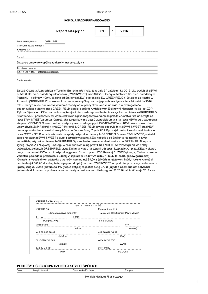 KREZUS SA RB 61 2016 KOMISJA NADZORU FINANSOWEGO Raport bie żący nr 61 / 2016 2016-10-28 Data sporządzenia: Skrócona nazwa emitenta KREZUS SA Temat Zawarcie umowy o wspólną realizację przedsięwzięcia Podstawa prawna Art. 17 ust. 1 MAR - informacje poufne. Treść raportu: Zarząd Krezus S.A. z siedzibą w Toruniu (Emitent) informuje, że w dniu 27 października 2016 roku podpisał z EWM INWEST Sp. z o.o. z siedzibą w Poznaniu (EWM INWEST) oraz KREZUS Energia Wiatrowa Sp. z o.o. z siedzibą w Poznaniu – spółka w 100 % zależna od Emitenta (KEW) przy udziale EW GREENFIELD 5 Sp. z o.o. z siedzibą w Poznaniu (GREENFIELD) aneks nr 1 do umowy o wspólną realizację przedsięwzięcia z dnia 30 kwietnia 2016 roku. Strony aneksu postanowiły zmienić zasady współpracy określone w umowie, a w szczególności postanowiono o zbyciu przez GREENFIELD drugiej spośród wydzielonych Elektrowni Moszczenica (to jest ZCP Rękoraj 3) na rzecz KEW oraz w dalszej kolejności sprzedaży przez Emitenta wszystkich udziałów w GREENFIELD. Strony aneksu postanowiły, że jedna elektrownia jako zorganizowana część przedsiębiorstwa zostanie zbyta na rzecz EWM INWEST, a druga również jako zorganizowana część przedsiębiorstwa na rzecz KEW w celu zwolnienia się przez GRENFIELD z roszczeń o zwrot pożyczek przysługujących EWM INWEST oraz KEW. Wraz z zawarciem umów zbycia ZCP Rękoraj 4 oraz ZCP Rękoraj 3, GREENFIELD zawrze odpowiednio z EWM INWEST oraz KEW umowy przeniesienia praw i obowiązków z umów dzierżawy. Zbycie ZCP Rękoraj 4 nastąpi w celu zwolnienia się przez GREENFIELD ze zobowiązania do spłaty pożyczek udzielonych GREENFIELD przez EWM INWEST, wskutek czego roszczenia EWM INWEST o zwrot pożyczek wygasną. KEW nabędzie od Emitenta roszczenie o zwrot wszystkich pożyczek udzielonych GREENFIELD przez Emitenta wraz z odsetkami, na co GREENFIELD wyraża zgodę. Zbycie ZCP Rękoraj 3 nastąpi w celu zwolnienia się przez GREENFIELD ze zobowiązania do spłaty pożyczek udzielonych GREENFIELD przez Emitenta wraz z należnymi odsetkami, z przejętych przez KEW, wskutek czego roszczenia KEW o zwrot pożyczek wygasną. Przed zbyciem ZCP Rękoraj 3 i ZCP Rękoraj 4, Emitent sprzeda wszystkie posiadane przez siebie udziały w kapitale zakładowym GREENFIELD to jest 90 (dziewięćdziesiąt) równych i niepodzielnych udziałów o wartości nominalnej 50,00 zł (pięćdziesiąt złotych) każdy i łącznej wartości nominalnej 4.500,00 zł (cztery tysiące pięćset złotych) na rzecz EWM INWEST lub podmiot przez niego wskazany za łączną cenę 33 300 zł (trzydzieści trzy tysiące złotych), to jest za cenę 370 zł (trzysta siedemdziesiąt złotych) za jeden udział. Informacja podawana jest w nawiązaniu do raportu bieżącego nr 27/2016 z dnia 01 maja 2016 roku. KREZUS Spółka Akcyjna (pełna nazwa emi tenta) KREZUS SA Finanse inne (fin) (skrócona nazwa emitenta) 87-100 (sektor wg. klasyfikacji GPW w W-wie) Toruń (kod pocztowy) (miejscowość ) Włocławska 187 (ulic a) (numer) +48 56 656 26 62 +48 56 656 26 28 (tel efon) (fax) [email protected] www.krezus.com (e-mail) (www) 526-10-32-881 011154542 (NIP) (REGON) PODPISY OSÓB REPREZENTUJĄCYCH SPÓŁKĘ Data Imię i Nazwisko Stanowisko/Funkcja Podpis Komisja Nadzoru Finansowego 1 KREZUS SA 2016-10-28 RB 61 2016 Jacek Ptaszek Prezes Zarządu Komisja Nadzoru Finansowego 2