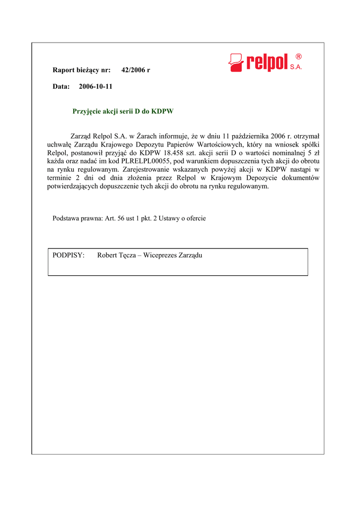 Raport bieżący nr: Data: 42/2006 r 2006-10-11 Przyjęcie akcji serii D do KDPW Zarząd Relpol S.A. w Żarach informuje, że w dniu 11 października 2006 r. otrzymał uchwałę Zarządu Krajowego Depozytu Papierów Wartościowych, który na wniosek spółki Relpol, postanowił przyjąć do KDPW 18.458 szt. akcji serii D o wartości nominalnej 5 zł każda oraz nadać im kod PLRELPL00055, pod warunkiem dopuszczenia tych akcji do obrotu na rynku regulowanym. Zarejestrowanie wskazanych powyżej akcji w KDPW nastąpi w terminie 2 dni od dnia złożenia przez Relpol w Krajowym Depozycie dokumentów potwierdzających dopuszczenie tych akcji do obrotu na rynku regulowanym. Podstawa prawna: Art. 56 ust 1 pkt. 2 Ustawy o ofercie PODPISY: Robert Tęcza – Wiceprezes Zarządu