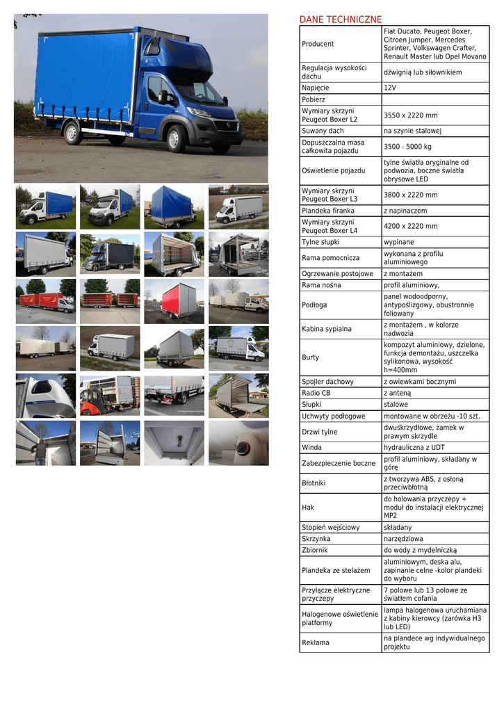 DANE TECHNICZNE Producent Fiat Ducato, Peugeot Boxer, Citroen Jumper, Mercedes Sprinter, Volkswagen Crafter, Renault Master lub Opel Movano Regulacja wysokości dachu dźwignią lub siłownikiem Napięcie 12V Pobierz Wymiary skrzyni Peugeot Boxer L2 3550 x 2220 mm Suwany dach na szynie stalowej Dopuszczalna masa całkowita pojazdu 3500 - 5000 kg Oświetlenie pojazdu tylne światła oryginalne od podwozia, boczne światła obrysowe LED Wymiary skrzyni Peugeot Boxer L3 3800 x 2220 mm Plandeka firanka z napinaczem Wymiary skrzyni Peugeot Boxer L4 4200 x 2220 mm Tylne słupki wypinane Rama pomocnicza wykonana z profilu aluminiowego Ogrzewanie postojowe z montażem Rama nośna profil aluminiowy, Podłoga panel wodoodporny, antypoślizgowy, obustronnie foliowany Kabina sypialna z montażem , w kolorze nadwozia Burty kompozyt aluminiowy, dzielone, funkcja demontażu, uszczelka sylikonowa, wysokość h=400mm Spojler dachowy z owiewkami bocznymi Radio CB z anteną Słupki stalowe Uchwyty podłogowe montowane w obrzeżu -10 szt. Drzwi tylne dwuskrzydłowe, zamek w prawym skrzydle Winda hydrauliczna z UDT Zabezpieczenie boczne profil aluminiowy, składany w górę Błotniki z tworzywa ABS, z osłoną przeciwbłotną Hak do holowania przyczepy + moduł do instalacji elektrycznej MP2 Stopień wejściowy składany Skrzynka narzędziowa Zbiornik do wody z mydelniczką Plandeka ze stelażem aluminiowym, deska alu, zapinanie celne -kolor plandeki do wyboru Przyłącze elektryczne przyczepy 7 polowe lub 13 polowe ze światłem cofania lampa halogenowa uruchamiana Halogenowe oświetlenie z kabiny kierowcy (żarówka H3 platformy lub LED) Reklama na plandece wg indywidualnego projektu