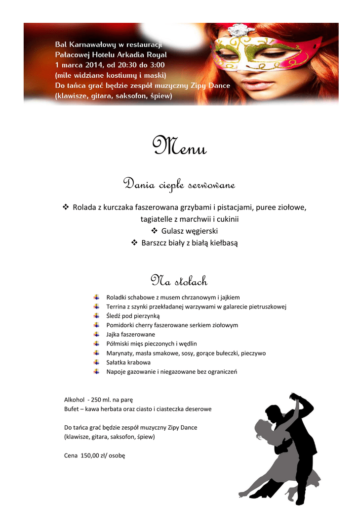 Menu Dania ciepłe serwowane Rolada z kurczaka faszerowana grzybami i pistacjami, puree ziołowe, tagiatelle z marchwii i cukinii Gulasz węgierski Barszcz biały z białą kiełbasą Na stołach Roladki schabowe z musem chrzanowym i jajkiem Terrina z szynki przekładanej warzywami w galarecie pietruszkowej Śledź pod pierzynką Pomidorki cherry faszerowane serkiem ziołowym Jajka faszerowane Półmiski mięs pieczonych i wędlin Marynaty, masła smakowe, sosy, gorące bułeczki, pieczywo Sałatka krabowa Napoje gazowanie i niegazowane bez ograniczeń Alkohol - 250 ml. na parę Bufet – kawa herbata oraz ciasto i ciasteczka deserowe Do tańca grać będzie zespół muzyczny Zipy Dance (klawisze, gitara, saksofon, śpiew) Cena 150,00 zł/ osobę