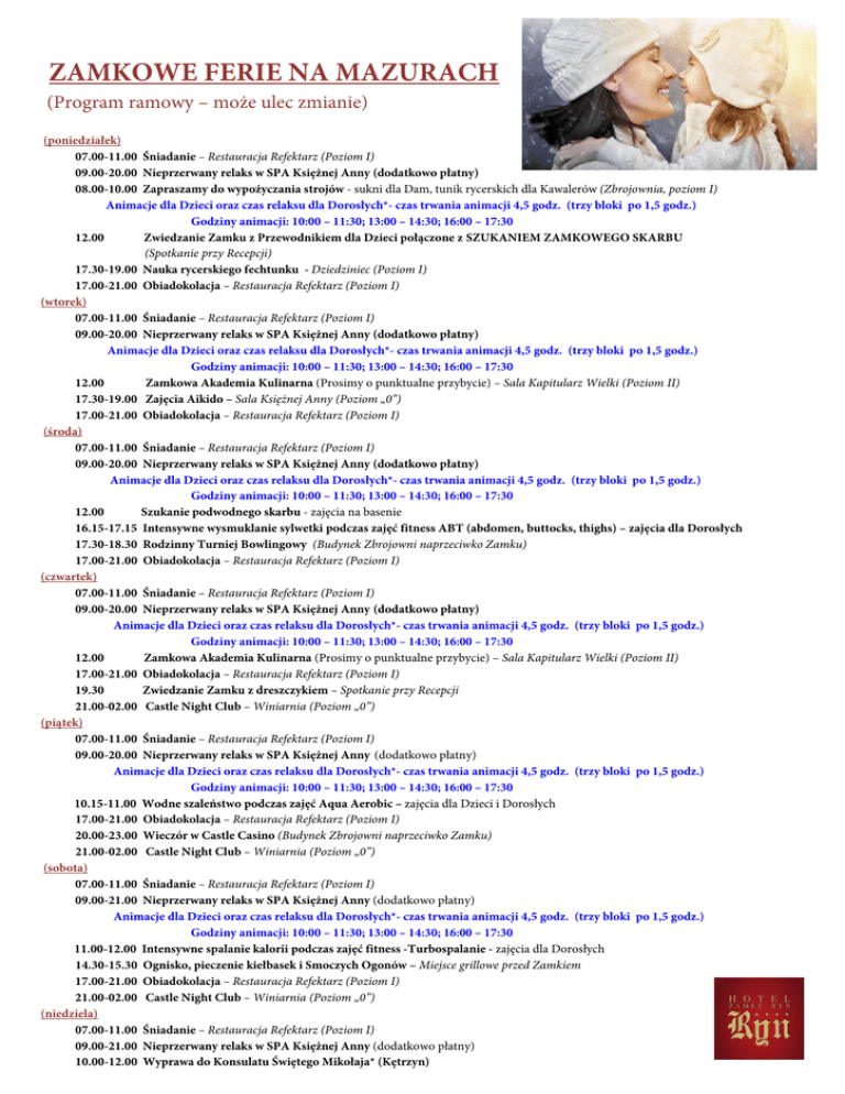 ZAMKOWE FERIE NA MAZURACH (Program ramowy – może ulec zmianie) (poniedziałek) 07.00-11.00 Śniadanie – Restauracja Refektarz (Poziom I) 09.00-20.00 Nieprzerwany relaks w SPA Księżnej Anny (dodatkowo płatny) 08.00-10.00 Zapraszamy do wypożyczania strojów - sukni dla Dam, tunik rycerskich dla Kawalerów (Zbrojownia, poziom I) Animacje dla Dzieci oraz czas relaksu dla Dorosłych*- czas trwania animacji 4,5 godz. (trzy bloki po 1,5 godz.) Godziny animacji: 10:00 – 11:30; 13:00 – 14:30; 16:00 – 17:30 12.00 Zwiedzanie Zamku z Przewodnikiem dla Dzieci połączone z SZUKANIEM ZAMKOWEGO SKARBU (Spotkanie przy Recepcji) 17.30-19.00 Nauka rycerskiego fechtunku - Dziedziniec (Poziom I) 17.00-21.00 Obiadokolacja – Restauracja Refektarz (Poziom I) (wtorek) 07.00-11.00 Śniadanie – Restauracja Refektarz (Poziom I) 09.00-20.00 Nieprzerwany relaks w SPA Księżnej Anny (dodatkowo płatny) Animacje dla Dzieci oraz czas relaksu dla Dorosłych*- czas trwania animacji 4,5 godz. (trzy bloki po 1,5 godz.) Godziny animacji: 10:00 – 11:30; 13:00 – 14:30; 16:00 – 17:30 12.00 Zamkowa Akademia Kulinarna (Prosimy o punktualne przybycie) – Sala Kapitularz Wielki (Poziom II) 17.30-19.00 Zajęcia Aikido – Sala Księżnej Anny (Poziom „0”) 17.00-21.00 Obiadokolacja – Restauracja Refektarz (Poziom I) (środa) 07.00-11.00 Śniadanie – Restauracja Refektarz (Poziom I) 09.00-20.00 Nieprzerwany relaks w SPA Księżnej Anny (dodatkowo płatny) Animacje dla Dzieci oraz czas relaksu dla Dorosłych*- czas trwania animacji 4,5 godz. (trzy bloki po 1,5 godz.) Godziny animacji: 10:00 – 11:30; 13:00 – 14:30; 16:00 – 17:30 12.00 Szukanie podwodnego skarbu - zajęcia na basenie 16.15-17.15 Intensywne wysmuklanie sylwetki podczas zajęć fitness ABT (abdomen, buttocks, thighs) – zajęcia dla Dorosłych 17.30-18.30 Rodzinny Turniej Bowlingowy (Budynek Zbrojowni naprzeciwko Zamku) 17.00-21.00 Obiadokolacja – Restauracja Refektarz (Poziom I) (czwartek) 07.00-11.00 Śniadanie – Restauracja Refektarz (Poziom I) 09.00-20.00 Nieprzerwany relaks w SPA Księżnej Anny (dodatkowo płatny) Animacje dla Dzieci oraz czas relaksu dla Dorosłych*- czas trwania animacji 4,5 godz. (trzy bloki po 1,5 godz.) Godziny animacji: 10:00 – 11:30; 13:00 – 14:30; 16:00 – 17:30 12.00 Zamkowa Akademia Kulinarna (Prosimy o punktualne przybycie) – Sala Kapitularz Wielki (Poziom II) 17.00-21.00 Obiadokolacja – Restauracja Refektarz (Poziom I) 19.30 Zwiedzanie Zamku z dreszczykiem – Spotkanie przy Recepcji 21.00-02.00 Castle Night Club – Winiarnia (Poziom „0”) (piątek) 07.00-11.00 Śniadanie – Restauracja Refektarz (Poziom I) 09.00-20.00 Nieprzerwany relaks w SPA Księżnej Anny (dodatkowo płatny) Animacje dla Dzieci oraz czas relaksu dla Dorosłych*- czas trwania animacji 4,5 godz. (trzy bloki po 1,5 godz.) Godziny animacji: 10:00 – 11:30; 13:00 – 14:30; 16:00 – 17:30 10.15-11.00 Wodne szaleństwo podczas zajęć Aqua Aerobic – zajęcia dla Dzieci i Dorosłych 17.00-21.00 Obiadokolacja – Restauracja Refektarz (Poziom I) 20.00-23.00 Wieczór w Castle Casino (Budynek Zbrojowni naprzeciwko Zamku) 21.00-02.00 Castle Night Club – Winiarnia (Poziom „0”) (sobota) 07.00-11.00 Śniadanie – Restauracja Refektarz (Poziom I) 09.00-21.00 Nieprzerwany relaks w SPA Księżnej Anny (dodatkowo płatny) Animacje dla Dzieci oraz czas relaksu dla Dorosłych*- czas trwania animacji 4,5 godz. (trzy bloki po 1,5 godz.) Godziny animacji: 10:00 – 11:30; 13:00 – 14:30; 16:00 – 17:30 11.00-12.00 Intensywne spalanie kalorii podczas zajęć fitness -Turbospalanie - zajęcia dla Dorosłych 14.30-15.30 Ognisko, pieczenie kiełbasek i Smoczych Ogonów – Miejsce grillowe przed Zamkiem 17.00-21.00 Obiadokolacja – Restauracja Refektarz (Poziom I) 21.00-02.00 Castle Night Club – Winiarnia (Poziom „0”) (niedziela) 07.00-11.00 Śniadanie – Restauracja Refektarz (Poziom I) 09.00-21.00 Nieprzerwany relaks w SPA Księżnej Anny (dodatkowo płatny) 10.00-12.00 Wyprawa do Konsulatu Świętego Mikołaja* (Kętrzyn) 13.00-15.00 Zajęcia Decoupage – Sala Księżnej Anny (Poziom „0”) 16.00-18.00 Xbox i gry planszowe - zajęcia w Klubie Malucha dla Małych i Dużych 17.00-21.00 Obiadokolacja – Restauracja Refektarz (Poziom I) Uwaga : miejsce realizacji zajęć może ulec zmianie UPRZEJMIE INFORMUJEMY, IŻ DOBA HOTELOWA ROZPOCZYNA SIĘ O GODZ. 16.00. NAUKA GRY W GOLFA – godziny i dni do ustalenia w Hotelu ZAMEK RYN**** podczas pobytu . (Uwaga! Ilość miejsc ograniczona – 1 godz. - max 2 Osoby ) - kontakt Tel. 660 411 670. * Atrakcja płatna dodatkowo dla chętnych - KONSULAT ŚWIĘTEGO MIKOŁAJA – Kętrzyn tel. 664-205-225, dojazd własny USŁUGI DODATKOWE BEZPŁATNE DLA GOŚCI HOTELU ZAMEK RYN**** * KLUB MALUCHA – działa przez całe ferie ; do dyspozycji zabawki, materiały papiernicze, farby, kredki, wycinanki, gry planszowe * Plac zabaw dla dzieci (u stóp Zamku, obok kortu tenisowego) * Korzystanie z Sali Fitness i stołu do tenisa w Zbrojowni (codziennie w godzinach 07.00 - 23.00) * Korzystanie z basenu i saun (codziennie w godzinach 8.00-22.00) * Wypożyczalnia sprzętu wędkarskiego, kijów do Nordic Walking (codziennie w godzinach 8.00-22.00 - rezerwacja recepcja Basenu tel. 805) USŁUGI PŁATNE SPA KSIĘŻNEJ ANNY – gabinety czynne: poniedziałek – czwartek w godzinach 9.00 - 20.00, piątek – niedziela w godzinach 09.00-21.00 (rezerwacja – tel. 862) ZBROJOWNIA: Kręgielnia, bilard czynne: poniedziałek-piątek od godziny 17.00 po wcześniejszej rezerwacji (recepcja – tel. 9 , restauracja– tel. 818) sobota-niedziela w godz. 15.00-23.00 (rezerwacja – tel. 803) INDYWIDUALNA OPIEKA DO DZIECI W CZASIE POBYTU zapisy przyjmuje Recepcja Basenu (tel. 805) ATRAKCJE W POBLIŻU ZAMKU (PŁATNE DODATKOWO) STOK NARCIARSKI ORAZ WYCIĄG W MIKOŁAJKACH(15 km od Hotelu ZAMEK RYN****) Czynny codziennie : w godz. 08.00-22.00 Koszty: Komplet narciarski lub komplet snowboardowy – 35 zł/b