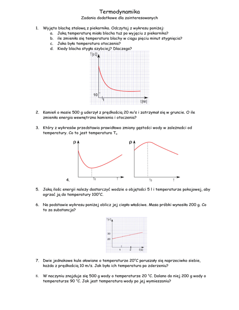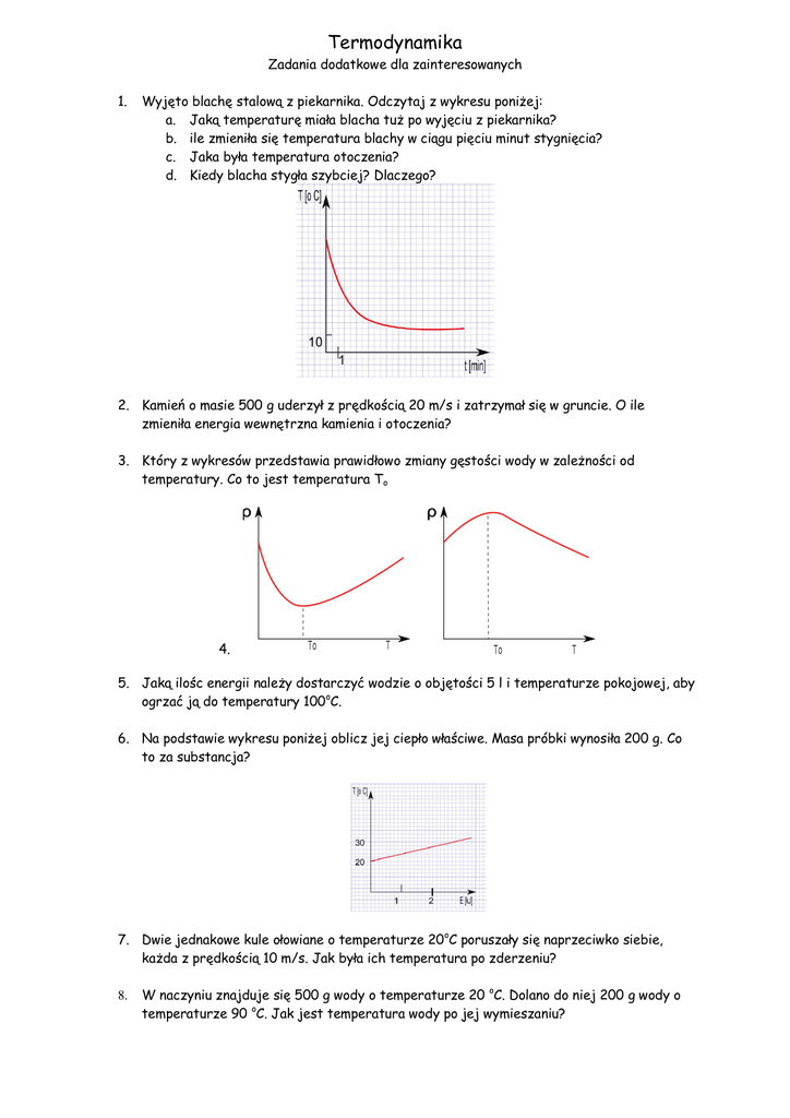 Termodynamika Zadania dodatkowe dla zainteresowanych 1. Wyjęto blachę stalową z piekarnika. Odczytaj z wykresu poniżej: a. Jaką temperaturę miała blacha tuż po wyjęciu z piekarnika? b. ile zmieniła się temperatura blachy w ciągu pięciu minut stygnięcia? c. Jaka była temperatura otoczenia? d. Kiedy blacha stygła szybciej? Dlaczego? 2. Kamień o masie 500 g uderzył z prędkością 20 m/s i zatrzymał się w gruncie. O ile zmieniła energia wewnętrzna kamienia i otoczenia? 3. Który z wykresów przedstawia prawidłowo zmiany gęstości wody w zależności od temperatury. Co to jest temperatura To 4. 5. Jaką ilośc energii należy dostarczyć wodzie o objętości 5 l i temperaturze pokojowej, aby ogrzać ją do temperatury 100oC. 6. Na podstawie wykresu poniżej oblicz jej ciepło właściwe. Masa próbki wynosiła 200 g. Co to za substancja? 7. Dwie jednakowe kule ołowiane o temperaturze 20oC poruszały się naprzeciwko siebie, każda z prędkością 10 m/s. Jak była ich temperatura po zderzeniu? 8. W naczyniu znajduje się 500 g wody o temperaturze 20 oC. Dolano do niej 200 g wody o temperaturze 90 oC. Jak jest temperatura wody po jej wymieszaniu? 9. W naczyniu znajduje się gliceryna o temperaturze 10 oC. Do naczynia dolano 0,4 kg gliceryny o temperaturze 150 oC. Po pewnym czasie temperatura ustaliła się na poziome 100 oC. Jaka była masa gliceryny na początku w naczyniu? 10. Ile trzeba energii do stopienia 2 kg żelaza? 11. Ile srebra można stopić dostarczając 200 kJ energii? 12. Do pokoju o powierzchni 20 m2 i wysokości 2,5 m wstawiono miednicę z kilogramową bryłą lodu o temperaturze 0 oC. O ile ochłodziło się powietrze w pokoju na skutek topnienia lodu. Zbiór zadań z fizyki dla gimnazjum Nowa Era