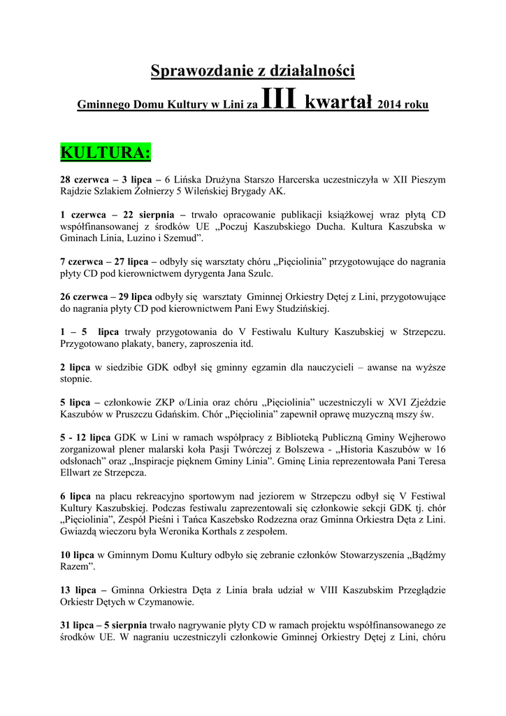 Sprawozdanie z działalności Gminnego Domu Kultury w Lini za III kwartał 2014 roku KULTURA: 28 czerwca – 3 lipca – 6 Lińska Drużyna Starszo Harcerska uczestniczyła w XII Pieszym Rajdzie Szlakiem Żołnierzy 5 Wileńskiej Brygady AK. 1 czerwca – 22 sierpnia – trwało opracowanie publikacji książkowej wraz płytą CD współfinansowanej z środków UE „Poczuj Kaszubskiego Ducha. Kultura Kaszubska w Gminach Linia, Luzino i Szemud”. 7 czerwca – 27 lipca – odbyły się warsztaty chóru „Pięciolinia” przygotowujące do nagrania płyty CD pod kierownictwem dyrygenta Jana Szulc. 26 czerwca – 29 lipca odbyły się warsztaty Gminnej Orkiestry Dętej z Lini, przygotowujące do nagrania płyty CD pod kierownictwem Pani Ewy Studzińskiej. 1 – 5 lipca trwały przygotowania do V Festiwalu Kultury Kaszubskiej w Strzepczu. Przygotowano plakaty, banery, zaproszenia itd. 2 lipca w siedzibie GDK odbył się gminny egzamin dla nauczycieli – awanse na wyższe stopnie. 5 lipca – członkowie ZKP o/Linia oraz chóru „Pięciolinia” uczestniczyli w XVI Zjeździe Kaszubów w Pruszczu Gdańskim. Chór „Pięciolinia” zapewnił oprawę muzyczną mszy św. 5 - 12 lipca GDK w Lini w ramach współpracy z Biblioteką Publiczną Gminy Wejherowo zorganizował plener malarski koła Pasji Twórczej z Bolszewa - „Historia Kaszubów w 16 odsłonach” oraz „Inspiracje pięknem Gminy Linia”. Gminę Linia reprezentowała Pani Teresa Ellwart ze Strzepcza. 6 lipca na placu rekreacyjno sportowym nad jeziorem w Strzepczu odbył się V Festiwal Kultury Kaszubskiej. Podczas festiwalu zaprezentowali się członkowie sekcji GDK tj. chór „Pięciolinia”, Zespół Pieśni i Tańca Kaszebsko Rodzezna oraz Gminna Orkiestra Dęta z Lini. Gwiazdą wieczoru była Weronika Korthals z zespołem. 10 lipca w Gminnym Domu Kultury odbyło się zebranie członków Stowarzyszenia „Bądźmy Razem”. 13 lipca – Gminna Orkiestra Dęta z Linia brała udział w VIII Kaszubskim Przeglądzie Orkiestr Dętych w Czymanowie. 31 lipca – 5 sierpnia trwało nagrywanie płyty CD w ramach projektu współfinansowanego ze środków UE. W nagraniu uczestniczyli członkowie Gminnej Orkiestry Dętej z Lini, chóru „Pięciolinia”, chóru „Lutnia” z Luzina oraz Kaszubskiego Zespołu Regionalnego „Koleczkowianie” z Szemuda. 20 lipca orkiestra dęta brała udział w pieszej pielgrzymce do Sianowa zabezpieczając oprawę muzyczną. 23 lipca GDK zorganizował spotkanie robocze z sołtysami oraz współorganizatorami dożynek powiatowo – gminnych w Strzepczu. 24 lipca członkowie OSP Linia brali udział w mszy św. strażackiej w Sianowie. 24 – 25 lipca przygotowano zaproszenia i listy intencyjne do sponsorów na organizację dorocznych dożynek powiatowo – gminnych. 26 lipca – członkowie ZKP o/ Linia brali udział w obchodach Dni Jakubowych. Chór „Pięciolinia” zapewnił oprawę muzyczną mszy św. 1 – 31 sierpnia - trwały przygotowania do uroczystych obchodów wybuchu II Wojny Światowej. Obchody zostały współfinansowane ze środków UE. Zakupiono nowe instrumenty dla członków Gminnej Orkiestry Dętej oraz nagrody dla uczestników konkursu historycznego. Przygotowano plakaty, zaproszenia oraz dyplomy. 3 sierpnia – GDK współorganizował zabawę wodną dla dzieci. Druhowie OSP Linia przygotowali kurtynę wodną na placu ks. Bazylego Oleckiego. 10 sierpnia – GDK oraz ZKP o/Linia zorganizowały wyjazd dla mieszkańców gm. Linia do Łeby. 14 – 17 sierpnia – Gminna Orkiestra Dęta promowała gminę Linia na wyjeździe w Toruniu. 24 sierpnia – ZKP o/Linia wspólnie z GDK zorganizowali wyjazd dla mieszkańców gminy Linia do Kluk. 28 sierpnia – Edmund Szymikowski i Paulina Bigus uczestniczyli w uroczystościach 30-lecia Zespołu Haftu Kaszubskiego „Złotnica” z Tucholi. 31 sierpnia – Gminna Orkiestra Dęta z Lini brała udział w III Ogólnopolskim Przeglądzie Orkiestr Dętych w Lęborku. 1 września GDK zakupił wiązanki kwiatów i znicze, które zapalono w rocznicę wybuchu II Wojny Światowej w miejscach upamiętniający Marsz Śmierci w Lini, Strzepczu i Kętrzynie oraz na cmentarzu w Nawczu. 1 września – GDK wraz z ZS Strzepcz zorganizowali uroczyste obchody wybuchu Ii Wojny Światowej. W ramach obchodów przeprowadzono konkurs historyczny. Na uroczystość zaproszono wszystkich mieszkańców gm. Linia a w szczególności emerytów i kombatantów. 2 – 13 września trwały przygotowania do dożynek powiatowo – gminnych w Strzepczu. 6 września - przygotowanie i organizacja posiłku i poczęstunku dla 300 osobowej grupy pielgrzymów z Lęborka do Sianowa. 5 - 7 września – Zespół Pieśni i Tańca Kaszebsko Rodzezna brał udział w Dniu Rodziny w Toruniu. Oprócz wyjazdu turystycznego młodzi artyści wystąpili na scenie przed ok. 1000 widownią. 14 września nad jeziorem w Strzepczu odbyły się dożynki powiatowo – gminne. W których uczestniczyło łącznie ok. 2000 osób z terenu pow. wejherowskiego. Podczas dożynek odbył się również piknik potraw tradycyjnych. Goście mieli możliwość degustacji tradycyjnych dań kaszubskich. 19 - 22 września - przygotowanie ekspozycji obrazów powstałych podczas II pleneru malarskiego w Lini 23 września – w Gminnym Domu Kultury w Lini odbyło się otwarcie wystawy poplenerowej „Historia Kaszubów w 16 odsłonach” oraz „Inspiracje pięknem Gminy Linia”. Podczas uroczystości wystąpił chór „Pięciolinia” z utworami, które zostały nagrane na płycie CD w sierpniu 2014 r. 27 września – GDK, UG oraz ZKP o/Linia zorganizowali wyjazd autokarowy dla mieszkańców gminy Linia na jesienne targi ogrodnicze w Strzelinie. 27 września w kościele pw. Marii Magdaleny w Strzepczu odbył się koncert Macieja Miecznikowskiego. 28 września – chór „Pięciolinia” występował podczas Dni Kultury Powiatu Wejherowskiego w Kębłowie. 30 września – w GDK odbyło się podsumowanie konkursu pla