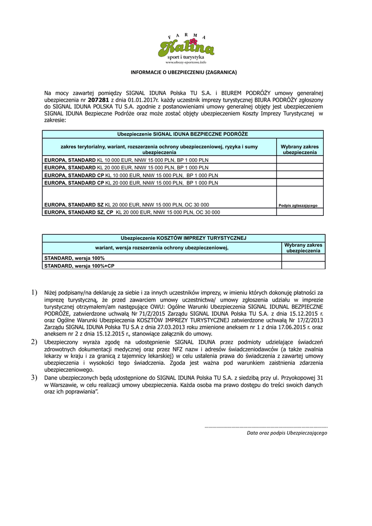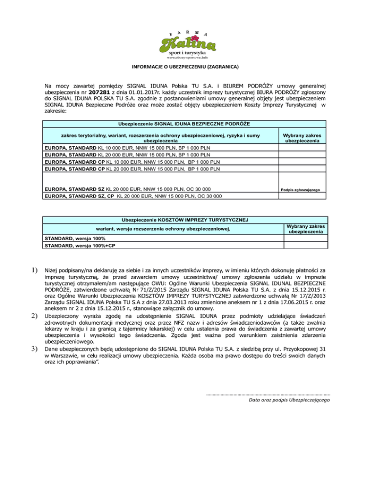 INFORMACJE O UBEZPIECZENIU (ZAGRANICA) Na mocy zawartej pomiędzy SIGNAL IDUNA Polska TU S.A. i BIUREM PODRÓŻY umowy generalnej ubezpieczenia nr 207281 z dnia 01.01.2017r. każdy uczestnik imprezy turystycznej BIURA PODRÓŻY zgłoszony do SIGNAL IDUNA POLSKA TU S.A. zgodnie z postanowieniami umowy generalnej objęty jest ubezpieczeniem SIGNAL IDUNA Bezpieczne Podróże oraz może zostać objęty ubezpieczeniem Koszty Imprezy Turystycznej w zakresie: Ubezpieczenie SIGNAL IDUNA BEZPIECZNE PODRÓŻE zakres terytorialny, wariant, rozszerzenia ochrony ubezpieczeniowej, ryzyka i sumy ubezpieczenia Wybrany zakres ubezpieczenia EUROPA, STANDARD KL 10 000 EUR, NNW 15 000 PLN, BP 1 000 PLN EUROPA, STANDARD KL 20 000 EUR, NNW 15 000 PLN, BP 1 000 PLN EUROPA, STANDARD CP KL 10 000 EUR, NNW 15 000 PLN, BP 1 000 PLN EUROPA, STANDARD CP KL 20 000 EUR, NNW 15 000 PLN, BP 1 000 PLN EUROPA, STANDARD SZ KL 20 000 EUR, NNW 15 000 PLN, OC 30 000 Podpis zgłaszającego EUROPA, STANDARD SZ, CP KL 20 000 EUR, NNW 15 000 PLN, OC 30 000 Ubezpieczenie KOSZTÓW IMPREZY TURYSTYCZNEJ wariant, wersja rozszerzenia ochrony ubezpieczeniowej, Wybrany zakres ubezpieczenia STANDARD, wersja 100% STANDARD, wersja 100%+CP 1) 2) 3) Niżej podpisany/na deklaruję za siebie i za innych uczestników imprezy, w imieniu których dokonuję płatności za imprezę turystyczną, że przed zawarciem umowy uczestnictwa/ umowy zgłoszenia udziału w imprezie turystycznej otrzymałem/am następujące OWU: Ogólne Warunki Ubezpieczenia SIGNAL IDUNAL BEZPIECZNE PODRÓŻE, zatwierdzone uchwałą Nr 71/Z/2015 Zarządu SIGNAL IDUNA Polska TU S.A. z dnia 15.12.2015 r. oraz Ogólne Warunki Ubezpieczenia KOSZTÓW IMPREZY TURYSTYCZNEJ zatwierdzone uchwałą Nr 17/Z/2013 Zarządu SIGNAL IDUNA Polska TU S.A z dnia 27.03.2013 roku zmienione aneksem nr 1 z dnia 17.06.2015 r. oraz aneksem nr 2 z dnia 15.12.2015 r., stanowiące załącznik do umowy. Ubezpieczony wyraża zgodę na udostępnienie SIGNAL IDUNA przez podmioty udzielające świadczeń zdrowotnych dokumentacji medycznej oraz przez NFZ nazw i adresów świadczeniodawców (a także zwalnia lekarzy w kraju i za granicą z tajemnicy lekarskiej) w celu ustalenia prawa do świadczenia z zawartej umowy ubezpieczenia i wysokości tego świadczenia. Zgoda jest ważna pod warunkiem zaistnienia zdarzenia ubezpieczeniowego. Dane ubezpieczonych będą udostępnione do SIGNAL IDUNA Polska TU S.A. z siedzibą przy ul. Przyokopowej 31 w Warszawie, w celu realizacji umowy ubezpieczenia. Każda osoba ma prawo dostępu do treści swoich danych oraz ich poprawiania”. ………………………………………………………………………………….. Data oraz podpis Ubezpieczającego