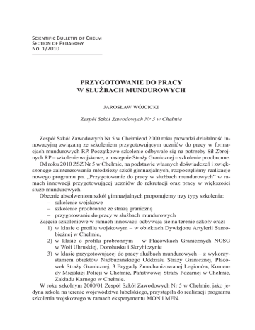 Scientific Bulletin of Chełm Section of Pedagogy No. 1/2010 PRZYGOTOWANIE DO PRACY W SŁUŻBACH MUNDUROWYCH JAROSŁAW WÓJCICKI Zespół Szkół Zawodowych Nr 5 w Chełmie Zespół Szkół Zawodowych Nr 5 w Chełmieod 2000 roku prowadzi działalność innowacyjną związaną ze szkoleniem przygotowującym uczniów do pracy w formacjach mundurowych RP. Początkowo szkolenie odbywało się na potrzeby Sił Zbrojnych RP – szkolenie wojskowe, a następnie Straży Granicznej – szkolenie proobronne. Od roku 2010 ZSZ Nr 5 w Chełmie, na podstawie własnych doświadczeń i zwiększonego zainteresowania młodzieży szkół gimnazjalnych, rozpoczęliśmy realizację nowego programu pn. „Przygotowanie do pracy w służbach mundurowych” w ramach innowacji przygotowującej uczniów do rekrutacji oraz pracy w większości służb mundurowych. Obecnie absolwentom szkół gimnazjalnych proponujemy trzy typy szkolenia: –– szkolenie wojskowe –– szkolenie proobronne ze strażą graniczną –– przygotowanie do pracy w służbach mundurowych Zajęcia szkoleniowe w ramach innowacji odbywają się na terenie szkoły oraz: 1) w klasie o profilu wojskowym – w obiektach Dywizjonu Artylerii Samobieżnej w Chełmie, 2) w klasie o profilu probronnym – w Placówkach Granicznych NOSG w Woli Uhruskiej, Dorohusku i Skryhiczynie 3) w klasie przygotowującej do pracy służbach mundurowych – z wykorzystaniem obiektów Nadbużańskiego Oddziału Straży Granicznej, Placówek Straży Granicznej, 3 Brygady Zmechanizowanej Legionów, Komendy Miejskiej Policji w Chełmie, Państwowej Straży Pożarnej w Chełmie, Zakładu Karnego w Chełmie. W roku szkolnym 2000/01 Zespół Szkół Zawodowych Nr 5 w Chełmie, jako jedyna szkoła na terenie województwa lubelskiego, przystąpiła do realizacji programu szkolenia wojskowego w ramach eksperymentu MON i MEN. 134 JAROSŁAW WÓJCICKI W latach 2000-2003 program realizowany był w klasie 5-letniego technikum elektronicznego na podbudowie 8-letniej szkoły podstawowej, której wychowawcą był Jan Dąbski. Realizacja programu pozwoliła uczniom tej klasy na poznanie specyfiki szkolenia oraz służby w Siłach Zbrojnych RP, w tym – strzelanie z broni strzeleckiej WP i zapoznanie ze sprzętem 3 Brygady Zmechanizowanej Legionów. Uczniowie uczestniczyli również w nauce jazdy konnej oraz pływania. W latach kolejnych tj. 2002-2005, realizacja odbywała się już w ramach innowacji pedagogicznej „szkolenie prowojskowe”, w klasie 4-letniego technikum elektronicznego na podbudowie szkoły gimnazjalnej, której wychowawcą był Mariusz Półtorak. Zajęcia szkoleniowe odbywały się na terenie Jednostki Wojskowej JW 1934, dzięki porozumieniu o współpracy z Dowódcą Dywizjonu Artylerii Samobieżnej w Chełmie – ppłk. Tadeuszem Ordyńcem z 7 listopada 2002 r. Zajęcia szkoleniowe odbywały się z wykorzystaniem bazy szkoleniowej JW-1934 w Chełmie, a prowadzili je żołnierze zawodowi, oddelegowani przez dowódcę jednostki (współautor programu – chor. Janusz Żyliński oraz m.in. plut. Marcin Cieślak, plut. Sławomir Białas) oraz nauczyciele ZSZ Nr 5 (mgr Jan Dąbski i mgr Mariusz Półtorak). W ramach szkolenia uczniowie klas wojskowych uczestniczyli w obozach szkoleniowo – wypoczynkowych w: Chełmie, Garczynie, Dubience i Sobieszynie. W czasie podsumowania w Ministerstwie Edukacji Narodowej eksperyment oceniono wysoko, nasza szkoła uplasowała się w pierwszej dziesiątce na prawie 150 szkół biorących w nim udział, a dyrektor szkoły – mgr Ewa Gągała w kwietniu 2004 r. otrzymała od MON brązowy medal za Zasługi dla Obronności Kraju. W roku 2002, po podpisaniu porozumienia o współpracy z Komendantem Nadbużańskiego Oddziału Straży Granicznej w Chełmie – płk. Markiem Dominiakiem, rozpoczęto realizację kolejnego programu: Szkolenie Proobronne – Straży Granicznej w klasie liceum profilowanego elektronicznego, której wychowawcą była mgr Ewa Jakubowicz, a oddelegowanym funkcjonariuszem por. Henryk Józiuk. W roku 2005 dokonano ewaluacji programu, który dostosowano do potrzeb i możliwości szkoły. Nowy program zgłoszono pod nazwą Szkolenie Proobronne „Granica”. Jest on realizowany do dziś w klasach liceum profilowanego elektronicznego i zarządzanie informacją. Pierwsi absolwenci uzyskali certyfikat szkolenia w roku 2005, potwierdzony przez Komendanta NOSG w Chełmie. Realizacja programu odbywa się z wykorzystaniem bazy szkoły oraz Komendy Nabużańskiego Oddziału Straży Granicznej i placówek podległych (PSG Wola Uhruska, PSG Dorohusk, PSG Skryhiczyn). Zajęcia prowadzą funkcjonariusze rezerwy SG oraz funkcjonariusze zatrudnieni w PSG Wola Uhruska i PSG Skryhiczyn. W ramach szkolenia uczniowie klas proobronnych uczestniczyli w obozach szkoleniowo – wypoczynkowych w: Chełmie, Garczynie, Dubience, Sobieszynie, Dorohusku, Włodawie, Sztutowie, Ustrzykach Dolnych, Puszczy, Lubyczy Królewskiej. W roku 2009 ponownie rozpoczęliśmy realizację programu szkolenia wojskowego w klasie technikum elektronicznego na podstawie porozumienia z dnia 25 marca 2009 r., o współpracy z Dowódcą 3 Brygady Zmechanizowanej Legionów w Lublinie – gen. bryg. Janem Brzozowskim. PRZYGOTOWANIE DO PRACY W SŁUŻBACH MUNDUROWYCH 135 Wszystkie realizowane w szkole programy innowacyjne związane z klasami mundurowymi mają cechy wspólne, którymi są: umundurowanie uczniów, 7- dniowe obozy zimowe (w klasach I i II) oraz 10- dniowe obozy letnie ( po klasie I i II), realizację szkolenia kończy wewnętrzny egzamin praktyczny będący jednocześnie ostatnim etapem ewaluacji programu, po którym uczniowie uzyskują Certyfikat (druk wewnętrzny) potwierdzony przez Szkołę i Dyrektora Szkoły. W czasie zajęć szkoleniowych i obozów szkoleniowych uczniowie poznają: –– organizację, zadania i funkcjonowanie Sił Zbrojnych Rzeczypospolitej Polskiej oraz formacji podległych Ministerstwu Spraw Wewnętrznych i Administracji, Mi