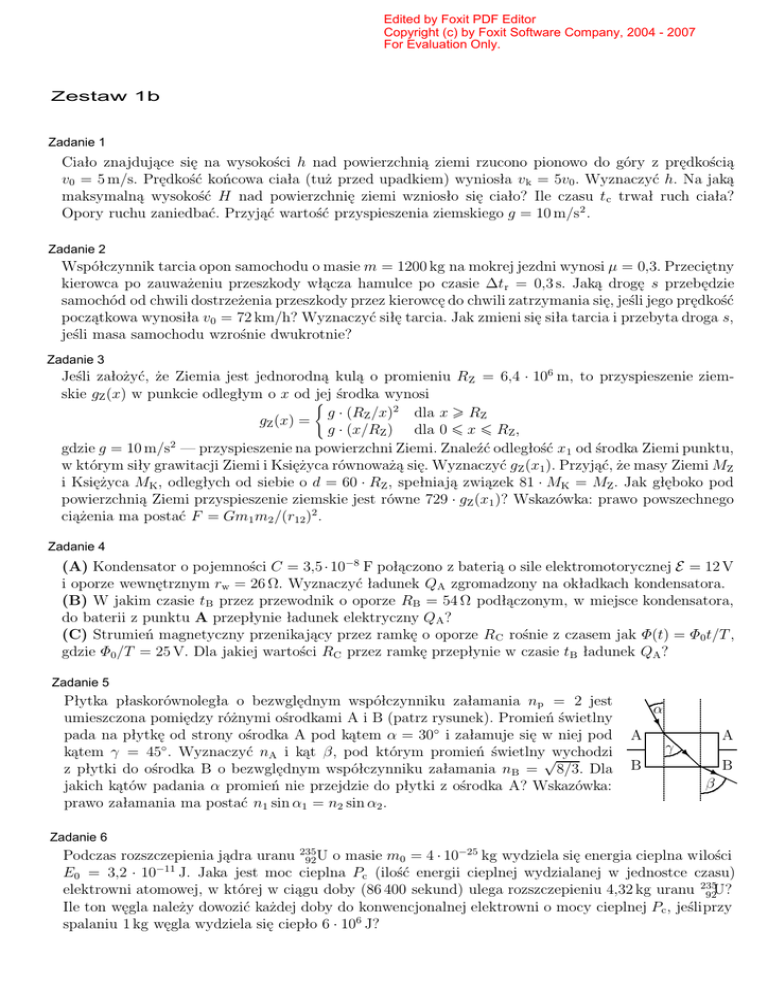 Edited by Foxit PDF Editor Copyright (c) by Foxit Software Company, 2004 - 2007 For Evaluation Only. Zestaw 1b Zadanie 1 Ciało znajdujące się na wysokości h nad powierzchnią ziemi rzucono pionowo do góry z prędkością v0 = 5 m/s. Prędkość końcowa ciała (tuż przed upadkiem) wyniosła vk = 5v0 . Wyznaczyć h. Na jaką maksymalną wysokość H nad powierzchnię ziemi wzniosło się ciało? Ile czasu tc trwał ruch ciała? Opory ruchu zaniedbać. Przyjąć wartość przyspieszenia ziemskiego g = 10 m/s 2 . Zadanie 2 Współczynnik tarcia opon samochodu o masie m = 1200 kg na mokrej jezdni wynosi µ = 0,3. Przeciętny kierowca po zauważeniu przeszkody włącza hamulce po czasie ∆tr = 0,3 s. Jaką drogę s przebędzie samochód od chwili dostrzeżenia przeszkody przez kierowcę do chwili zatrzymania się, jeśli jego prędkość początkowa wynosiła v0 = 72 km/h? Wyznaczyć siłę tarcia. Jak zmieni się siła tarcia i przebyta droga s, jeśli masa samochodu wzrośnie dwukrotnie? Zadanie 3 Jeśli założyć, że Ziemia jest jednorodną kulą o promieniu RZ = 6,4 · 106 m, to przyspieszenie ziemskie gZ (x) w punkcie odległym o x od ( jej środka wynosi g · (RZ /x)2 dla x RZ gZ (x) = g · (x/RZ ) dla 0 ¬ x ¬ RZ, 2 gdzie g = 10 m/s — przyspieszenie na powierzchni Ziemi. Znaleźć odległość x1 od środka Ziemi punktu, w którym siły grawitacji Ziemi i Księżyca równoważą się. Wyznaczyć g Z (x1). Przyjąć, że masy Ziemi MZ i Księżyca MK , odległych od siebie o d = 60 · RZ , spełniają związek 81 · MK = MZ. Jak głęboko pod powierzchnią Ziemi przyspieszenie ziemskie jest równe 729 · gZ (x1 )? Wskazówka: prawo powszechnego ciążenia ma postać F = Gm1 m2 /(r12)2 . Zadanie 4 (A) Kondensator o pojemności C = 3,5 · 10−8 F połączono z baterią o sile elektromotorycznej E = 12 V i oporze wewnętrznym rw = 26 Ω. Wyznaczyć ładunek QA zgromadzony na okładkach kondensatora. (B) W jakim czasie tB przez przewodnik o oporze RB = 54 Ω podłączonym, w miejsce kondensatora, do baterii z punktu A przepłynie ładunek elektryczny QA ? (C) Strumień magnetyczny przenikający przez ramkę o oporze RC rośnie z czasem jak Φ(t) = Φ0t/T , gdzie Φ0/T = 25 V. Dla jakiej wartości RC przez ramkę przepłynie w czasie tB ładunek QA ? Zadanie 5 Płytka płaskorównoległa o bezwględnym współczynniku załamania np = 2 jest umieszczona pomiędzy różnymi ośrodkami A i B (patrz rysunek). Promień świetlny pada na płytkę od strony ośrodka A pod kątem α = 30◦ i załamuje się w niej pod kątem γ = 45◦ . Wyznaczyć nA i kąt β, pod którym promień świetlny√wychodzi z płytki do ośrodka B o bezwględnym współczynniku załamania nB = 8/3. Dla jakich kątów padania α promień nie przejdzie do płytki z ośrodka A? Wskazówka: prawo załamania ma postać n1 sin α1 = n2 sin α2 . A B Aα AU A A A @ γR @ @H B j HH β H Zadanie 6 −25 Podczas rozszczepienia jądra uranu 235 kg wydziela się energia cieplna wilości 92 U o masie m0 = 4 · 10 −11 E0 = 3,2 · 10 J. Jaka jest moc cieplna Pc (ilość energii cieplnej wydzialanej w jednostce czasu) elektrowni atomowej, w której w ciągu doby (86 400 sekund) ulega rozszczepieniu 4,32 kg uranu 235 92U? Ile ton węgla należy dowozić każdej doby do konwencjonalnej elektrowni o mocy cieplnej P c , jeśliprzy spalaniu 1 kg węgla wydziela się ciepło 6 · 106 J?