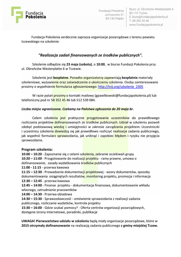 Fundacja Pokolenia serdecznie zaprasza organizacje pozarządowe z terenu powiatu tczewskiego na szkolenie: "Realizacja zadań finansowanych ze środków publicznych". Szkolenie odbędzie się 23 maja (sobota), o 10:00, w biurze Fundacji Pokolenia przy ul. Obrońców Westerplatte 6 w Tczewie. Szkolenie jest bezpłatne. Ponadto organizatorzy zapewniają bezpłatnie materiały szkoleniowe, wyżywienie oraz zaświadczenie o ukończeniu szkolenia. Osoby zainteresowane prosimy o wypełnienie formularza zgłoszeniowego: http://tnij.org/szkolenie_2305 W razie pytań prosimy o kontakt mailowy ([email protected]) lub telefoniczny pod nr 58 352 45 46 lub 512 539 084. Liczba miejsc ograniczona. Czekamy na Państwa zgłoszenia do 20 maja br. Celem szkolenia jest praktyczne przygotowanie uczestników do prawidłowego rozliczania projektów dofinansowanych ze środków publicznych. Udział w szkoleniu pozwoli zdobyć podstawową wiedzę i umiejętności w zakresie zarządzania projektem. Uczestniczki i uczestnicy szkolenia dowiedzą się jak prawidłowo rozliczyć realizacje zadania publicznego, jak wypełnić formularz sprawozdania, jak uniknąć i zapobiec błędom i ryzyku nie przyjęcia sprawozdania. Program szkolenia: 10:00 – 10:20 - Zapoznanie się z celami szkolenia, zebranie oczekiwań grupy 10:20 – 11:00 - Przygotowanie do realizacji projektu - ramy prawne, umowa o dofinansowanie, zasady wydatkowania środków publicznych 11:00 - 11:15 - przerwa kawowa 11:15 – 12:30 - Prowadzenie dokumentacji projektowej - wzory dokumentów, sposoby dokumentowania osiągniętych rezultatów, monitoring projektu, promocja i informacja 12:30 – 12:45 - przerwa kawowa 12:45 – 14:00 - Finanse projektu - dokumentacja finansowa, dokumentowanie wkładu własnego, zatrudnianie pracowników 14:00 – 14:30 - Przerwa obiadowa 14:30 – 15:30 - Sprawozdawczość - omówienie sprawozdania z realizacji zadania publicznego, rozliczanie wydatków, kontrola projektu 15:30 – 16:00 - Gdzie szukać pomocy? - Oferta centrów organizacji pozarządowych, dostępne strony internetowe, poradniki, publikacje UWAGA! Pierwszeństwo udziału w szkoleniu będą miały organizacje pozarządowe, które w 2015 otrzymały dofinansowanie na realizację zadania publicznego z gminy miejskiej Tczew. Prowadzący: - Paulina Kremer - Członkini Zarządu Fundacji Pokolenia, organizacji wspierającej rozwój trzeciego sektora w powiecie tczewskim i nowodworskim. W Fundacji zajmuję się zarówno wsparciem dla nowo tworzących się organizacji jak i dla tych które już działają. Jestem także trenerką – prowadzę szkolenia z zakresu planowania i realizacji inicjatyw oraz projektów społecznych, kompetencji społecznych, a także debatowania. Kolejnym obszarem moich działań jest edukacja obywatelska młodzieży, prowadzę m.in. warsztaty w szkołach dla uczniów/uczennic i nauczycieli/-ek. Angażuję się także w różnego rodzaju inicjatywy obywatelskie związane z prawami człowieka, edukacją globalną, edukacją antydyskryminacyjną. Jestem członkinią Rady Organizacji Pozarządowych Powiatu Tczewskiego oraz Pomorskiej Rady Organizacji Pozarządowych. - Artur Rajkowski – Koordynator programów grantowych w ramach Funduszu AKUMULATOR SPOŁECZNY i Programu „Działaj Lokalnie” w Fundacji Pokolenia. Od ponad 5 lat ściśle związany z sektorem pozarządowym. Realizator kilkunastu projektów finansowanych ze środków publicznych (JST oraz MPiPS) i w ramach konkursów grantowych. Doradca i coach grup nieformalnych i NGO. Konsultant sieci informacyjnej EURODESK. Wieloletni wolontariusz i działacz na rzecz społeczności lokalnej. Absolwent Polsko – Angielskiej Szkoły Trenerów Młodzieżowych Instytutu Edukacji Społecznej we Wrocławiu. Tematyka prowadzonych szkoleń: planowanie i realizacja projektów, źródła finansowania dla NGO, regranting, wolontariat, debatowanie w stylu oksfordzkim z podstawami komunikacji i wystąpień publicznych.