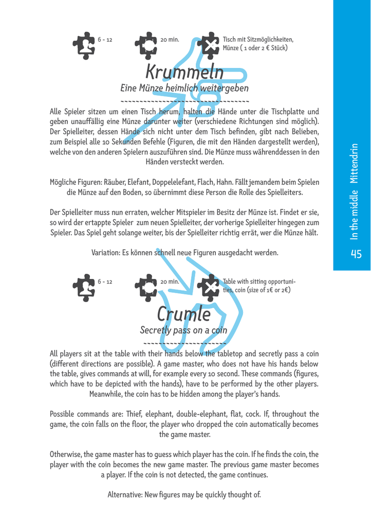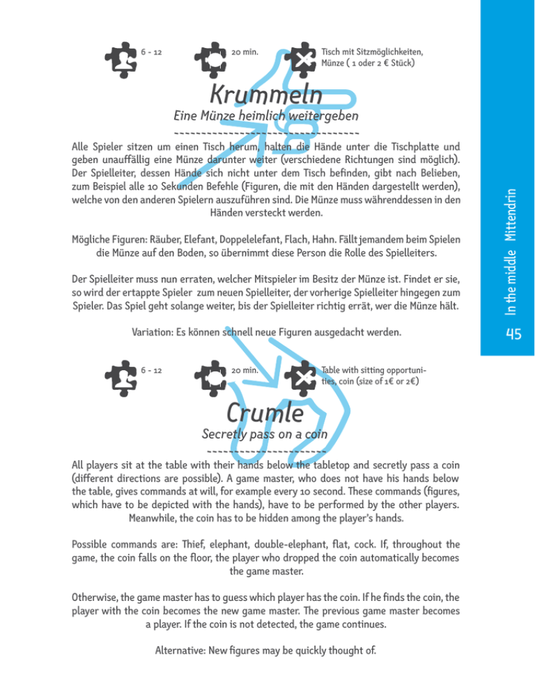 6 - 12 20 min. Tisch mit Sitzmöglichkeiten, Münze ( 1 oder 2 € Stück) Krummeln Eine Münze heimlich weitergeben ---------------------------------- Der Spielleiter muss nun erraten, welcher Mitspieler im Besitz der Münze ist. Findet er sie, so wird der ertappte Spieler zum neuen Spielleiter, der vorherige Spielleiter hingegen zum Spieler. Das Spiel geht solange weiter, bis der Spielleiter richtig errät, wer die Münze hält. In the middle Mi endrin Alle Spieler sitzen um einen Tisch herum, halten die Hände unter die Tischpla e und geben unauffällig eine Münze darunter weiter (verschiedene Richtungen sind möglich). Der Spielleiter, dessen Hände sich nicht unter dem Tisch befinden, gibt nach Belieben, zum Beispiel alle 10 Sekunden Befehle (Figuren, die mit den Händen dargestellt werden), welche von den anderen Spielern auszuführen sind. Die Münze muss währenddessen in den Händen versteckt werden. Variation: Es können schnell neue Figuren ausgedacht werden. 45 Mögliche Figuren: Räuber, Elefant, Doppelelefant, Flach, Hahn. Fällt jemandem beim Spielen die Münze auf den Boden, so übernimmt diese Person die Rolle des Spielleiters. 6 - 12 20 min. Table with si ing opportunities, coin (size of 1€ or 2€) Crumle Secretly pass on a coin ---------------------All players sit at the table with their hands below the tabletop and secretly pass a coin (different directions are possible). A game master, who does not have his hands below the table, gives commands at will, for example every 10 second. ese commands (figures, which have to be depicted with the hands), have to be performed by the other players. Meanwhile, the coin has to be hidden among the player’s hands. Possible commands are: ief, elephant, double-elephant, flat, cock. If, throughout the game, the coin falls on the floor, the player who dropped the coin automatically becomes the game master. Otherwise, the game master has to guess which player has the coin. If he finds the coin, the player with the coin becomes the new game master. e previous game master becomes a player. If the coin is not detected, the game continues. Alternative: New figures may be quickly thought of. 6 - 12 20 min. moneta (1- albo 2-złotówka) Krummeln Potajemne przekazywanie monety ---------------------------------- Uprostřed W trakcie Uczestnicy siadają wkoło stołu z rękoma schowanymi pod stołem, przekazując monetę w przypadkowych kierunkach między sobą. Prowadzący grę, który swoje dłonie trzyma nad stołem, wydaje według uznania, np. co 10 sekund, polecenia (figury, które można pokazać za pomocą dłoni), które wykonują pozostali uczestnicy gry. Podczas wykonywania polecenia moneta musi zostać ukryta w dłoniach. 45 Możliwe figury to: złodziej, słoń, podwójny słoń, płasko, kogut Jeśli moneta podczas gry spadnie na podłogę, osoba, której upadnie moneta, staje się prowadzącym grę. Po wydaniu polecenia prowadzący grę musi odgadnąć, który z graczy posiada monetę. Jeśli prawidłowo odgadnie osobę, wówczas ta osoba staje się prowadzącym. Dotychczasowy prowadzący staje się graczem. Jeśli moneta nie zostanie odnaleziona, gra przebiega dalej. Wariant: Do gry można dodać i wymyślić nowe figury. 6 - 12 20 min. stůl s židlemi, mince (velikostně odpovídající jedné pětikoruně) Hemžení Posílání mince potají --------------------Všichni hráči sedí okolo stolu a nenápadně si pod ním posílají minci (jsou možné různé směry). Vedoucí hry, který své ruce pod stolem nemá, dává podle libosti rozkazy (figury, které je možné ukázat pomocí rukou), např. každých 10 sekund. Hráči musí tyto rozkazy splnit. Zároveň musí mince zůstat skrytá v ruce. Možné rozkazy jsou: loupežník, slon, dvojitý slon, plocha, kohout. Pokud během hry spadne mince na zem, stává se automaticky osoba, které mince spadla, vedoucím hry. Vedoucí hry musí teď uhádnout, u kterého spoluhráče se mince právě nachází. Když minci najde, stává se hráčem a ten, u něhož mince byla nalezena, se stává vedoucím hry. Pokud mince nalezena nebyla, hra normálně pokračuje dál. Varianta: Ke hře se mohou snadno vymyslet nové figury.