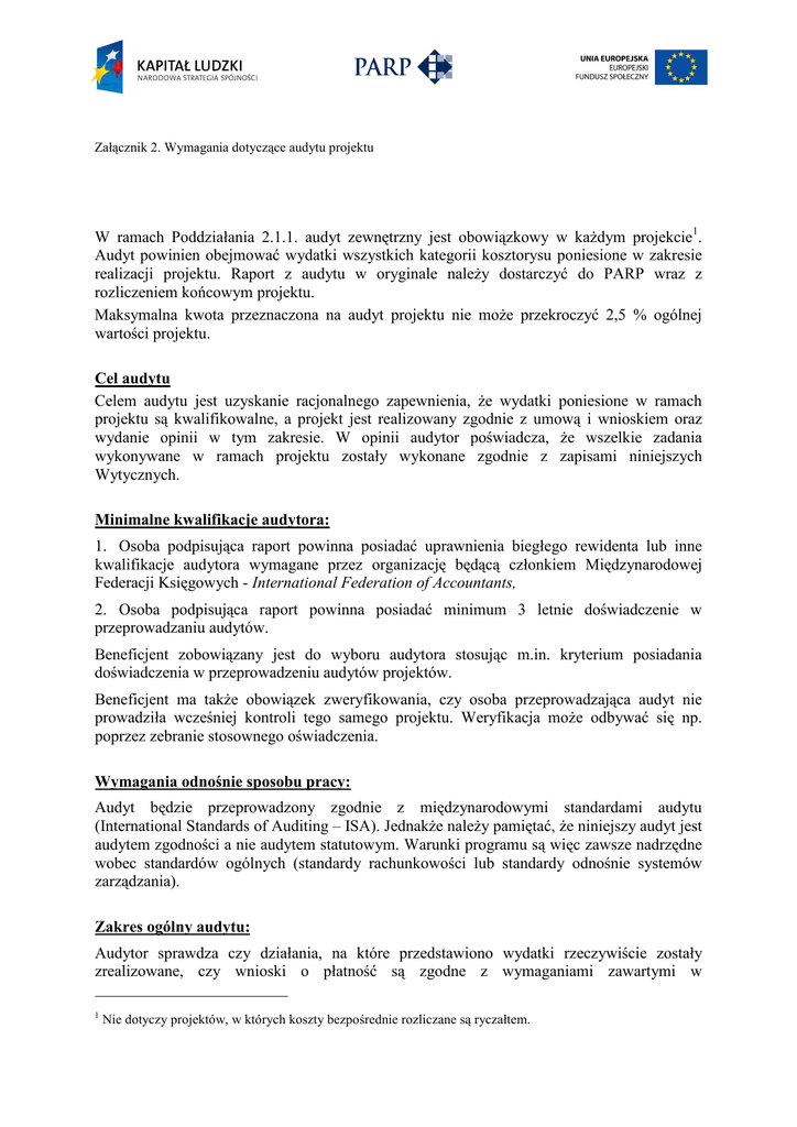 Załącznik 2. Wymagania dotyczące audytu projektu W ramach Poddziałania 2.1.1. audyt zewnętrzny jest obowiązkowy w każdym projekcie1. Audyt powinien obejmować wydatki wszystkich kategorii kosztorysu poniesione w zakresie realizacji projektu. Raport z audytu w oryginale należy dostarczyć do PARP wraz z rozliczeniem końcowym projektu. Maksymalna kwota przeznaczona na audyt projektu nie może przekroczyć 2,5 % ogólnej wartości projektu. Cel audytu Celem audytu jest uzyskanie racjonalnego zapewnienia, że wydatki poniesione w ramach projektu są kwalifikowalne, a projekt jest realizowany zgodnie z umową i wnioskiem oraz wydanie opinii w tym zakresie. W opinii audytor poświadcza, że wszelkie zadania wykonywane w ramach projektu zostały wykonane zgodnie z zapisami niniejszych Wytycznych. Minimalne kwalifikacje audytora: 1. Osoba podpisująca raport powinna posiadać uprawnienia biegłego rewidenta lub inne kwalifikacje audytora wymagane przez organizację będącą członkiem Międzynarodowej Federacji Księgowych - International Federation of Accountants, 2. Osoba podpisująca raport powinna posiadać minimum 3 letnie doświadczenie w przeprowadzaniu audytów. Beneficjent zobowiązany jest do wyboru audytora stosując m.in. kryterium posiadania doświadczenia w przeprowadzeniu audytów projektów. Beneficjent ma także obowiązek zweryfikowania, czy osoba przeprowadzająca audyt nie prowadziła wcześniej kontroli tego samego projektu. Weryfikacja może odbywać się np. poprzez zebranie stosownego oświadczenia. Wymagania odnośnie sposobu pracy: Audyt będzie przeprowadzony zgodnie z międzynarodowymi standardami audytu (International Standards of Auditing – ISA). Jednakże należy pamiętać, że niniejszy audyt jest audytem zgodności a nie audytem statutowym. Warunki programu są więc zawsze nadrzędne wobec standardów ogólnych (standardy rachunkowości lub standardy odnośnie systemów zarządzania). Zakres ogólny audytu: Audytor sprawdza czy działania, na które przedstawiono wydatki rzeczywiście zostały zrealizowane, czy wnioski o płatność są zgodne z wymaganiami zawartymi w 1 Nie dotyczy projektów, w których koszty bezpośrednie rozliczane są ryczałtem. Załącznik 2. Wymagania dotyczące audytu projektu umowie/wniosku o dofinansowanie, czy są poparte odpowiednimi dokumentami finansowymi. Powyższe weryfikowane jest w szczególności na podstawie ksiąg rachunkowych i dowodów księgowych (stanowiącymi podstawę dokonania w nich zapisów) oraz na podstawie dokumentów potwierdzających poniesienie wydatków (wnioski o płatność wraz ze wszystkimi załącznikami – finansowymi i merytorycznymi), które powinny odpowiadać we wszystkich istotnych aspektach wymogom programu oraz prawidłowo, rzetelnie i jasno przedstawiać sytuację finansową i majątkową projektu według stanu na dzień sporządzenia ww. dokumentów. Zakres szczegółowy audytu: Audytor dokonuje oceny dokumentów finansowych i rzeczowych w odniesieniu do działań zrealizowanych przez Projektodawcę i jego Partnerów. Ocenie audytora podlega zgodność realizacji projektu z jego założeniami określonymi w umowie o dofinansowanie projektu, a w szczególności: 1. Ocena prawidłowości rozliczeń finansowych, obejmująca w szczególności: - weryfikację na podstawie reprezentatywnej próby oryginałów dokumentów księgowych dokumentujących wydatki poniesione w ramach projektu, które zostały rozliczone w zatwierdzonych wnioskach o płatność i w szczególności wydatków poniesionych w ramach cross-financingu, w tym weryfikację opisu dokumentów księgowych o poniesieniu wydatku w ramach projektu oraz weryfikację prawidłowości sporządzania metodologii wyliczania kosztów pośrednich rozliczanych ryczałtem/fakt zlecania zadań merytorycznych wykonawcom zewnętrznym. - weryfikację dowodów zapłaty i innych dokumentów potwierdzających fakt zakupu zamówionych towarów i usług, - sprawdzenie, czy prowadzona jest wyodrębniona ewidencja wydatków dla projektu zgodnie z zasadami określonymi dla programu operacyjnego w Systemie Realizacji Programu Operacyjnego Kapitał Ludzki 2007-2013,, - sprawdzenie, czy wkład własny jest wniesiony zgodnie z harmonogramem projektu i jeśli to możliwe, ujęty w wyodrębnionej ewidencji wydatków projektu (w przypadku gdy w projekcie przewidziany jest wkład własny, w tym w przypadku projektów objętych pomocą publiczną), - sprawdzenie, czy w ramach projektu nie finansuje się zwykłej działalności jednostki realizującej projekt, a jedynie koszty związane z realizacją projektu w ramach PO KL, - sprawdzenie czy podatek VAT w ramach projektu jest kwalifikowalny, w szczególności czy beneficjent/partner posiada dokumentację potwierdzającą jego zarejestrowanie jako podatnika VAT oraz czy faktury ujęte we wnioskach o płatność zostały zawarte w rejestrze VAT prowadzonym przez beneficjenta/partnera w kwocie podatku naliczonego, który pomniejsza podatek należny. Załącznik 2. Wymagania dotyczące audytu projektu 2. sposób rekrutacji uczestników projektu (sprawdzenie kwalifikowalności przynajmniej 10 % uczestników projektu w ramach danego projektu poprzez odniesienie zapisów Szczegółowego Opisu Priorytetów Programu Operacyjnego Kapitał Ludzki 2007-2013, Wytycznych w zakresie kwalifikowania wydatków w ramach PO KL, dokumentacji konkursowej oraz założeń projektu do dokumentacji przedłożonej beneficjentowi przez potencjalnych uczestników projektu na etapie ich rekrutacji, (np. umowy szkoleniowe wraz z dołączonymi listami uczestników, zgody na przetwarzanie danych uczestników projektu, oświadczenia przedsiębiorców odnośnie formy zatrudnienia pracowników), 3. sposób pozyskiwania i przechowywania oraz przetwarzania danych o uczestnikach projektu (w ramach Podsystemu PEFS) zgodnie z Ustawą z dnia 29 sierpnia 1997 r. o Ochronie Danych Osobowych, 4. zgodność danych przekazywanych we wniosku o płatno