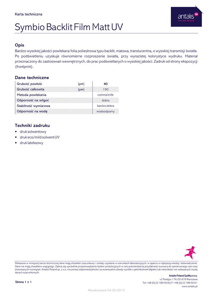 Karta techniczna Symbio Backlit Film Matt UV Opis Bardzo wysokiej jakościi powlekana folia poliestrowa typu t backlit, matowa, translucentna, o wysokiej transmisji światła. Po podświetleniu uzyskuje równomierne rozproszenie światła, przy wyrazistejj kolorystyce wydruku. Materiał przeznaczony do zastosowań wewnętrznych, do prac podświetlanych o wysokiej jakości. jakości Zadruk od strony ekspozycji (frontprint). Dane techniczne Grubość powłoki [µm] 40 Grubość całkowita [µm] 190 Metoda powlekania comma knife Odporność na wilgoć dobra Stabilność wymiarowa bardzo dobra Odporność na wodę wodoodporny Techniki zadruku • druk solwentowy • druk eco/mild solwent UV • druk lateksowy Wskazane w niniejszej karcie technicznej dane mają charakter szacunkowy i zostały uzyskane w warunkach laboratoryjnych, w oparciu o najlepszą najl wiedzę i doświadczenie. Dane nie mają charakteru wiążącego. Zaleca się uprzednie przeprowadzenie testów produkcyjnych w celu potwierdzenia przydatności surowca do zamierzonego celu oraz stosowanych rozwiązań. Antalis Poland sp. z o.o. nie ponosi odpowiedzialności za ewentualne szkody wynikłe z jakichkolwiek błędów błędów lub nieścisłości we wskazanych wyżej danych szacunkowych. Antalis Poland Spółka z o.o. ul. Postępu 17A, 02-676 Warszawa Strona 1 z 1 Tel +48 (0)22 189 50 00, F +48 (0)22 189 50 01 www.antalis.pl Aktualizowane 04-05-2015