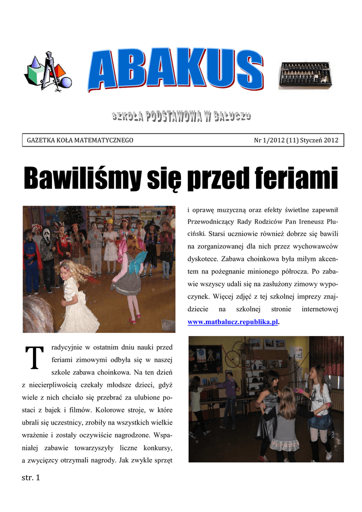GAZETKA KOŁA MATEMATYCZNEGO Nr 1/2012 (11) Styczeń 2012 Bawiliśmy się przed feriami i oprawę muzyczną oraz efekty świetlne zapewnił Przewodniczący Rady Rodziców Pan Ireneusz Pluciński. Starsi uczniowie również dobrze się bawili na zorganizowanej dla nich przez wychowawców dyskotece. Zabawa choinkowa była miłym akcentem na pożegnanie minionego półrocza. Po zabawie wszyscy udali się na zasłużony zimowy wypoczynek. Więcej zdjęć z tej szkolnej imprezy znajdziecie na szkolnej stronie www.matbalucz.republika.pl. T radycyjnie w ostatnim dniu nauki przed feriami zimowymi odbyła się w naszej szkole zabawa choinkowa. Na ten dzień z niecierpliwością czekały młodsze dzieci, gdyż wiele z nich chciało się przebrać za ulubione postaci z bajek i filmów. Kolorowe stroje, w które ubrali się uczestnicy, zrobiły na wszystkich wielkie wrażenie i zostały oczywiście nagrodzone. Wspaniałej zabawie towarzyszyły liczne konkursy, a zwycięzcy otrzymali nagrody. Jak zwykle sprzęt str. 1 internetowej GAZETKA KOŁA MATEMATYCZNEGO Nr 1/2012 (11) Styczeń 2012 Wielcy matematycy c.d. SPORT W NASZEJ SZKOLE Sztafetowe Biegi Przełajowe W dniu 11 października 2011r. na terenie CSiR w Łasku odbyły się mistrzostwa powiatu w sztafetowych biegach przełajowych szkół podstawowych. Klasyfikacja końcowa w kategorii chłopców: 1. SP nr 5 Łask 2. SP Buczek 3. SP nr 4 Łask Kolumna 4. SP Sędziejowice 5. SP Bałucz Skład reprezentacji – Jagiełło Andrzej, Grzanka Rafał, Góralczyk Marcin, Molenda Bartosz, Nastarowicz Mateusz, Piątkowski Kacper, Binas Sebastian, Grzanka Adam, Miksa Maciej. Dziewczęta nie startowały. Zagadka Narysuj cztery odcinki o dowolnej długości tak, aby połączyć wszystkie kółka. Nie wolno odrywać ołówka od kartki oraz wracać po już narysowanej linii. W trakcie czterodniowego przesłuchania Galileusz przedstawił tylko jeden dowód, który miał potwierdzić teorię głoszącą, że to Ziemia krąży wokół Słońca. Był to argument o przypływach i odpływach, który został przez jego sędziów uznany za niewiarygodny. 22 czerwca 1633 roku Galileusz ubrany w białą koszulę (zwyczajowy strój ukaranych heretyków) został doprowadzony do sali dominikańskiego klasztoru Santa Maria Sopra Minerva. Klęcząc w obecności dziesięciu sędziów wysłuchał wyroku. Trybunał Rzymskiej Inkwizycji stosunkiem głosów 7 do 3 skazał 69-letniego wówczas uczonego na dożywotni areszt domowy. W czasie pobytu w niej był odwiedzany zarówno przez naukowców jak i przez dostojników kościelnych, z którymi prowadził dysputy. Ostatecznie zakaz opuszczania willi został mu uchylony. Drugą częścią kary Galileusza było cotygodniowe odmawianie siedmiu psalmów pokutnych przez trzy lata, co czynił nadal po jej zakończeniu z własnej woli. Uczony w czasie procesu wyrecytował formułę odwołującą i przeklinającą swoje "błędy", określającą je jako "obrzydliwe" unikając surowszej kary. c.d.n. Źródło: Wikipedia str. 2 GAZETKA KOŁA MATEMATYCZNEGO Nr 1/2012 (11) Styczeń 2012 Siedem Cudów Starożytnego Świata c.d. Latarnia morska na Faros – starożytna latarnia, która została zbudowana ok. 280-279 p.n.e. Możliwe, że pomysłodawcą budowy latarni był sam Aleksander Macedoński. Latarnia znajdowała się na przybrzeżnej wysepce Faros na Morzu Śródziemnym, która mając sztuczne połączenie ze stałym lądem poprzez groblę, stanowiła część wejścia do portu w Aleksandrii w Egipcie. Ocenia się, że była to wieża o wysokości ok. 115~120 m. Miała dolną kondygnację o przekroju kwadratu, nad nią wznosiła się kolejna, ośmiokątna i trzecia o przekroju okrągłym. Latarnia zwieńczona była kopułą wspartą na ośmiu kolumnach. Na niej ustawiony był posąg Posejdona o wysokości około 7 m. W tamtych czasach była to najwyższa budowla na świecie o podstawie krótszej od jej wysokości. Po zmierzchu rozpalano na latarni ogień. Chrust był dostarczany na szczyt wieży na grzbietach osłów, a potem przez tragarzy. Odbijane metalowymi lustrami światło widoczne było z kilkudziesięciu kilometrów. Budowla została uszkodzona kilkakrotnie na skutek trzęsień ziemi, była też przebudowywana. Wieża została ostatecznie zniszczona przez trzęsienie w roku 1375. Pozostałe po niej ruiny zniknęły, kiedy w 1480 sułtan Egiptu użył ich do budowy na tym miejscu fortu. Obecnie na fundamentach latarni znajduje się Muzeum Morskie. Źródło: Wikipedia str. 3 Wiszące ogrody królowej Semiramidy w Babilonie. Ich niezwykłość budziła podziw współczesnych, a zdumienie i wielkie zainteresowanie potomnych. Opisywali je często historycy greccy, a od czasów Aleksandra Wielkiego zalicza się je do siedmiu cudów świata. Zostały zbudowane na polecenie króla Nabuchodonozora II (604-562 p.n.e.), który podarował je swojej żonie, Amytis, ponieważ po przyjeździe do Babilonu bardzo tęskniła za bujną zielenią ojczystego kraju – Medii. Niejasne jest, dlaczego nazwano je imieniem Semiramidy, asyryjskiej królowej, która żyła dwa wieki wcześniej. Były one zakładane na tarasach wznoszących się do góry i podtrzymywanych specjalną konstrukcją, którą tworzyły szeregi wąskich, coraz wyższych korytarzy zasklepionych kolebkowo. Każdy taras, na którym zasadzono rośliny, był izolowany smołą i powłoką ołowianą na których umieszczano warstwę odsączającą, a następnie grubą warstwę ziemi (do 2 m miąższości), w której rosły drzewa i krzewy, sztucznie nawadniane. Ogrody te zostały założone w VI lub VII wieku p.n.e. Zwisające z tarasów pnącza zakrywały mury, co sprawiało wrażenie, że te piękne rośliny zawieszone są w powietrzu. Do ich nawadniania używano wody z Eufratu, którą dostarczano na poszczególne poziomy za pomocą przemyślnego systemu kanałów i drenów. GAZETKA KOŁA MATEMATYCZNEGO Krzyżówka nr 11 Nr 1/2012 (11) Styczeń 2012 Książka w cytatach *** Czytanie ks