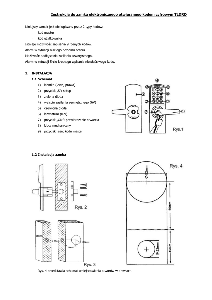 Instrukcja do zamka elektronicznego otwieranego kodem cyfrowym TLDRD Niniejszy zamek jest obsługiwany przez 2 typy kodów: - kod master - kod użytkownika Istnieje możliwość zapisania 9 różnych kodów. Alarm w sytuacji niskiego poziomu baterii. Możliwość podłączenia zasilania zewnętrznego. Alarm w sytuacji 5-cio krotnego wpisania niewłaściwego kodu. 1. INSTALACJA 1.1 Schemat 1) klamka (lewa, prawa) 2) przycisk „S”: setup 3) zielona dioda 4) wejście zasilania zewnętrznego (6V) 5) czerwona dioda 6) klawiatura (0-9) 7) przycisk „ON”: potwierdzenie otwarcia 8) klucz mechaniczny 9) przycisk reset kodu master 1.2 Instalacja zamka Rys. 4 przedstawia schemat umiejscowienia otworów w drzwiach Instrukcja do zamka elektronicznego otwieranego kodem cyfrowym TLDRD 1.3 Instalacja baterii Rys. 5: pokrywę zamknięcia baterii można usunąć za pomocą śrubokręta. 4 szt. baterii alkaicznych AA 1.5V wystarczają na ok. 1 rok pracy W sytuacji gdy zasilanie jest mniejsze niż 5V, zamek w trakcie otwarcia generuje alarm. Baterie należy wymienić w ciągu 10 dni. 1.4 Zasilanie zewnętrzne W przypadku całkowitego wyczerpania baterii istnieje możliwość podłączenia zasilania zewnętrznego DC 6V poprzez dołączony do zestawu wtyk lub otwarcia zamka kluczem mechanicznym. 2. UŻYTKOWANIE 2.1 Kody Zamek obsługuje 2 typy kodów: kod master i kody użytkowników. Te drugie używane są do otwarcia zamka, natomiast za pomocą kodu master można dodawać i usuwać kody użytkowników, jak również otwierać zamek. Kod master rozpoczyna się od „0” – domyślny kod to 0123. Kody użytkowników tworzone są z zakresu cyfr 1-9. Obydwa typy kodów mogą składać się max. z 13 znaków. 2.2 Zmiana kodu master Należy wprowadzić kod master „0123” i nacisnąć przycisk „ON”. Następnie należy wprowadzić nowy kod w czasie gdy świeci się czerwona dioda nacisnąć „S”. 2.3 Reset kodu master Powyższa operacja odbywa się za pomocą przycisku (9) (patrz pkt. 1.1) 2.4 Ustawienie kodów użytkowników Należy wprowadzić kod master i nacisnąć „ON”. Następnie należy wprowadzić nowy kod (nie zaczynający się od 0) i nacisnąć „S” i tak po kolei można ustawić do 9 kodów. Przykład: „0123” à „ON” à „1234” à „S” à „2255” à „S” – w ten sposób dodano kody „1234” oraz „2255”. Instrukcja do zamka elektronicznego otwieranego kodem cyfrowym TLDRD 2.5 Zmiana kodu użytkownika Należy wprowadzić wybrany kod użytkownika i nacisnąć „ON” – w czasie gdy świeci się czerwona dioda (5) należy wprowadzić nowy kod użytkownika i nacisnąć „S”. Przykład: „1234” à „ON” à „1255” à „S” – w ten sposób zmieniono kod „1234” na „1255”. 2.6 Usuwanie kodu użytkownika Należy wprowadzić kod master, nacisnąć „ON” i następnie wprowadzić „0000” potwierdzając przyciskiem „S” – wszystkie kody użytkowników zostaną usunięte. 3. OTWIERANIE ZAMKA Kod użytkownika/kod master à „ON” à zapali się zielona dioda (3) à otwarcie drzwi za pomocą klamki 4. OCHRONA KODÓW W trakcie otwierania zamka w obecności niepowołanych osób, można wprowadzić błędny kod potwierdzając przyciskiem „S” i następnie od razu wprowadzić właściwy kod potwierdzając przyciskiem „ON”. Uwagi 1. Za każdym razem, aby wprowadzić kod i otworzyć zamek, należy poczekać do momentu gdy zgasną wszystkie diody. 2. Kod master powinien być zawsze pamiętany. 3. Przed instalacją i pierwszym użyciem zamka należy uważnie przeczytać instrukcję obsługi.