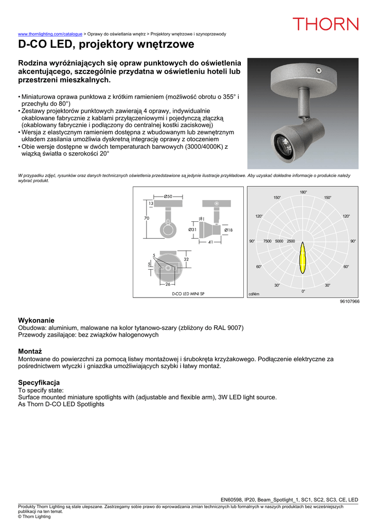 www.thornlighting.com/catalogue > Oprawy do oświetlania wnętrz > Projektory wnętrzowe i szynoprzewody D-CO LED, projektory wnętrzowe Rodzina wyróżniających się opraw punktowych do oświetlenia akcentującego, szczególnie przydatna w oświetleniu hoteli lub przestrzeni mieszkalnych. • Miniaturowa oprawa punktowa z krótkim ramieniem (możliwość obrotu o 355° i przechyłu do 80°) • Zestawy projektorów punktowych zawierają 4 oprawy, indywidualnie okablowane fabrycznie z kablami przyłączeniowymi i pojedynczą złączką (okablowany fabrycznie i podłączony do centralnej kostki zaciskowej) • Wersja z elastycznym ramieniem dostępna z wbudowanym lub zewnętrznym układem zasilania umożliwia dyskretną integrację oprawy z otoczeniem • Obie wersje dostępne w dwóch temperaturach barwowych (3000/4000K) z wiązką światła o szerokości 20° W przypadku zdjęć, rysunków oraz danych technicznych oświetlenia przedstawione są jedynie ilustracje przykładowe. Aby uzyskać dokładne informacje o produkcie należy wybrać produkt. 180° 150° 150° 120° 90° 120° 7500 5000 2500 90° 60° 60° 30° cd/klm 30° 0° 96107966 Wykonanie Obudowa: aluminium, malowane na kolor tytanowo-szary (zbliżony do RAL 9007) Przewody zasilające: bez związków halogenowych Montaż Montowane do powierzchni za pomocą listwy montażowej i śrubokręta krzyżakowego. Podłączenie elektryczne za pośrednictwem wtyczki i gniazdka umożliwiających szybki i łatwy montaż. Specyfikacja To specify state: Surface mounted miniature spotlights with (adjustable and flexible arm), 3W LED light source. As Thorn D-CO LED Spotlights EN60598, IP20, Beam_Spotlight_1, SC1, SC2, SC3, CE, LED Produkty Thorn Lighting są stale ulepszane. Zastrzegamy sobie prawo do wprowadzania zmian technicznych lub formalnych w naszych produktach bez wcześniejszych publikacji na ten temat. © Thorn Lighting www.thornlighting.com/catalogue > Oprawy do oświetlania wnętrz > Projektory wnętrzowe i szynoprzewody D-CO LED, projektory wnętrzowe Opis typów Dostarczane w komplecie ze źródłem światła LED Opis Kod ILCOS Trzonek Waga (kg) Kod SAP 0,11 96107649 D-CO LED oprawy punktowe, sterowniki LED CONV 15/25W UNI 110-240V DIM Produkty Thorn Lighting są stale ulepszane. Zastrzegamy sobie prawo do wprowadzania zmian technicznych lub formalnych w naszych produktach bez wcześniejszych publikacji na ten temat. © Thorn Lighting