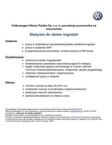 Volkswagen Motor Polska Sp. z o. o. poszukuje pracownika na stanowisko Stażysta do działu logistyki Zadania: praca w charakterze asystenta/asystentki dyrektora logistyki praca w systemie SAP przygotowywanie prezentacji i analiza danych w MS Excel Oczekiwania: ukończone studia magisterskie doświadczenie zawodowe nieprzekraczające 6 miesięcy biegła znajomość języka niemieckiego w mowie i piśmie/ minimum średniozaawansowana znajomość języka angielskiego zdolności interpersonalne i organizacyjne umiejętność pracy w zespole Oferta: umowa o pracę na staż (do 24m-cy) możliwość rozwoju w środowisku międzynarodowym atrakcyjne warunki zatrudnienia opieka ambulatoryjna w miejscu pracy Szczegółowe informacje znajdują się na stronie głównej http://www.vwmp.com.pl/Praca.html Oferty zawierające CV, list motywacyjny, prosimy kierować na adres mailowy: [email protected] do 28.10.2015r z dopiskiem „Stażysta do działu logistyki”. Uprzejmie informujemy, że skontaktujemy się z wybranymi osobami. Prosimy o dopisanie następującej klauzuli "Wyrażam zgodę na przetwarzanie moich danych osobowych zawartych w mojej ofercie pracy dla potrzeb niezbędnych do realizacji procesu rekrutacji (zgodnie z ustawą z dn. 29.08.97 roku o Ochronie Danych Osobowych Dz. Ust Nr 133 poz. 883)".