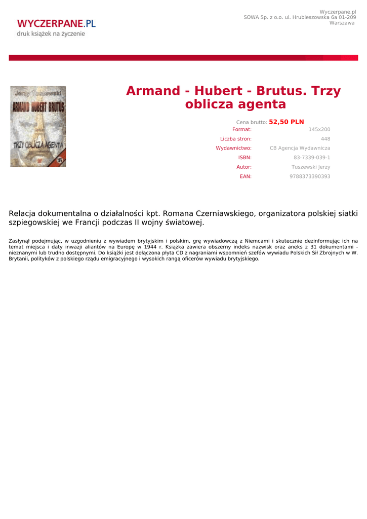 Wyczerpane.pl SOWA Sp. z o.o. ul. Hrubieszowska 6a 01-209 Warszawa Armand - Hubert - Brutus. Trzy oblicza agenta Cena brutto: Format: 52,50 PLN 145x200 Liczba stron: 448 Wydawnictwo: CB Agencja Wydawnicza ISBN: 83-7339-039-1 Autor: Tuszewski Jerzy EAN: 9788373390393 Relacja dokumentalna o działalności kpt. Romana Czerniawskiego, organizatora polskiej siatki szpiegowskiej we Francji podczas II wojny światowej. Zasłynął podejmując, w uzgodnieniu z wywiadem brytyjskim i polskim, grę wywiadowczą z Niemcami i skutecznie dezinformując ich na temat miejsca i daty inwazji aliantów na Europę w 1944 r. Książka zawiera obszerny indeks nazwisk oraz aneks z 31 dokumentami nieznanymi lub trudno dostępnymi. Do książki jest dołączona płyta CD z nagraniami wspomnień szefów wywiadu Polskich Sił Zbrojnych w W. Brytanii, polityków z polskiego rządu emigracyjnego i wysokich rangą oficerów wywiadu brytyjskiego.