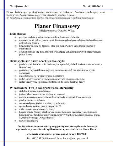Nr rejestru 1741 Nr ref.: BK/70/11 Firma świadcząca profesjonalne doradztwo w zakresie finansów osobistych oraz firmowych. Zapewniająca najwyŜsze standardy obsługi Klienta. W związku z dynamicznym rozwojem obszaru poszukujemy osób na stanowisko: Planer Finansowy Miejsce pracy: Gorzów Wlkp. Jeśli chcesz: • • • • przeprowadzać profesjonalne analizy finansowe klienta opracowywać pakiety rozwiązań finansowych odpowiadające indywidualnym potrzebom Klienta Specjalizować się w branŜy i stać się ekspertem w dziedzinie finansów osobistych oraz zajmować się doradztwem w zakresie usług finansowych oferowanych przez firmę Oraz spełniasz nasze oczekiwania, czyli: • • • • • posiadasz doświadczenie i sukcesy w sprzedaŜy lub doświadczenie w branŜy finansowej posiadasz wykształcenie wyŜsze ewentualnie 4-5 rok studiów w trybie zaocznym masz łatwość w nawiązywaniu kontaktów jesteś zmotywowany i zdeterminowany do osiągnięcia celów jesteś kreatywny i posiadasz zdolność do samodzielnej pracy W zamian za Twoje zaangaŜowanie oferujemy • • • • • • • • • stabilne i pewne zatrudnienie jasna i klarowna ścieŜka rozwoju i awansu pomoc managera oraz coacha, którzy będą wspierać Twój rozwoju profesjonalne szkolenia wynagrodzenie jedne z wyŜszych w branŜy sprawdzony system pracy, wsparcie IT miłą i serdeczną atmosferę pracy bogatą ofertę (lokaty strukturyzowane, fundusze inwestycyjne, fundusze hedgingowe, fundusze emerytalne, kredyty bankowe, ubezpieczenia, Plany Systematycznego Oszczędzania) karierę managera Osoby zainteresowane ofertą mogą otrzymać szczegółowe informacje o pracodawcy oraz formie aplikowania za pośrednictwem Biura Karier. w temacie wiadomości proszę podać nr ref: BK/70/11 Tel.: 095 733 66 63; e-mail: [email protected]