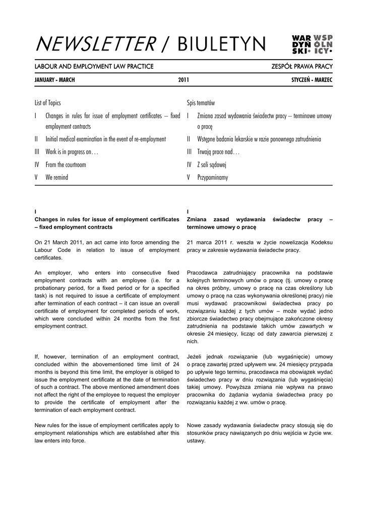 NEWSLETTER / BIULETYN LABOUR AND EMPLOYMENT LAW PRACTICE JANUARY - MARCH ZESPÓŁ PRAWA PRACY 2011 List of Topics STYCZEŃ - MARZEC Spis tematów I Changes in rules for issue of employment certificates – fixed I employment contracts Zmiana zasad wydawania świadectw pracy – terminowe umowy o pracę II Initial medical examination in the event of re-employment Wstępne badania lekarskie w razie ponownego zatrudnienia II III Work is in progress on… III Trwają prace nad… IV From the courtroom IV Z sali sądowej V V We remind Przypominamy I Changes in rules for issue of employment certificates – fixed employment contracts I Zmiana zasad wydawania terminowe umowy o pracę On 21 March 2011, an act came into force amending the Labour Code in relation to issue of employment certificates. 21 marca 2011 r. weszła w Ŝycie nowelizacja Kodeksu pracy w zakresie wydawania świadectw pracy. An employer, who enters into consecutive fixed employment contracts with an employee (i.e. for a probationary period, for a fixed period or for a specified task) is not required to issue a certificate of employment after termination of each contract – it can issue an overall certificate of employment for completed periods of work, which were concluded within 24 months from the first employment contract. Pracodawca zatrudniający pracownika na podstawie kolejnych terminowych umów o pracę (tj. umowy o pracę na okres próbny, umowy o pracę na czas określony lub umowy o pracę na czas wykonywania określonej pracy) nie musi wydawać pracownikowi świadectwa pracy po rozwiązaniu kaŜdej z tych umów – moŜe wydać jedno zbiorcze świadectwo pracy obejmujące zakończone okresy zatrudnienia na podstawie takich umów zawartych w okresie 24 miesięcy, licząc od daty zawarcia pierwszej z nich. If, however, termination of an employment contract, concluded within the abovementioned time limit of 24 months is beyond this time limit, the employer is obliged to issue the employment certificate at the date of termination of such a contract. The above mentioned amendment does not affect the right of the employee to request the employer to provide the certificate of employment after the termination of each employment contract. JeŜeli jednak rozwiązanie (lub wygaśnięcie) umowy o pracę zawartej przed upływem ww. 24 miesięcy przypada po upływie tego terminu, pracodawca ma obowiązek wydać świadectwo pracy w dniu rozwiązania (lub wygaśnięcia) takiej umowy. PowyŜsza zmiana nie wpływa na prawo pracownika do Ŝądania wydania świadectwa pracy po rozwiązaniu kaŜdej z ww. umów o pracę. New rules for the issue of employment certificates apply to employment relationships which are established after this law enters into force. Nowe zasady wydawania świadectw pracy stosują się do stosunków pracy nawiązanych po dniu wejścia w Ŝycie ww. ustawy. świadectw pracy – II Initial medical examination in the event of reemployment II Wstępne badania zatrudnienia Along with changes in the issue of employment certificates, new rules concerning referral for initial medical examination came into force. The employer no longer has to refer the employee for such an examination before admission to work, if the employee is hired again in the same position, or in a position with the same working conditions, within 30 days following the termination of the preceding employment contract. It is possible to include in the above 30-day period days which fall after the termination and directly before entry into force of the new law, i.e. before 21 March 2011. Wraz ze zmianami w wydawaniu świadectw pracy weszły w Ŝycie nowe zasady dotyczące kierowania pracowników na wstępne badania lekarskie. W przypadku ponownego zatrudnienia pracownika w okresie 30 dni od dnia rozwiązania poprzedniej umowy o pracę na to samo stanowisko lub stanowisko o takich samych warunkach pracy pracodawca przed dopuszczeniem takiego pracownika do pracy nie jest zobowiązany kierować go na wstępne badania lekarskie. Trzydziestodniowy okres obejmuje równieŜ czas po ustaniu zatrudnienia u pracodawcy przypadający bezpośrednio przed dniem wejścia w Ŝycie nowelizacji, czyli przed 21 marca 2011 r. III Work is in progress on… III Trwają prace nad… 1) Shorter holiday leave – a new European Commission draft 1) Krótszy urlop wypoczynkowy – nowy projekt Komisji Europejskiej The European Commission is preparing an amendment to the Working Time Directive (2003/88/EC). Under the project, holiday leave will be reduced by two days for each month of sick leave. The final proposal for changes is to be ready after consultations with employers and trade unions of all EU members. Komisja Europejska przygotowuje nowelizację dyrektywy o czasie pracy (2003/88/EC). Zgodnie z projektem za kaŜdy miesiąc zwolnienia lekarskiego urlop wypoczynkowy pracownika będzie pomniejszony o dwa dni. Ostateczne propozycje zmian mają zostać przygotowane po przeprowadzeniu konsultacji z pracodawcami i związkami zawodowymi wszystkich członków Unii Europejskiej. 2) More rights for trade union activists – an amendment of the Labour Code 2) Więcej praw dla działaczy związkowych – zmiana Kodeksu pracy In connection with the ruling of the Polish Constitutional Tribunal dated 12 July 2010, the Senate Families and Social Policy Committee is working on an extension of the category of employees employed on the basis of fixed period or specified task empoyment contracts, who in the event of termination of such employment contract in violation of law have a vested claim for reinstatement to work on previous conditions, alongside existing claim for damages, so this catalogue also includes members of the trade union organizations. W związku z wyrokiem Trybunału Konstytucyjnego z 12 lipca 2010 r. Senacka Komisja Rodziny i Polityki Społecznej pracuje nad rozszerzeniem katalogu pracowników zatrudnionych na podstawie umowy na czas określony lub na czas wykonania okr