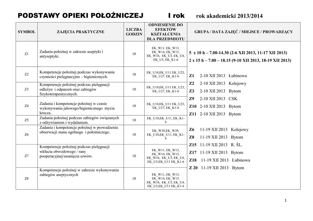 PODSTAWY OPIEKI POŁOŻNICZEJ I rok LICZBA GODZIN ODNIESIENIE DO EFEKTÓW KSZTAŁCENIA DLA PRZEDMIOTU Zadania położnej w zakresie aseptyki i antyseptyki. 10 EK_W11, EK_W13, EK_W14, EK_W15, EK_W16, EK_U3, EK_U4, EK_U5, EK_K1-6 5 x 10 h – 7.00-14.30 (2-6 XII 2013, 11-17 XII 2013) Z2 Kompetencje położnej podczas wykonywania czynności pielęgnacyjno – higienicznych. 10 EK_U10,EK_U11 EK_U23, EK_U27, EK_K1-6 Z1 2-10 XII 2013 Łubinowa Z2 2-10 XII 2013 Kolejowy Z3 Kompetencje położnej podczas pielęgnacji odleżyn i odparzeń oraz zabiegów fizykoterapeutycznych. 10 EK_U10,EK_U11 EK_U23, EK_U27, EK_K1-6 Z3 2-10 XII 2013 Bytom Z9 2-10 XII 2013 CSK 10 EK_U10,EK_U11 EK_U23, EK_U27, EK_K1-6 10 EK_U10,EK_U11, EK_K16 10 EK_W38,EK_W39, EK_U10,EK_U11, EK_K16 10 EK_W11, EK_W13, EK_W14, EK_W15, EK_W16, EK_U3, EK_U4, EK_U5,EK_U11 EK_K1-6 SYMBOL Z1 Z4 Z5 Z6 Z7 ZAJĘCIA PRAKTYCZNE Zadania i kompetencje położnej w czasie wykonywania jałowego/higienicznego mycia krocza. Zadania położnej podczas zabiegów związanych z odżywianiem i wydalaniem. Zadania i kompetencje położnej w prowadzeniu obserwacji stanu ogólnego i położniczego. Kompetencje położnej podczas pielęgnacji wkłucia obwodowego / rany pooperacyjnej/usunięcia szwów. GRUPA / DATA ZAJĘĆ / MIEJSCE / PROWADZĄCY 2 x 15 h – 7.00 – 18.15 (9-10 XII 2013, 18-19 XII 2013) Z10 2-10 XII 2013 Bytom Z11 2-10 XII 2013 Bytom Z6 11-19 XII 2013 Kolejowy Z8 11-19 XII 2013 Bytom Z15 11-19 XII 2013 R. ŚL. Z17 11-19 XII 2013 Bytom Z18 11-19 XII 2013 Łubinowa Z 20 11-19 XII 2013 Bytom Kompetencje położnej w zakresie wykonywania zabiegów aseptycznych Z8 rok akademicki 2013/2014 10 EK_W11, EK_W13, EK_W14, EK_W15, EK_W16, EK_U3, EK_U4, EK_U5,EK_U11 EK_K1-6 1 Miejsce zajęć: Bytom – Szpital Specjalistyczny nr 2 w Bytomiu, ul. Batorego 15, blok V Bogucice – Szpital Zakonu Bonifratrów, ul Markiefki 87, Katowice CSK – Centralny Szpital Kliniczny w Katowicach, ul. Medyków 14, IV p. Łubinowa – Prywatny Szpital Ginekologiczno – Położniczy w Katowicach, ul. Łubinowa 3 Kolejowy – Okręgowy Szpital Kolejowy w Katowicach, ul. Panewnicka 65 R.Śl. – Szpital Miejski w Rudzie Śląskiej, ul. Lipa 2 VI. ZALECANA LITERATURA PODSTAWOWA 1. Bałanda A.: Opieka nad noworodkiem. PZWL, Warszawa 2009 2. Bień A. M.: Opieka nad kobietą ciężarną. PZWL, Warszawa 2009 3. Caus – Wozniak I (red.): Podstawy opieki położniczej. ŚAM, Katowice 2007 4. Ciechaniewicz W.(red.): Pielęgniarstwo – ćwiczenia. PZWL, Warszawa 2004 5. Ciechaniewicz W.: Wstrzyknięcia. PZWL, Warszawa 2007 6. Chrząszczewska Z.: Bandażowanie, PZWL, Warszawa 2010 7. Karczewski J.K.(red.): Higiena. Czelej, Lublin 2002 8. Kawczńska – Butrym Z.: Rodzina – zdrowie – choroba. Koncepcje i praktyka pielęgniarstwa rodzinnego. Czelej, Lublin 2001 9. Kwiatkowska A., Krajeńska – Kułak E., Panek W. (red.): Komunikowanie interpersonalne w pielęgniarstwie. Czelej, Lublin 2003 10. Łepecka – Klusek C.: Pielęgniarstwo we współczesnym położnictwie i ginekologii. Czelej, Lublin 2010. 11. Muscari M.E. (red. nauk.Bernat K.) : Pediatria i pielęgniarstwo pediatryczne. Czelej, Lublin 2005 12. Rakowska – Róziewicz D.: Wybrane standardy i procedury w pielęgniarstwie pediatrycznym. Czelej, Lublin 2001 13. Ślusarska B., Zarzycka D., Zahradniczek K.: Podstawy pielęgniarstwa. Tom I i II. Czelej, Lublin 2008 14. Rozporządzenie Ministra Zdrowia z dnia 7 października 2010 r. w sprawie standardów postępowania oraz procedur medycznych przy udzielaniu świadczeń zdrowotnych z zakresu opieki okołoporodowej sprawowanej nad kobietą rodzącą oraz jej dzieckiem. 15. Rozporządzenie Ministra Zdrowia z dnia 7 października 2010 r. w sprawie standardów postępowania oraz procedur medycznych przy udzielaniu świadczeń zdrowotnych z zakresu opieki okołoporodowej sprawowanej nad kobietą rodzącą oraz jej dzieckiem (Dziennik Ustaw Nr 187 z dn. 7.10.2010 poz. 1259). UZUPEŁNIAJĄCA 1. Baumert M. (red.): Ćwiczenia z neonatologii. Skrypt dla studentów. ŚAM, Katowice 2004. 2. Cekański A: Wybrane zagadnienia z położnictwa i ginekologii dla położnych. Podręcznik dla położnych. Wydawnictwo ŚAM, Katowice 1999. 3. Cekański A. (red.): Wykłady z położnictwa. Alfa Medica Press, Bielsko – Biała 2011. 4. Chapman V., Charles C.: Prowadzenie porodu. PZWL, Warszawa 2010. 5. Dmoch – Gajzlerska E.: Położnictwo i ginekologia: dla studentów położnictwa i pielęgniarstwa, cz. 5 i 6. WUM, Warszawa 2008. 6. Dudenhausen J.W., Pschyrembel W.: Położnictwo praktyczne i operacje położnicze. PZWL, Warszawa 2010. 7. Opala T: Ginekologia. Podręcznik dla położnych, pielęgniarek i fizjoterapeutów. PZWL, Warszawa 2003. 2