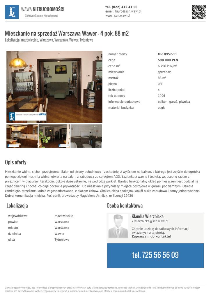 tel. (022) 412 41 50 email: [email protected] www: scn.waw.pl Mieszkanie na sprzedaż Warszawa Wawer - 4 pok. 88 m2 Lokalizacja: mazowieckie, Warszawa, Warszawa, Wawer, Tytoniowa numer oferty M-10957-11 cena 598 000 PLN cena m 6 796 PLN/m2 mieszkanie sprzedaż, metraż 88 m2 piętro 0/4 liczba pokoi 4 rok budowy 1996 informacje dodatkowe balkon, garaż, piwnica materiał budynku cegła 2 Opis oferty Mieszkanie widne, ciche i przestronne. Salon od strony południowo - zachodniej z wyjściem na balkon, z którego jest zejście do ogródka pełnego zieleni. Kuchnia widna, otwarta na salon, z zabudową ze sprzętem AGD. Łazienka z wanną i toaletą, wc osobno razem z prysznicem w glazurze i terakocie, pokoje duże ustawne, na podłodze parkiet. Bardzo funkcjonalny układ pomieszczeń, jest podzial na część dzienną i nocną, co daje poczucie prywatności. Do mieszkania przynależy miejsce postojowe w garażu podziemnym. Osiedle zamknięte, strzeżone, ładnie zagospodarowane, z placem zabaw. Okolica cicha spokojna, wokół niska zabudowa i domy jednorodzinne. Dobra komunikacja miejska. Pośrednik prowadzący Magdalena Armijak, nr licencji 19420 Lokalizacja Osoba kontaktowa Klaudia Wierzbicka województwo mazowieckie powiat Warszawa [email protected] miasto Warszawa dzielnica Wawer ulica Tytoniowa Chętnie udzielę dodatkowych informacji związanych z tą ofertą. Zapraszam do kontaktu! tel. 725 56 56 09 Zawsze dążymy do tego, aby informacje o proponowanych przez nas ofertach były jak najbardziej dokładne. Niekiedy jednak, ze względu na fakt, iż uzyskujemy je od osób trzecich nie jest możliwe ich zweryfikowanie, wobec czego należy traktować je orientacyjnie i nie stanowią one oferty w rozumieniu kodeksu cywilnego.