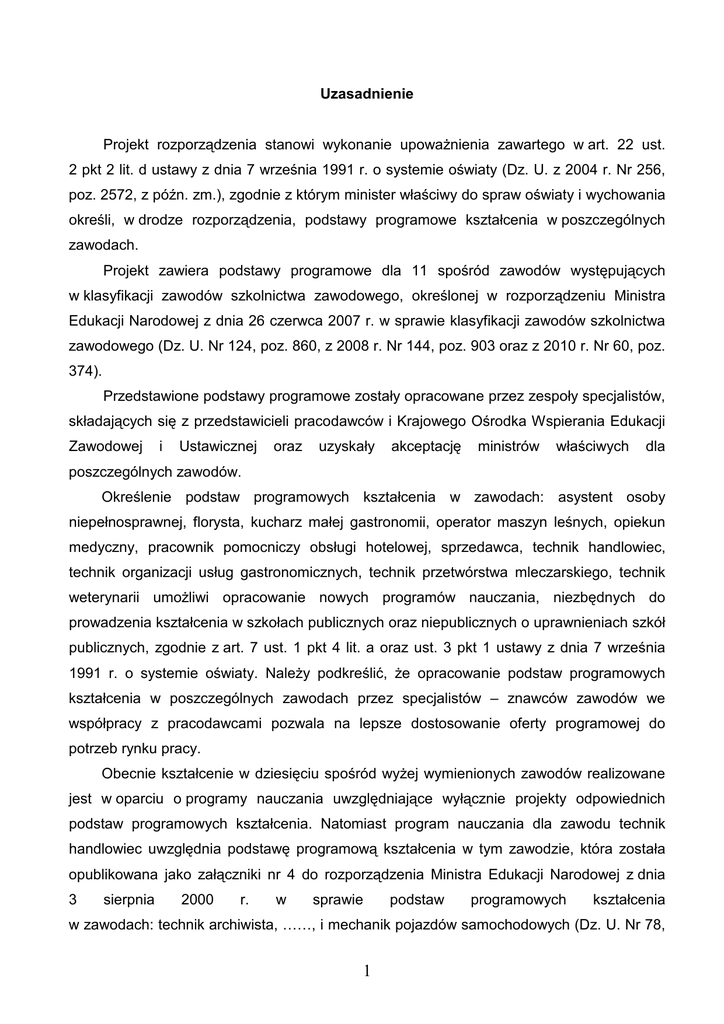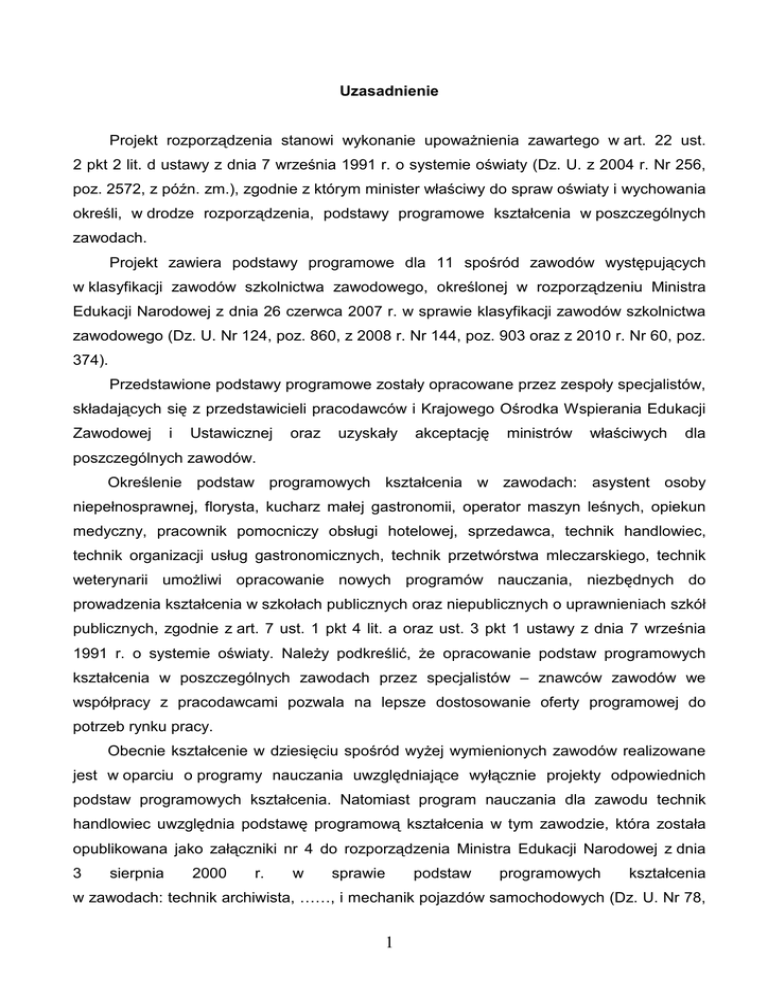 Uzasadnienie Projekt rozporządzenia stanowi wykonanie upowaŜnienia zawartego w art. 22 ust. 2 pkt 2 lit. d ustawy z dnia 7 września 1991 r. o systemie oświaty (Dz. U. z 2004 r. Nr 256, poz. 2572, z późn. zm.), zgodnie z którym minister właściwy do spraw oświaty i wychowania określi, w drodze rozporządzenia, podstawy programowe kształcenia w poszczególnych zawodach. Projekt zawiera podstawy programowe dla 11 spośród zawodów występujących w klasyfikacji zawodów szkolnictwa zawodowego, określonej w rozporządzeniu Ministra Edukacji Narodowej z dnia 26 czerwca 2007 r. w sprawie klasyfikacji zawodów szkolnictwa zawodowego (Dz. U. Nr 124, poz. 860, z 2008 r. Nr 144, poz. 903 oraz z 2010 r. Nr 60, poz. 374). Przedstawione podstawy programowe zostały opracowane przez zespoły specjalistów, składających się z przedstawicieli pracodawców i Krajowego Ośrodka Wspierania Edukacji Zawodowej i Ustawicznej oraz uzyskały akceptację ministrów właściwych dla poszczególnych zawodów. Określenie podstaw programowych kształcenia w zawodach: asystent osoby niepełnosprawnej, florysta, kucharz małej gastronomii, operator maszyn leśnych, opiekun medyczny, pracownik pomocniczy obsługi hotelowej, sprzedawca, technik handlowiec, technik organizacji usług gastronomicznych, technik przetwórstwa mleczarskiego, technik weterynarii umoŜliwi opracowanie nowych programów nauczania, niezbędnych do prowadzenia kształcenia w szkołach publicznych oraz niepublicznych o uprawnieniach szkół publicznych, zgodnie z art. 7 ust. 1 pkt 4 lit. a oraz ust. 3 pkt 1 ustawy z dnia 7 września 1991 r. o systemie oświaty. NaleŜy podkreślić, Ŝe opracowanie podstaw programowych kształcenia w poszczególnych zawodach przez specjalistów – znawców zawodów we współpracy z pracodawcami pozwala na lepsze dostosowanie oferty programowej do potrzeb rynku pracy. Obecnie kształcenie w dziesięciu spośród wyŜej wymienionych zawodów realizowane jest w oparciu o programy nauczania uwzględniające wyłącznie projekty odpowiednich podstaw programowych kształcenia. Natomiast program nauczania dla zawodu technik handlowiec uwzględnia podstawę programową kształcenia w tym zawodzie, która została opublikowana jako załączniki nr 4 do rozporządzenia Ministra Edukacji Narodowej z dnia 3 sierpnia 2000 r. w sprawie podstaw programowych kształcenia w zawodach: technik archiwista, ……, i mechanik pojazdów samochodowych (Dz. U. Nr 78, 1 poz. 887), które utraciło moc z dniem 2 września 2002 r., na podstawie art. 4 ustawy z dnia 21 listopada 2001 r. o zmianie ustawy – Karta Nauczyciela, ustawy o systemie oświaty oraz ustawy – Przepisy wprowadzające reformę ustroju szkolnego (Dz. U. Nr 144, poz. 1615). Projektowana regulacja ma więc przede wszystkim na celu formalne uporządkowanie tej sytuacji. Przedmiot projektowanej regulacji nie jest objęty zakresem prawa Unii Europejskiej. Rozporządzenie nie zawiera przepisów technicznych, w rozumieniu rozporządzenia Rady Ministrów z dnia 23 grudnia 2002 r. w sprawie sposobu funkcjonowania krajowego sytemu notyfikacji norm i aktów prawnych (Dz. U. Nr 239, poz. 2039 oraz z 2004 r. Nr 65, poz. 597), w związku z tym nie podlega notyfikacji. Projekt rozporządzenia zostanie udostępniony w Biuletynie Informacji Publicznej Ministerstwa Edukacji Narodowej, zgodnie z art. 5 ustawy z dnia 7 lipca 2005 r. o działalności lobbingowej w procesie stanowienia prawa (Dz. U. Nr 169, poz. 1414 oraz z 2009 r. Nr 42, poz. 337). Ocena skutków regulacji (OSR) 1. Podmioty, na które oddziałuje projektowana regulacja Zakres regulacji projektu rozporządzenia dotyczy podstaw programowych kształcenia w zawodach asystent osoby niepełnosprawnej, florysta, kucharz małej gastronomii, operator maszyn leśnych, opiekun medyczny, pracownik pomocniczy obsługi hotelowej, sprzedawca, technik handlowiec, technik organizacji usług gastronomicznych, technik przetwórstwa mleczarskiego, technik weterynarii. Podstawy programowe kształcenia w zawodach oddziałują na autorów, którzy są zobowiązani uwzględniać ich treści w opracowywanych programach nauczania zawodów i podręcznikach do kształcenia w poszczególnych zawodach. Podstawy programowe kształcenia mają równieŜ wpływ na działalność specjalistów – znawców zawodów, którzy opracowują standardy wymagań egzaminacyjnych, gdyŜ zakres i poziom wymagań stawianych na egzaminie zewnętrznym absolwentowi szkoły kształcącej w danym zawodzie, nie moŜe wykraczać poza odpowiednią podstawę programową kształcenia. Opisy umiejętności, stanowiących kwalifikacje w danym zawodzie, ujęte w kaŜdej podstawie programowej kształcenia w zawodzie, są istotną informacją dla pracodawców o sylwetce zawodowej kandydata do pracy. Podstawy programowe kształcenia w zawodach oddziałują równieŜ na uczniów (słuchaczy), 2 nauczycieli i dyrektorów szkół, którzy realizują programy nauczania zawodów, uwzględniające odpowiednie podstawy programowe kształcenia w zawodach. 2. Konsultacje społeczne Projekt rozporządzenia zostanie przekazany do konsultacji następującym partnerom społecznym: 1) Zarządowi Głównemu Związku Nauczycielstwa Polskiego; 2) Sekcji Krajowej Oświaty i Wychowania NSZZ „Solidarność”; 3) Komisji Krajowej NSZZ „Solidarność 80”; 4) Zarządowi Głównemu Związku Rzemiosła Polskiego; 5) Wolnemu Związkowi Zawodowemu „Sierpień 80”; 6) Społecznemu Towarzystwu Oświatowemu; 7) Zarządowi Głównemu Związku Zakładów Doskonalenia Zawodowego; 8) Zarządowi Głównemu Stowarzyszenia Oświatowców Polskich; 9) Komendzie Głównej Ochotniczych Hufców Pracy; 10) Polskiej Konfederacji Pracodawców Prywatnych „Lewiatan”; 11) Konfederacji Pracodawców Polskich; 12) Krajowej Izbie Gospodarczej; 13) Business Centre Club – Związkowi Pracodawców; 14) Krajowemu Forum Oświaty Niepublicznej; 15) Krajowemu Związkowi Spółdzielni Mleczarskich – Związek