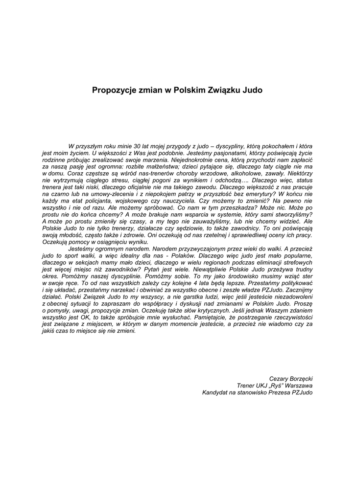 Propozycje zmian w Polskim Związku Judo W przyszłym roku minie 30 lat mojej przygody z judo – dyscypliny, którą pokochałem i która jest moim życiem. U większości z Was jest podobnie. Jesteśmy pasjonatami, którzy poświęcają życie rodzinne próbując zrealizować swoje marzenia. Niejednokrotnie cena, którą przychodzi nam zapłacić za naszą pasję jest ogromna: rozbite małżeństwa; dzieci pytające się, dlaczego taty ciągle nie ma w domu. Coraz częstsze są wśród nas-trenerów choroby wrzodowe, alkoholowe, zawały. Niektórzy nie wytrzymują ciągłego stresu, ciągłej pogoni za wynikiem i odchodzą…. Dlaczego więc, status trenera jest taki niski, dlaczego oficjalnie nie ma takiego zawodu. Dlaczego większość z nas pracuje na czarno lub na umowy-zlecenia i z niepokojem patrzy w przyszłość bez emerytury? W końcu nie każdy ma etat policjanta, wojskowego czy nauczyciela. Czy możemy to zmienić? Na pewno nie wszystko i nie od razu. Ale możemy spróbować. Co nam w tym przeszkadza? Może nic. Może po prostu nie do końca chcemy? A może brakuje nam wsparcia w systemie, który sami stworzyliśmy? A może po prostu zmieniły się czasy, a my tego nie zauważyliśmy, lub nie chcemy widzieć. Ale Polskie Judo to nie tylko trenerzy, działacze czy sędziowie, to także zawodnicy. To oni poświęcają swoją młodość, często także i zdrowie. Oni oczekują od nas rzetelnej i sprawiedliwej oceny ich pracy. Oczekują pomocy w osiągnięciu wyniku. Jesteśmy ogromnym narodem. Narodem przyzwyczajonym przez wieki do walki. A przecież judo to sport walki, a więc idealny dla nas - Polaków. Dlaczego więc judo jest mało popularne, dlaczego w sekcjach mamy mało dzieci, dlaczego w wielu regionach podczas eliminacji strefowych jest więcej miejsc niż zawodników? Pytań jest wiele. Niewątpliwie Polskie Judo przeżywa trudny okres. Pomóżmy naszej dyscyplinie. Pomóżmy sobie. To my jako środowisko musimy wziąć ster w swoje ręce. To od nas wszystkich zależy czy kolejne 4 lata będą lepsze. Przestańmy politykować i się układać, przestańmy narzekać i obwiniać za wszystko obecne i zeszłe władze PZJudo. Zacznijmy działać. Polski Związek Judo to my wszyscy, a nie garstka ludzi, więc jeśli jesteście niezadowoleni z obecnej sytuacji to zapraszam do współpracy i dyskusji nad zmianami w Polskim Judo. Proszę o pomysły, uwagi, propozycje zmian. Oczekuję także słów krytycznych. Jeśli jednak Waszym zdaniem wszystko jest OK, to także spróbujcie mnie wysłuchać. Pamiętajcie, że postrzeganie rzeczywistości jest związane z miejscem, w którym w danym momencie jesteście, a przecież nie wiadomo czy za jakiś czas to miejsce się nie zmieni. Cezary Borzęcki Trener UKJ „Ryś” Warszawa Kandydat na stanowisko Prezesa PZJudo SPIS TREŚCI CELE PODSTAWOWE ....................................................................................................................................... 3 PROGRAM SZCZEGÓŁOWY ........................................................................................................................... 4 PREZES, ZARZĄD, BIURO PZJUDO ...................................................................................................... 4 1. PREZES MA BYĆ KIEROWNIKIEM, MENEDŻEREM. POWINIEN NADZOROWAĆ PRAWIDŁOWE FUNKCJONOWANIE BIURA, WYZNACZAĆ ZADANIA SWOIM PRACOWNIKOM. ......................................................... 4 1.2 ZARZĄD TO GŁOWA NASZEGO ZWIĄZKU. A GŁOWA MUSI BYĆ ZDROWA. W ZARZĄDZIE POTRZEBA OSÓB, KTÓRE CHCĄ DZIAŁAĆ, A NIE TYLKO BYĆ CZŁONKAMI. ........................................................................................ 4 1.3 BIURO TO WIZYTÓWKA ZWIĄZKU. MUSI DZIAŁAĆ BEZ ZARZUTU. ............................................................ 4 1.1 2. SZKOLENIE ................................................................................................................................................. 5 2.1 2.2 2.3 2.4 UTWORZENIE SYSTEMU SZKOLENIA ......................................................................................................... 5 UTWORZENIE SYSTEMU SZKÓŁ I KLAS SPORTOWYCH ............................................................................... 6 POWOŁANIE KOMISJI SPORTU DZIECI. ....................................................................................................... 6 DZIAŁ SZKOLENIA .................................................................................................................................... 7 SYSTEM WSPÓŁZAWODNICTWA ......................................................................................................... 7 3. 3.1 3.2 3.3 3.4 3.5 4. ZMIANY W ORGANIZOWANIU ZAWODÓW CENTRALNYCH ......................................................................... 7 KALENDARZ IMPREZ MUSI BYĆ SPÓJNY Z PROGRAMEM SZKOLENIA ......................................................... 8 WPROWADZENIE DO RANKINGU WYBRANYCH ZAWODÓW KLUBOWYCH .................................................. 8 PODJĄĆ KOLEJNĄ PRÓBĘ STWORZENIE LIGI SENIORÓW I JUNIORÓW ......................................................... 8 MISTRZOSTWA EUROPY, PUCHARY ŚWIATA I MP MAJĄ BYĆ ŚWIĘTEM POLSKIEGO JUDO ....................... 8 REPREZENTACJA POLSKI I KADRA NARODOWA .......................................................................... 8 4.1 4.2 4.3 4.4 4.5 NALEŻY PODNIEŚĆ STATUS REPREZENTANTA POLSKI (RP) I ZAWODNIKÓW KN...................................... 8 TRENERZY KN ......................................................................................................................................... 9 KWALIFIKACJA DO ME, MŚ, ORAZ UDZIAŁ W TURNIEJACH EUJ POWINNY BYĆ JASNE I JAWNE ............... 9 POPRAWIĆ LOGISTYKĘ PRZY ORGANIZACJI WYJAZDÓW REPREZENTACJI NA ZAWODY ZAGRANICZNE ...... 9 ZNALEŹĆ SPONSORA DLA REPREZENTACJI ......................................................................