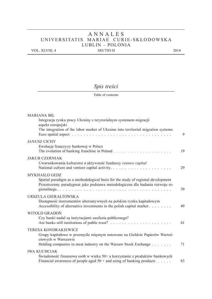 S p i s t r e ś c i ANNALES U N I V E R S I TAT I S M A R I A E C U R I E - S K Ł O D O W S K A LU BLI N – P OL ONIA VOL. XLVIII, 4 SECTIO H 2014 Spis treści Table of contents MARIANA BIL Integracja rynku pracy Ukrainy z terytorialnym systemem migracji: aspekt europejski The integration of the labor market of Ukraine into territorial migration systems: Euro spatial aspect . . . . . . . . . . . . . . . . . . . . . . . . . . . . . . . . . . . 9 JANUSZ CICHY Ewolucja franczyzy bankowej w Polsce The evolution of banking franchise in Poland. . . . . . . . . . . . . . . . . . . . . 19 JAKUB CZERNIAK Uwarunkowania kulturowe a aktywność funduszy venture capital National culture and venture capital activity. . . . . . . . . . . . . . . . . . . . . . 29 MYKHAILO GEDZ Spatial paradigm as a methodological basis for the study of regional development Przestrzenny paradygmat jako podstawa metodologiczna dla badania rozwoju regionalnego. . . . . . . . . . . . . . . . . . . . . . . . . . . . . . . . . . . . . . . . 39 URSZULA GIERAŁTOWSKA Dostępność instrumentów alternatywnych na polskim rynku kapitałowym Accessibility of alternative investments in the polish capital market. . . . . . . . . 49 WITOLD GRADOŃ Czy banki nadal są instytucjami zaufania publicznego? Are banks still institutions of public trust? . . . . . . . . . . . . . . . . . . . . . . 61 TERESA KONDRAKIEWICZ Grupy kapitałowe w przemyśle mięsnym notowane na Giełdzie Papierów Wartościowych w Warszawie Holding companies in meat industry on the Warsaw Stock Exchange . . . . . . . . 71 IWA KUCHCIAK Świadomość finansowa osób w wieku 50+ a korzystanie z produktów bankowych Financial awareness of people aged 50 + and using of banking products . . . . . . 83 6 Spis treści JACEK LISOWSKI, MARCIN WOJTKOWIAK Determinanty nabywania ubezpieczeń przez samorządy gminne w Polsce Determinants of the buying of insurance by the local governments in Poland. . . . 93 EWA ŁOSIEWICZ-DNIESTRZAŃSKA Ryzyko braku zgodności w banku Compliance in a bank. . . . . . . . . . . . . . . . . . . . . . . . . . . . . . . . . . 107 KRZYSZTOF ŁYSKAWA, MARCIN WOJTKOWIAK Ubezpieczenie odpowiedzialności cywilnej samorządu gminnego w Polsce General liability insurance of local government in Poland . . . . . . . . . . . . . . 117 AGNIESZKA MAJEWSKA Ustalanie ceny wykonania w programach opcji menedżerskich – praktyka spółek notowanych na GPW w Warszawie Determining the exercise price in employee stock options – the practice of companies listed on the Warsaw Stock Exchange . . . . . . . . . . . . . . . . . . . . . . . . . 131 KATARZYNA MIKOŁAJCZYK Wpływ procesu delewarowania na sektor bankowy w krajach Europy Środkowo-Wschodniej The impact of deleveraging on Central and East European banking sector . . . . . 141 MAGDALENA MOSIONEK-SCHWEDA, PRZEMYSŁAW PANFIL Finansowanie bankowości spółdzielczej w drodze emisji obligacji na rynku Catalyst Financing of cooperative banking through the issuance of bonds on the Catalyst market. . . . . . . . . . . . . . . . . . . . . . . . . . . . . . . . . . . . . . . . . . 153 ADAM NOSOWSKI Rola projektowania w tworzeniu usług finansowych The role of design in the financial services creation . . . . . . . . . . . . . . . . . 165 PRZEMYSŁAW PANFIL Nabywanie skarbowych papierów wartościowych przez NBP Purchases treasury securities by NBP . . . . . . . . . . . . . . . . . . . . . . . . . 177 PIOTR PODSIADŁO Pomoc publiczna w formie kapitału podwyższonego ryzyka udzielana przedsiębiorstwom sektora MŚP w krajach Unii Europejskiej The state aid in the form of risk capital granted to small and medium-sized enterprises in the European Union. . . . . . . . . . . . . . . . . . . . . . . . . . . . . . . . . 185 MICHAŁ POLASIK Perspektywy rozwoju mobilnych płatności NFC na rynku polskim The perspectives of development of NFC mobile payments in Poland . . . . . . . . 197 ULYANA Y. SADOVA, OLHA S. HRYNKEVYCH, STANISLAVA R. PASYEKA Evaluating working life quality in Ukraine in terms of business responsibility Ocena jakości życia osób pracujących na Ukrainie w aspekcie odpowiedzialności biznesu. . . . . . . . . . . . . . . . . . . . . . . . . . . . . . . . . . . . . . . . . . 209 DOROTA STARZYŃSKA Struktura kapitałowa przedsiębiorstw a współpraca ze sferą nauki w zakresie działalności innowacyjnej w świetle badań empirycznych Spis treści 7 Capital structure of companies and its impact on cooperation in the field of innovation with the science – the survey results. . . . . . . . . . . . . . . . . . . . . . . . . . 223 WOJCIECH STARZYŃSKI Leasing w systemie zamówień publicznych w Polsce – uwarunkowania i ocena Leasing in public procurement system in Poland – development and assessment . . 235 JOANNA ŚWIERK, SEBASTIAN BAJON Analiza procesu restrukturyzacji w PKP Intercity SA The analysis of restructuring process of PKP (Polish State Railways) Intercity SA. 245 EWA WIDZ Rejestracja i rozliczanie transakcji instrumentami pochodnymi OTC w Polsce Reporting and clearing of OTC derivatives in Poland. . . . . . . . . . . . . . . . . 255 STANISŁAW WIETESKA Obowiązkowe ubezpieczenie odpowiedzialności cywilnej rzeczoznawców majątkowych w Polsce Compulsory civil liability insurance of values. . . . . . . . . . . . . . . . . . . . . 265 MARIUSZ ZYGIEREWICZ Dylematy zmian instytucjonalnych w polskim sektorze banków spółdzielczych w świetle nowych europejskich regulacji nadzorczych oraz wyników ekonomicznych sektora Dilemma of institutional transformation of Polish cooperative bank sector in face of new prudential regulations for banks in Europe and economic results of cooperative banks in Poland. . . . . . . . . . . . . . . . . . . . . . . . . . . . . . . . . . . . . 275 RECENZJE Reviews JERZY WĘCŁAWSKI Recenzja podręcznika pod redakcją Ireny Pyki Bankowość komercyjna (Wydawnictwo Uniwersytetu Ekonomicznego w Katowicach, Katowice 2013, ss. 386). . . . . . . . . . . . . . . . . . . . . .