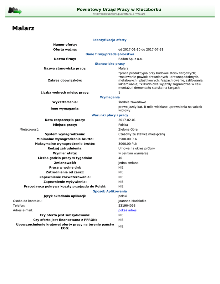 Powiatowy Urząd Pracy w Kluczborku http://pupkluczbork.pl/oferta/6167/malarz Malarz Identyfikacja oferty Numer oferty: Oferta ważna: od 2017-01-10 do 2017-07-31 Dane firmy/przedsiębiorstwa Nazwa firmy: Radon Sp. z o.o. Stanowisko pracy Nazwa stanowiska pracy: Malarz *praca produkcyjna przy budowie stoisk targowych; *malowanie powłok drewnianych i drewnopodobnych, metalowych i plastikowych; *szpachlowanie, szlifowanie, lakierowanie; *kilkudniowe wyjazdy zagraniczne w celu montażu i demontażu stoiska na targach Zakres obowiązków: Liczba wolnych miejsc pracy: 1 Wymagania Wykształcenie: średnie zawodowe prawo jazdy kat. B mile widziane uprawnienia na wózek widłowy Inne wymagania: Warunki płacy i pracy Data rozpoczęcia pracy: 2017-02-01 Miejsce pracy: Polska Miejscowość: Zielona Góra System wynagrodzenia: Czasowy ze stawką miesięczną Minimalne wynagrodzenie brutto: 2500.00 PLN Maksymalne wynagrodzenie brutto: 3000.00 PLN Rodzaj zatrudnienia: Umowa na okres próbny Wymiar etatu: w pełnym wymiarze Liczba godzin pracy w tygodniu: 40 Zmianowość: jedna zmiana Praca w wolne dni: NIE Zatrudnienie od zaraz: NIE Zapewnienie zakwaterowania: NIE Zapewnienie wyżywienia: NIE Pracodawca pokrywa koszty przejazdu do Polski: NIE Sposób Aplikowania Język składania aplikacji: polski Osoba do kontaktu: Joannna Madziołko Telefon: 531904068 Adres e-mail: pokaż adres Czy oferta jest subsydiowana: NIE Czy oferta jest finansowana z PFRON: NIE Upowszechnienie krajowej oferty pracy na terenie państw EOG: NIE