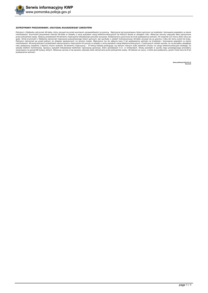Serwis informacyjny KWP www.pomorska.policja.gov.pl ZATRZYMANY POSZUKIWANY, USŁYSZAŁ KILKADZIESIĄT ZARZUTÓW Policjanci z Malborka zatrzymali 40-latka, który ukrywał się przed wymiarem sprawiedliwości za granicą. Mężczyzna był poszukiwany listem gończym za kradzieże i kierowanie pojazdem w stanie nietrzeźwości. Kryminalni poszukiwali również 40-latka w związku z serią wyłudzeń usług telekomunikacyjnych do których doszło w ubiegłym roku. Wówczas zarzuty usłyszały dwie zatrzymane przez policjantów osoby. Śledczy przedstawili 40-letniemu mężczyźnie kilkadziesiąt zarzutów oszustwa. Podejrzanemu grozi kara do 8 lat pozbawienia wolności. W czwartek (12 marca 2015 roku) po godz. 18-tej kryminalni z Malborka zatrzymali mężczyznę poszukiwanego listem gończym. Jak wynikało z ustaleń funkcjonariuszy 40-latek ukrywał się za granicą i kilka dni temu wrócił do kraju. Policjanci zatrzymali go przed jednym ze sklepów spożywczych na terenie miasta. Mężczyzna ma do odbycia karę 3 lat pozbawienia wolności za kradzieże i kierowanie pojazdem w stanie nietrzeźwości. Wczoraj policjanci przedstawili zatrzymanemu mężczyźnie 44 zarzuty w związku z serią wyłudzeń usług telekomunikacyjnych. Z policyjnych ustaleń wynika, że na początku ubiegłego roku podejrzany wspólnie z dwoma innymi osobami 35-letniemu mężczyzną i 37-letnią kobietą posługując się danymi różnych osób zawierali umowy na usługi telekomunikacyjne działając na szkodę telefonii komórkowej. Sprawcy wyłudzili kilkadziesiąt telefonów najnowszej generacji, które sprzedawali m.in. w lombardach. Straty powstałe w wyniku tego przestępczego procederu oszacowano na ponad 80 tysięcy złotych. Wówczas zarzuty w tej sprawie usłyszały dwie zatrzymane przez policjantów osoby. 40-latkowi za czyny, o które jest podejrzany, grozić może kara do 8 lat pozbawienia wolności. Data publikacji:2015-03-12 Rzecznik page 1 / 1 Powered by TCPDF (www.tcpdf.org)