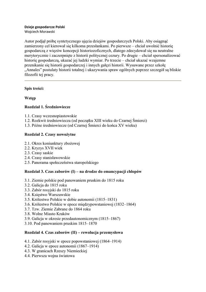 Dzieje gospodarcze Polski Wojciech Morawski Autor podjął próbę syntetycznego ujęcia dziejów gospodarczych Polski. Aby osiągnąć zamierzony cel kierował się kilkoma przesłankami. Po pierwsze – chciał uwolnić historię gospodarczą z więzów koncepcji historiozoficznych, dlatego zdecydował się na neutralne merytorycznie i zaczerpnięte z historii politycznej cezury. Po drugie – chciał spersonalizować historię gospodarczą, ukazać jej ludzki wymiar. Po trzecie – chciał ukazać wzajemne przenikanie się historii gospodarczej i innych gałęzi historii. Wysuwane przez szkołę „Annales” postulaty historii totalnej i ukazywania spraw ogólnych poprzez szczegół są bliskie filozofii tej pracy. Spis treści: Wstęp Rozdział 1. Średniowiecze 1.1. Czasy wczesnopiastowskie 1.2. Rozkwit średniowiecza (od początku XIII wieku do Czarnej Śmierci) 1.3. Późne średniowiecze (od Czarnej Śmierci do końca XV wieku) Rozdział 2. Czasy nowożytne 2.1. Okres koniunktury zbożowej 2.2. Kryzys XVII wiek 2.3. Czasy saskie 2.4. Czasy stanisławowskie 2.5. Panorama społeczeństwa staropolskiego Rozdział 3. Czas zaborów (I) – na drodze do emancypacji chłopów 3.1. Ziemie polskie pod panowaniem pruskim do 1815 roku 3.2. Galicja do 1815 roku 3.3. Zabór rosyjski do 1815 roku 3.4. Księstwo Warszawskie 3.5. Królestwo Polskie w dobie autonomii (1815–1831) 3.6. Królestwo Polskie w epoce międzypowstaniowej (1832–1864) 3.7. Tzw. Ziemie Zabrane do 1864 roku 3.8. Wolne Miasto Kraków 3.9. Galicja w okresie przedautonomicznym (1815–1867) 3.10. Pod panowaniem pruskim 1815–1870 Rozdział 4. Czas zaborów (II) – rewolucja przemysłowa 4.1. Zabór rosyjski w epoce popowstaniowej (1864–1914) 4.2. Galicja w epoce autonomii (1867–1914) 4.3. W granicach Rzeszy Niemieckiej 4.4. Pierwsza wojna światowa Rozdział 5. Druga Rzeczpospolita 5.1. Czas inflacji 5.2. Reformy Władysława Grabskiego 5.3. Druga stabilizacja 5.4. Wielki kryzys 5.5. Czas interwencjonizmu państwowego 5.6. Panorama gospodarki II Rzeczypospolitej 5.7. W obliczu wojny Rozdział 6. Druga wojna światowa Rozdział 7. Polska Ludowa (1944–1989) 7.1. Pierwsze lata powojenne 7.2. Okres stalinowski 7.3. Czasy Władysława Gomułki (1956–1970) 7.4. Czasy Edwarda Gierka (1970–1980) 7.5. Gospodarka polska w latach osiemdziesiątych Rozdział 8. Trzecia Rzeczpospolita (1989–2004) Spis tabel Wybrana bibliografia