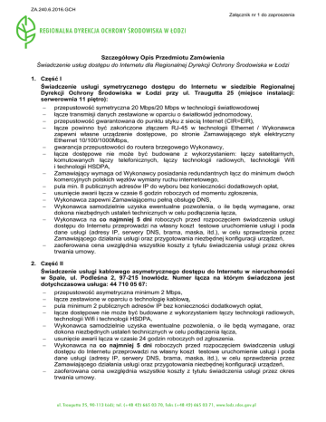 ZA.240.6.2016.GCH Załącznik nr 1 do zaproszenia Szczegółowy Opis Przedmiotu Zamówienia Świadczenie usług dostępu do Internetu dla Regionalnej Dyrekcji Ochrony Środowiska w Łodzi 1. Część I Świadczenie usługi symetrycznego dostępu do Internetu w siedzibie Regionalnej Dyrekcji Ochrony Środowiska w Łodzi przy ul. Traugutta 25 (miejsce instalacji: serwerownia 11 piętro): przepustowość symetryczna 20 Mbps/20 Mbps w technologii światłowodowej łącze transmisji danych zestawione w oparciu o światłowód jednomodowy, przepustowość gwarantowana do punktu styku z siecią Internet (CIR=EIR), łącze powinno być zakończone złączem RJ-45 w technologii Ethernet / Wykonawca zapewni własne urządzenie dostępowe, po stronie Zamawiającego styk elektryczny Ethernet 10/100/1000Mbps, gwarancja przepustowości do routera brzegowego Wykonawcy, łącze dostępowe nie może być budowane z wykorzystaniem: łączy satelitarnych, komutowanych łączy telefonicznych, łączy technologii radiowych, technologii Wifi i technologii HSDPA, Zamawiający wymaga od Wykonawcy posiadania redundantnych łącz do minimum dwóch komercyjnych polskich węzłów wymiany ruchu internetowego, pula min. 8 publicznych adresów IP do wyboru bez konieczności dodatkowych opłat, usunięcie awarii łącza w czasie 6 godzin roboczych od momentu zgłoszenia, Wykonawca zapewni Zamawiającemu pełną obsługę DNS, Wykonawca samodzielnie uzyska ewentualne pozwolenia, o ile będą wymagane, oraz dokona niezbędnych ustaleń technicznych w celu podłączenia łącza, Wykonawca na co najmniej 5 dni roboczych przed rozpoczęciem świadczenia usługi dostępu do Internetu przeprowadzi na własny koszt testowe uruchomienie usługi i poda dane usługi (adresy IP, serwery DNS, brama, maska, itd.), w celu sprawdzenia przez Zamawiającego działania usługi oraz przygotowania niezbędnej konfiguracji urządzeń, zaoferowana cena uwzględnia wszystkie koszty z tytułu świadczenia usługi przez okres trwania umowy. 2. Część II Świadczenie usługi kablowego asymetrycznego dostępu do Internetu w nieruchomości w Spale, ul. Podleśna 2, 97-215 Inowłódz. Numer łącza na którym świadczona jest dotychczasowa usługa: 44 710 05 67: przepustowość asymetryczna minimum 2 Mbps, łącze zestawione w oparciu o technologię kablową, pula minimum 2 publicznych adresów IP bez konieczności dodatkowych opłat, łącze dostępowe nie może być budowane z wykorzystaniem łączy technologii radiowych, technologii Wifi i technologii HSDPA, Wykonawca samodzielnie uzyska ewentualne pozwolenia, o ile będą wymagane, oraz dokona niezbędnych ustaleń technicznych w celu podłączenia łącza, usunięcie awarii łącza w czasie 24 godzin roboczych od zgłoszenia. Wykonawca na co najmniej 5 dni roboczych przed rozpoczęciem świadczenia usługi dostępu do Internetu przeprowadzi na własny koszt testowe uruchomienie usługi i poda dane usługi (adresy IP, serwery DNS, brama, maska, itd.), w celu sprawdzenia przez Zamawiającego działania usługi oraz przygotowania niezbędnej konfiguracji urządzeń, zaoferowana cena uwzględnia wszystkie koszty z tytułu świadczenia usługi przez okres trwania umowy.
