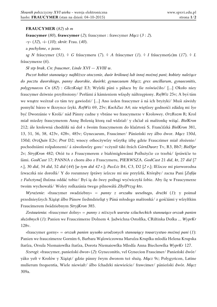 Słownik polszczyzny XVI wieku - wersja elektroniczna hasło: FRAUCYMER (stan na dzień: 04-10-2015) www.spxvi.edu.pl strona 1/2 FRAUCYMER (82) sb m fraucymer (80), frawcymer (2); fraucymer : frawcymer Mącz (3 : 2). -y- (32), -i- (10); skrót: Frau. (40). a pochylone, e jasne. sg N fråucymer (51). ◊ G fråucymeru (7). ◊ A fråucymer (1). ◊ I fråucymer(e)m (17). ◊ L fråucymerze (6). Sł stp brak, Cn: fraucmer, Linde XVI — XVIII w. Poczet kobiet stanowiący najbliższe otoczenie, dwór królowej lub innej możnej pani; kobiety należące do pocztu dworskiego, panny dworskie, dwórki; gynaecaeum Mącz; grex ancillarum, gynaeconitis, polygynaecos Cn (82) : GliczKsiąż E3; Wyſzłá páni s páłacu by ſie roświećiło/ [...] Około niey fraucymer dziwnie przyſtroiony/ Perłámi á kámieniem wſzędy náſtrzępiony. RejWiz 25v; A byś tám we wnątrz weźrzał co tám tey gawiedzi/ [...] Ano ieden fraucymer á ná ich bryżyki/ Muśi záwżdy pomylić bárzo w ſkrzynce ſzyki. RejWiz 69, 25v; KochZuz A4; nie więtſzey godnośći zdádzą mi ſye być Dworzánie v Krolá/ nád Pánny cudne y vbráne we fraucymerze v Krolowey. OrzRozm R; Krol miał miedzy fraucymerem Annę Bolenią ktorą rad widział/ y chćiał zá małżonkę wźiąć. BielKron 212; ále krolewná chodźiłá ná doł s ſwoim fraucymerem do klaſztorá S. Franćiſzká BielKron 381, 13, 51, 56, 58, 423v, 428v, 485v; Gynecaeum, Fraucimer/ Pánieński rey álbo dwor. Mącz 150d, 150d; OrzQuin E2v; Prot D2; wnocy othocżywſzy wſzytkę iżbę gdzie Frauczimer miał złożenie/ pochodniámi roſpalonemi/ á záwoławſzy gore/ vcżynił táki ſtrách GórnDworz Tv, R3, Bb7; BielSpr 2v; StryjKron 482; Otóż tu z Fraucymerem z białémigłowámi Poſłużyćie co trzebá/ ſpráwićie to ſámi. GosłCast 17; PANNA z choru ábo z Fraucymeru, PIERWSZA. GosłCast 21 did, kt, 27 did [7 r.], 30 did, 34 did, 52 did (44) [w tym did 42 r.]; PaxLiz B4, C3, D2 [2 r.]; IEſzcze mi pierworodna ſzwaczká nie doroſłá/ Y do rozumney ſpráwy ieſzcze mi nie przyſzłá, Którąby/ zacna Pani [Zofija z Fulsztyna] ſłuſzna oddáć tobie/ Byś ią do ſwey poſługi wyćwiczyłá ſobie. Aby ſię w Fraucymerze twoim wychowałá/ Woley roſkazánia twego pilnowáłá ZbylPrzyg ktv. Wyrażenie: »fraucymer swadziebny« = panny z orszaku weselnego, drużki (1): y poimał przednieyſzych Xiążąt álbo Pánow ſiedmdzieſiąt y Páná młodego małżonká/ z gośćiámi y wſzyſtkim Fraucimerem ſwádziebnym StryjKron 385. Zestawienia: »fraucymer dolny« = panny z niższych warstw szlacheckich stanowiące orszak panien służebnych (1): Panien we Frauczimerze Dolnem 4. Jadwichna Ostolſka, CRiſtinka Doſka ... WyprKr 128v. »fraucymer gorny« = orszak panien wysoko urodzonych stanowiący towarzystwo możnej pani (1): Panien we frauczimerze Gornim 6, Barbara Wąſowiczowna Maruſza Krupſka mlodſa Helena Krupska ſtarſza, Orsula Niemaiowſka ſtarſza, Dorota Niemaiowſka Mlodſa Anna Biechowſka WyprKr 127. Szeregi: »fraucymer, panieński dwor« (2): Gyneconitis, vel Gynecion Fraucimer/ Panieński dwór/ yáko yeſt v Krolów y Xiążąt/ gdzie pánny ſwym dworem też służą. Mącz 9c; Polygyricon, Latine mulierum frequentia, Wiele niewiaſt/ álbo ſchadzki niewieście/ frawcimer/ pánieński dwór. Mącz 309a. Słownik polszczyzny XVI wieku - wersja elektroniczna hasło: FRAUCYMER (stan na dzień: 04-10-2015) www.spxvi.edu.pl strona 2/2 »fraucymer abo (to jest) słuźebne panny (a. dziewki)« (2): á żeby thák ſámę [Hester]/ iáko fraucymer/ ábo ſlużebne pánny [pedisequas] iey/ przybrał y ozdobił. Leop Esth 2/9; Byłá tám żoná iedná ze trzech Sołtanowá máiąc fraucymer ſtroyny/ to ieſt dźiewki ſlużebne ktore zá nią chodźiły BielKron 458. [W przen żart.: Wyrażenie peryfr.: »fraucymer od świętego Marka« = prostytutki lub dom publiczny (1): O záwárćiu y oſádzeniu [przy oblężeniu miasta lub zamku] [...] Niewiáſty też k temu potrzebne. Szwácżká y z towarzyſzkámi [...] Też dwie mocne niewieśćie ſtáteczne dla ránnych á chorych [...] też pánny z Fraucymeru od świętego Márká ktoreby káżdemu k woli były [...] á zapłátę też ſłuſzną máią mieć ná dźień [...] áby ći co ſwe żony máią ſpokoynie z nimi ſypiáli/ á ći co bez tego być niechcą ábo niemogą/ áby wiedźieli gdźie obrokow ſzukáć ŁaskiSprRyc B.] Przen: Kobiety (2) : gdzyeby lepſſe piwo álbo wino/ álbo głádki fraucymer/ pánná/ páni/ dzyewká byłá. GliczKsiąż G6v; Flaminium, Bart/ Zasłoná álbo velum álbo nieyáki rąbek który przed czáſy/ Rzimski Fraucimer nośił. Mącz 130d. TG