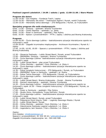 Festiwal Legend Lubelskich / 24.09 / sobota / godz. 12.00-21.00 / Stare Miasto Program dla dzieci: 11.00-14.00 – Gra miejska – Fundacja Trach / zapisy 12.00-16.00 – Warsztaty dla dzieci – malowanie legend / Rynek, wokół Trybunału 12.00-15.00 – Warsztaty tańca dawnego – ZTD Beliguardo / Rynek, za Trybunałem Specjalny program dla osób niesłyszących: Godz. 13.00 – Dintojra – spektakl / Brama Trynitarska Godz. 14.00 – Córka Złotnika – spektakl / ul. Złota Godz. 15.00 – Pożar w Zamtuzie – spektakl / Plac Rybny Godz. 16.00 – Spacer z przewodnikiem – PTTK / zapisy / zbiórka pod Bramą Krakowską Program: 12.00-20.00 – Życie dawnego Lublina – teatralizowane sytuacje interaktywne oparte na motywach z epok 12.00-20.00 – Zagadki kryminalne międzywojnia – Archiwum Kryminalne / Rynek 8 / zapisy 12.00, 14.00, 16.00, 18.00 – Spacery z przewodnikiem - PTTK / zapisy / zbiórka pod Bramą Krakowską 12.30 – Otwarcie Festiwalu – Lublin Street Band / Rynek, przed Trybunałem 13.00 – PREMIERA: Dintojra – spektakl / Brama Trynitarska 13.20 – Życie dawnego Lublina– teatralizowane sytuacje interaktywne oparte na motywach z epok 13.30 – Lublin Street Band – plac przed Trybunałem 14.00 – Córka Złotnika – spektakl / Dom Złotnika / ul. Złota 4 14.20 – Życie dawnego Lublina – teatralizowane sytuacje interaktywne oparte na motywach z epok 14.30 – Pokaz żonglerki historycznej – ZTD Beliguardo / Rynek, za Trybunałem 15.00 – PREMIERA: Pożar w Zamtuzie – spektakl / pl. Rybny 15.00 – Pokaz Tańca Dawnego – ZTD Beliguardo / Rynek, za Trybunałemu 15.20 – Życie dawnego Lublina – teatralizowane sytuacje interaktywne oparte na motywach z epok 15.30 – Lublin Street Band / Brama Krakowska – Rynek – Brama Trynitarska 16.00 – Kamień nieszczęścia – spektakl / Brama Trynitarska 16.20 – Życie dawnego Lublina – teatralizowane sytuacje interaktywne oparte na motywach z epok 16.30 – Pokaz żonglerki historycznej – ZTD Beliguardo / Rynek, za Trybunałem 17.00 – Pożar w Zamtuzie – spektakl / Plac Rybny 17.00 – Studio Dono, Komedianty Trupa Dell’arte / Rynek 17.20 – Życie dawnego Lublina – teatralizowane sytuacje interaktywne oparte na motywach z epok 17.30 – Lublin Street Band / Rynek, przed Trybunałem 18.00 – Poławiacze Pereł Improv Teatr – Legendy Dawnego Miasta / Rynek 19.15 – Lublin Street Band / Rynek 20.00 – Córka Złotnika – spektakl / Dom Złotnika / ul. Złota 4 20.30 – Zakończenie Festiwalu Legend Lubelskich / ul. Złota 21.00 – Legendarny Jam Session / Pub u Złotnika / ul. Złota 4 Zapisy: Gra miejska: [email protected] Spacery z przewodnikiem: 81 532 49 42 / [email protected] Zagadki Kryminalne międzywojnia: tel.: 504 440 508