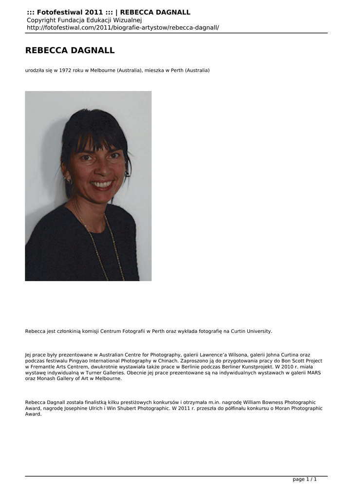 ::: Fotofestiwal 2011 ::: | REBECCA DAGNALL Copyright Fundacja Edukacji Wizualnej http://fotofestiwal.com/2011/biografie-artystow/rebecca-dagnall/ REBECCA DAGNALL urodziła się w 1972 roku w Melbourne (Australia), mieszka w Perth (Australia) Rebecca jest członkinią komisji Centrum Fotografii w Perth oraz wykłada fotografię na Curtin University. Jej prace były prezentowane w Australian Centre for Photography, galerii Lawrence’a Wilsona, galerii Johna Curtina oraz podczas festiwalu Pingyao International Photography w Chinach. Zaproszono ją do przygotowania pracy do Bon Scott Project w Fremantle Arts Centrem, dwukrotnie wystawiała także prace w Berlinie podczas Berliner Kunstprojekt. W 2010 r. miała wystawę indywidualną w Turner Galleries. Obecnie jej prace prezentowane są na indywidualnych wystawach w galerii MARS oraz Monash Gallery of Art w Melbourne. Rebecca Dagnall została finalistką kilku prestiżowych konkursów i otrzymała m.in. nagrodę William Bowness Photographic Award, nagrodę Josephine Ulrich i Win Shubert Photographic. W 2011 r. przeszła do półfinału konkursu o Moran Photographic Award. page 1 / 1