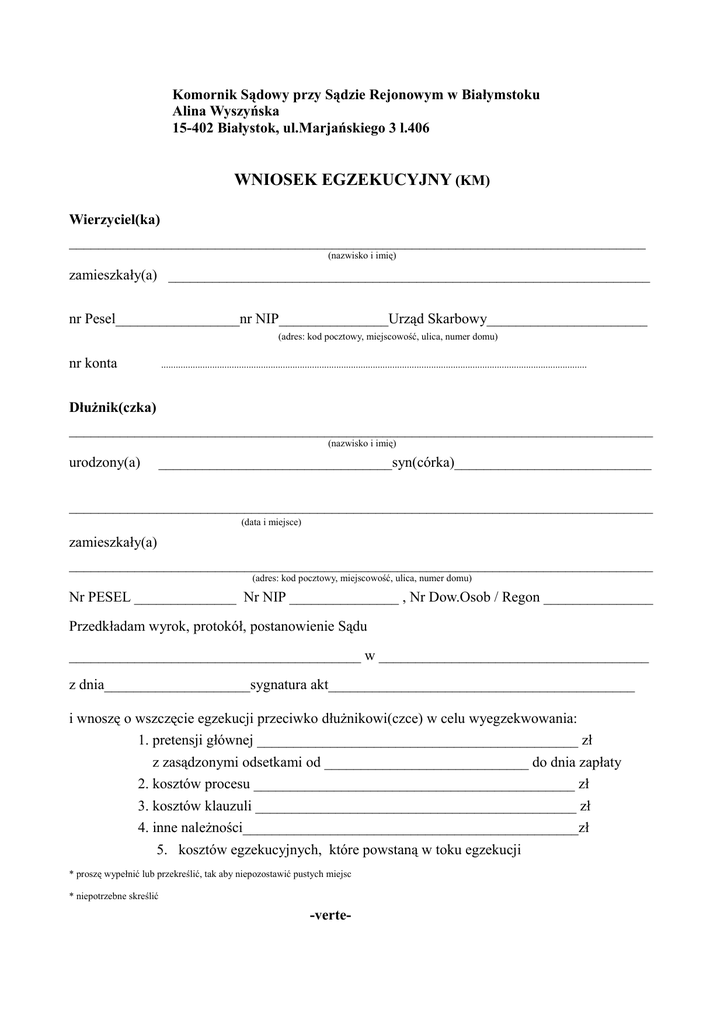 Komornik Sądowy przy Sądzie Rejonowym w Białymstoku Alina Wyszyńska 15-402 Białystok, ul.Marjańskiego 3 l.406 WNIOSEK EGZEKUCYJNY (KM) Wierzyciel(ka) _______________________________________________________________________________ (nazwisko i imię) zamieszkały(a) __________________________________________________________________ nr Pesel_________________nr NIP_______________Urząd Skarbowy______________________ (adres: kod pocztowy, miejscowość, ulica, numer domu) nr konta ............................................................................................................................................................................... Dłużnik(czka) ________________________________________________________________________________ (nazwisko i imię) urodzony(a) ________________________________syn(córka)___________________________ ________________________________________________________________________________ (data i miejsce) zamieszkały(a) ________________________________________________________________________________ (adres: kod pocztowy, miejscowość, ulica, numer domu) Nr PESEL ______________ Nr NIP _______________ , Nr Dow.Osob / Regon _______________ Przedkładam wyrok, protokół, postanowienie Sądu ________________________________________ w _____________________________________ z dnia____________________sygnatura akt__________________________________________ i wnoszę o wszczęcie egzekucji przeciwko dłużnikowi(czce) w celu wyegzekwowania: 1. pretensji głównej ____________________________________________ zł z zasądzonymi odsetkami od ____________________________ do dnia zapłaty 2. kosztów procesu ____________________________________________ zł 3. kosztów klauzuli ____________________________________________ zł 4. inne należności______________________________________________zł 5. kosztów egzekucyjnych, które powstaną w toku egzekucji * proszę wypełnić lub przekreślić, tak aby niepozostawić pustych miejsc * niepotrzebne skreślić -verte- Egzekucję proszę prowadzić według następujących sposobów:z ruchomości, z wierzytelności, z rachunków bankowych, wynagrodzenia za pracę, a zwłaszcza proszę skierować ja do: - wynagrodzenia dłużnika***________________________________________________________ - ruchomości dłuznika***___________________________________________________________ - rachunku bankowego dłużnika***___________________________________________________ - innych wierzytelnośći i praw majatkowych***_________________________________________ _______________________________________________________________________________ ***jeżeli wierzyciel nie ma wiedzy w tym zakresie, należy wpisać „w/g ustaleń komornika“ Informacje o dłużniku:**** 1.posiada samochód (marka, nr rej.)___________________________________________________ 2. posiada wartościoweruchomości____________________________________________________ 3.prowadzi działalność gospodarczą___________________________________________________ 4.jest właścicielem działki budowlanej, domu, garażu,mieszkania:___________________________ 5.posiada udziały w spółkach, spółdzielniach itp_________________________________________ 6. inne __________________________________________________________________________ ****jeżeli wierzyciel nie ma wiedzy w tym zakresie, należy wpisać „nie wiem“ Wyboru komornika dokonano na podstawie art. 8 ustawy o komornikach sądowych i egzekucji z dnia 29 sierpnia 1997 r. Oświadczam, że zostałem (am) pouczony(a) zgodnie z art. 136 kpc o obowiazku zawiadomienia o każdej zmianie miejsca swojego zamieszkania i wiem, że w razie zaniedbania tego obowiązku pisma kierowane do mojej osoby pozostaną w aktach sprawy ze skutkiem doręczenia. Zlecam komornikowi Sadowemu przy Sądzie rejonowym w białymstoku Alinie Wyszyńskiej poszukiwanie majatku dłużnika stosownie do art. 53a ust.1 ustawy o komornkach sądowych i egzekucji z dnia 29 sierpnia 1997 r. (dz.U. Nr 133, poz.88 ze zm.) w brzmieniu nadanym ustawą z dnia 24 maja 2007 r o zmianie ustawy o komornkach sądowych i egzekucji oraz niektórych innych ustaw dz.U. Nr 112, poz.769). _____________________________________ (data i podpis wierzyciela)