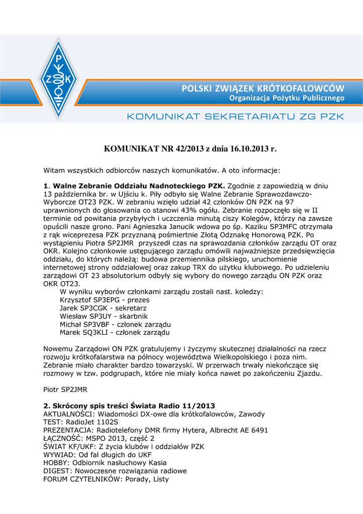 KOMUNIKAT NR 42/2013 z dnia 16.10.2013 r.