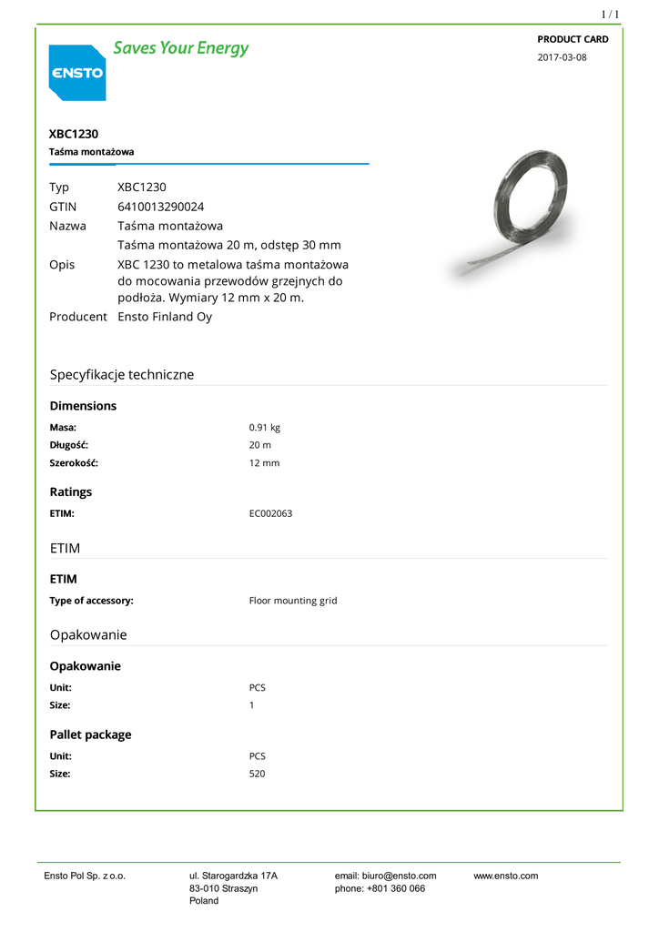 1/1 PRODUCT CARD 2017-03-08 XBC1230 Taśma montażowa Typ GTIN Nazwa XBC1230 6410013290024 Taśma montażowa Taśma montażowa 20 m, odstęp 30 mm Opis XBC 1230 to metalowa taśma montażowa do mocowania przewodów grzejnych do podłoża. Wymiary 12 mm x 20 m. Producent Ensto Finland Oy Specyfikacje techniczne Dimensions Masa: Długość: Szerokość: 0.91 kg 20 m 12 mm Ratings ETIM: EC002063 ETIM ETIM Type of accessory: Floor mounting grid Opakowanie Opakowanie Unit: Size: PCS 1 Pallet package Unit: Size: Ensto Pol Sp. z o.o. PCS 520 ul. Starogardzka 17A 83-010 Straszyn Poland email: [email protected] phone: +801 360 066 www.ensto.com