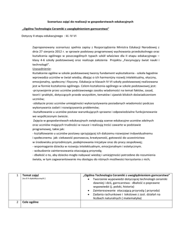 Scenariusz zajęć do realizacji w gospodarstwach edukacyjnych „Ogólna Technologia Ceramiki z uwzględnieniem garncarstwa” Dotyczy II etapu edukacyjnego : kl. IV-VI Zaproponowany scenariusz spełnia zapisy z Rozporządzenia Ministra Edukacji Narodowej z dnia 27 sierpnia 2012 r. w sprawie podstawy programowej wychowania przedszkolnego oraz kształcenia ogólnego w poszczególnych typach szkół właściwe dla II etapu edukacyjnego – klasy 4-6 szkoły podstawowej oraz realizuje założenia Projektu „Fascynujący świat nauki i technologii”. Uzasadnienie: Kształcenie ogólne w szkole podstawowej tworzy fundament wykształcenia - szkoła łagodnie wprowadza uczniów w świat wiedzy, dbając o ich harmonijny rozwój intelektualny, etyczny, emocjonalny, społeczny i fizyczny. Edukacja w klasach IV-VI szkoły podstawowej realizowana jest w formie kształcenia ogólnego. Celem kształcenia ogólnego w szkole podstawowej jest: -przyswojenie przez uczniów podstawowego zasobu wiadomości na temat faktów, zasad, teorii i praktyki, dotyczących przede wszystkim, tematów i zjawisk bliskich doświadczeniom uczniów; -zdobycie przez uczniów umiejętności wykorzystywania posiadanych wiadomości podczas wykonywania zadań i rozwiązywania problemów; -kształtowanie u uczniów postaw warunkujących sprawne i odpowiedzialne funkcjonowanie we współczesnym świecie. Zajęcia w gospodarstwach edukacyjnych zwiększają szanse edukacyjne uczniów zdolnych oraz uczniów mających trudności w nauce i realizują treści zawarte w podstawie programowej, takie jak: - kształtowanie u uczniów postawy sprzyjającej ich dalszemu rozwojowi indywidualnemu i społecznemu jak: ciekawość poznawcza, kreatywność, gotowość do uczestnictwa w środowisku przyrodniczym, podejmowania inicjatyw oraz do pracy zespołowej; - wspomaganie dziecka w rozwoju intelektualnym, emocjonalnym i estetycznym. - wzbudzenie zainteresowania otaczającą przyrodą; - dbałość o to, aby dziecko mogło nabywać wiedzę i umiejętności potrzebne do rozumienia świata, w tym zagwarantowanie mu dostępu do różnych możliwości korzystania z nich; 1 Temat zajęć (na 6 h dydaktycznych ) 2 Cele ogólne „Ogólna Technologia Ceramiki z uwzględnieniem garncarstwa” Tworzenie wypowiedzi dotyczącej technologii ceramiki dawniej i dziś, garncarstwa - dbałość o poprawne wypowiedzi (j. polski, historia) Zainteresowanie otaczającą przyrodą ( przyroda) Zadania rachunkowe i tekstowe z zast. działań na liczbach naturalnych ( matematyka) 3 Metody i techniki pracy-służące osiągnięciu efektów opisanych w celach szczegółowych 5 wspomaganie wszechstronnego rozwoju uczniów poprzez działalność artystyczno - manualną umożliwienie uczniom zdobywania nowych wiadomości i umiejętności z dziedziny matematyki i przyrody zapoznanie uczniów z technikami charakterystycznymi dla ceramiki oraz kształtowanie podstawowych umiejętności w tej dziedzinie. kształtowanie potrzeby pożytecznego i łatwego przyswajania wiedzy Cele szczegółowe (określające umiejętności uczniów jakie nabędą w ramach zajęć) 4 Materiały dydaktyczne oraz środki (itp. Prezentacje, teksty, karty pracy, słuchowiska, filmy, nagrania itp.) Uczeń: rozwija wyobraźnię, wrażliwość i twórczość ekspresji zna techniki i technologie ceramiczne doskonali sprawność manualną rozwija umiejętności twórczego rozwiązywania problemów kształtuje umiejętność projektowania i przedstawiania kompozycji na płaszczyźnie i w bryle potrafi koncentrować uwagę na wykonywanym zadaniu potrafi kreatywnie i twórczo myśleć rozwija umiejętność pracy zespołowej oraz osiągania zamierzonego celu podnosi swoje umiejętności dzięki wymianie wiedzy z uczestnikami zajęć w pracy zespołowej słowna aktywizująca – praktyczna, warsztatowa oglądowa Forma pracy ;grupowa i indywidualna modele maszyn ceramicznych literatura pomocnicza ( broszury, przykładowe ćwiczenia, karty pracy..) koła garncarskie sprzęt laboratoryjny masy i szkliwa ceramiczne 6 Przebieg zajęć Opis, jak powinny wyglądać warsztaty-może być np. z podziałem na wstęp, część główną i końcową. Powinien zawierać takie elementy jak: - sformułowanie problemu, - zmotywowanie do pracy nad jego rozwiązaniem z pomocą różnorodnych metod i technik pracy (im bardziej zróżnicowane zadania, tym lepsze efekty kształcenia) ukierunkowanych na odkrywanie, przeżywanie, analizowanie, dociekanie, dyskusję, zabawę, doświadczenie, eksperyment… - rozwiązanie problemu - wspólne podsumowanie zajęć - końcowe uznanie wspólnych osiągnięć pomocnicze narzędzia drewniane formy gipsowe przybory do pisania, tablica, papier I. Wstęp - powitanie uczniów, omówienie zasad bezpieczeństwa i zachowania podczas zajęć -przedstawienie planu zajęć II. Faza realizacji: - omówienie procesu technologicznego przerobu gliny oraz produkcji wyrobów ceramicznych na przykładzie modeli maszyn Część główna Pracowania podzielona będzie na 5 stanowisk przy każdym stanowisku znajdować się będzie 8-10 osób. Każda grupa w czasie 45 min będzie miała za zadanie wykonanie ściśle określonych zadań przedstawionych w instrukcji pracy, która będzie znajdować się przy każdym stanowisku. Po ukończeniu pracy, nastąpi przerwa, po której dana grupa będzie przystępowała do następnego stanowiska i wykona kolejne zadanie. Każda grupa ukończy swoja zajęcia, po wykonaniu zadania na każdym stanowisku. Stanowisko laboratoryjne – zapoznanie z instrukcją pracy, wykonywanie prostego badania gęstości masy lejnej przy pomocy aerometru, badanie ciężaru właściwego masy lejnej za pomocą wagi, badanie spływności masy lejnej za pomocą kubeczka „Forda”, Obliczanie skurczliwości gliny po wysuszeniu oraz po wypaleniu (różnych gatunków glin plastycznej, średnioplastycznej, chudej) Badanie czasu wiązania gipsu przy pomocy aparatu Vicata- (zróżnicowane zadania dos
