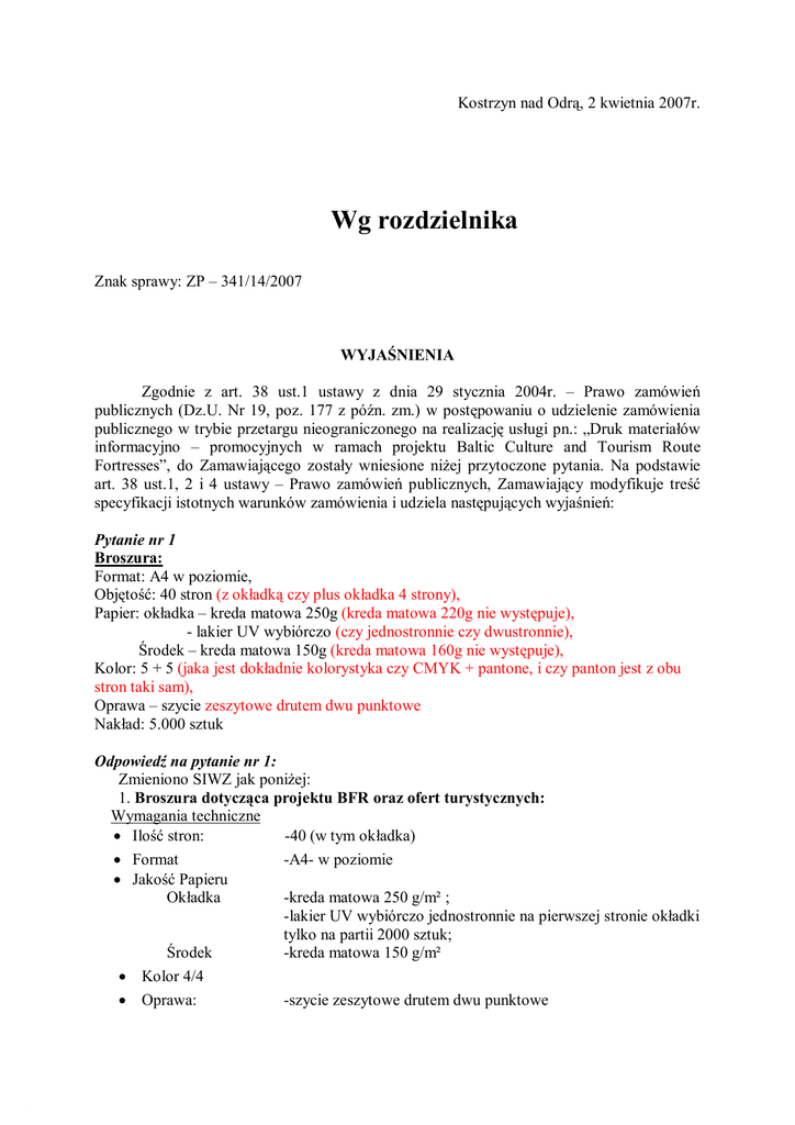 Kostrzyn nad Odrą, 2 kwietnia 2007r. Wg rozdzielnika Znak sprawy: ZP – 341/14/2007 WYJAŚNIENIA Zgodnie z art. 38 ust.1 ustawy z dnia 29 stycznia 2004r. – Prawo zamówień publicznych (Dz.U. Nr 19, poz. 177 z późn. zm.) w postępowaniu o udzielenie zamówienia publicznego w trybie przetargu nieograniczonego na realizację usługi pn.: „Druk materiałów informacyjno – promocyjnych w ramach projektu Baltic Culture and Tourism Route Fortresses”, do Zamawiającego zostały wniesione niżej przytoczone pytania. Na podstawie art. 38 ust.1, 2 i 4 ustawy – Prawo zamówień publicznych, Zamawiający modyfikuje treść specyfikacji istotnych warunków zamówienia i udziela następujących wyjaśnień: Pytanie nr 1 Broszura: Format: A4 w poziomie, Objętość: 40 stron (z okładką czy plus okładka 4 strony), Papier: okładka – kreda matowa 250g (kreda matowa 220g nie występuje), - lakier UV wybiórczo (czy jednostronnie czy dwustronnie), Środek – kreda matowa 150g (kreda matowa 160g nie występuje), Kolor: 5 + 5 (jaka jest dokładnie kolorystyka czy CMYK + pantone, i czy panton jest z obu stron taki sam), Oprawa – szycie zeszytowe drutem dwu punktowe Nakład: 5.000 sztuk Odpowiedź na pytanie nr 1: Zmieniono SIWZ jak poniżej: 1. Broszura dotycząca projektu BFR oraz ofert turystycznych: Wymagania techniczne • Ilość stron: -40 (w tym okładka) • Format -A4- w poziomie • Jakość Papieru Okładka -kreda matowa 250 g/m² ; -lakier UV wybiórczo jednostronnie na pierwszej stronie okładki tylko na partii 2000 sztuk; Środek -kreda matowa 150 g/m² • Kolor 4/4 • Oprawa: -szycie zeszytowe drutem dwu punktowe • Nakład 5.000 egz (w tym 2000 sztuk z lakierem UV wybiórczo jednostronnie) Pytanie nr 2 Ulotka: Format: A3 po rozłożeniu (docelowy 297 x 140 mm, jak ulotka ma być bigowana tzn. złożona czy tzw. „U” czy „Z”) Papier: kreda matowa 250g, Lakier UV wybiórczo (z jednej strony, czy z obu), Kolor: 5 + 5 (jaka jest dokładnie kolorystyka czy CMYK + pantone, i czy panton jest z obu stron taki sam), Nakład: 5.000 sztuk Odpowiedź na pytanie nr 2: Zmieniono SIWZ jak poniżej: 2. Ulotka A3 dotyczący projektu BFR Wymagania techniczne • Ilość stron: -2 • Format -A3 po rozłożeniu; złożony na trzy części w formie „U”; -docelowy format 297 mm x 140 mm (wysokość x szerokość) • Jakość papieru -kreda matowa 250 g/m²; -lakier UV wybiórczo jednostronnie tylko na partii 2000 sztuk; -2 przegniecenia (bigi) • Kolor 4/4 • Nakład 5.000 egz (w tym 2000 sztuk z lakierem UV wybiórczo jednostronnie). Pytanie nr 3 Ulotka: Format: 380 x 210 mm po rozłożeniu (docelowy format 95 x 210 mm, falc 4 łamy), Papier: kreda matowa 150g (kreda matowa 160g nie występuje), Lakier UV wybiórczo (z jednej strony, czy z obu), Kolor: 5 + 5 (jaka jest dokładnie kolorystyka czy CMYK + pantone, i czy panton jest z obu stron taki sam), Nakład: 15.000 sztuk Odpowiedź na pytanie nr 3: Zmieniono SIWZ jak poniżej: 3. Ulotka (format 380 mm – szerokość / 210 mm - wysokość) dotyczący produktu turystycznego w ramach projektu BFR Wymagania techniczne • Ilość stron: -2 • Format -380 mm x 210 mm po rozłożeniu; -złożony na cztery części w formie „Z” (4 łamy) • Jakość papieru -kreda matowa 150 g/m² • Kolor 4/4 • Nakład 15.000 egz Pytanie nr 4 Biuletyn informacyjny: Format: A4, Objętość: 8 stron (z okładką czy plus okładka 4 strony), Papier: kreda 150g (kreda matowa 160g nie występuje), Kolor: 5 + 5 (jaka jest dokładnie kolorystyka czy CMYK + pantone, i czy panton jest z obu stron taki sam), Nakład: 3 edycje po 3.000 sztuk Odpowiedź na pytanie nr 4: Zmieniono SIWZ jak poniżej: 4. Biuletyn informacyjny A4 (3 edycje) Wymagania techniczne • Ilość stron: -8 (w tym okładka) • Format -A4 • Jakość papieru -kreda matowa 150 g/m² • Kolor 4/4 • Nakład 3.000 egz. x 3 edycje Pytanie nr 5 Plakat: Format: A1, Papier: kreda błysk 200g, Kolor: 5 + 5 (jaka jest dokładnie kolorystyka czy CMYK + pantone, i czy panton jest z obu stron taki sam), Nakład: 500 sztuk Odpowiedź na pytanie nr 5: Zmieniono SIWZ jak poniżej: 5. Plakat projektu BFR Instrukcje techniczne • Format A1 • Jakość papieru kreda błysk (glossy) 200 g/m² połysk • Kolor 4/0 • Nakład 500 egz. Pytanie nr 6 Teczka ofertowa: Format: docelowy, po złożeniu 305 x 215 mm Papier: kreda matowa 250g, Lakier UV wybiórczo (z jednej strony, czy z obu), Kolor: 5 + 5 (jaka jest dokładnie kolorystyka czy CMYK + pantone, i czy panton jest z obu stron taki sam), Nakład: 4.000 sztuk Odpowiedź na pytanie nr 6: Zmieniono SIWZ jak poniżej: 6. Teczki na materiały promocyjno-informacyjne Instrukcje techniczne • Format: docelowy po złożeniu 306 mm x 215 mm x 5 mm (wysokość x szerokość x grubość) grzbiet 5 mm wzór wykroju teczki zamieszczony poniżej • Jakość papieru karton 300 g/m² dwustronnie bielony; jednostronnie foliowany folią matową na stronie zewnętrznej; lakier UV wybiórczo jednostronnie na przedniej i tylnej stronie strony zewnętrznej na partii 1000 sztuk • Kolor 4/4 • Nakład 4.000 egz (w tym 1000 sztuk z lakierem UV wybiórczo jednostronnie) Dodatkowe wyjaśnienie: Kolor 4/4 lub 4/0 oznacza zastosowanie koloru z przestrzeni kolorystycznej CMYK EUROSCALA Pytanie nr 7 Podpunkt 2.1 opisu przedmiotu zamówienia: broszura 1. Czy objętość broszury to 40 stron razem z okładką? 2. Czy kolor 5/5 oznacza CMYK+1 kolor Pantone? Jeśli Pantone to czy będzie to kolor srebrny lub złoty? Odpowiedź na pytanie nr 7: Zmieniono SIWZ jak poniżej: 1. Broszura dotycząca projektu BFR oraz ofert turystycznych: Wymagania techniczne • Ilość stron: • Format • Jakość Papieru Okładka -40 (w tym okładka) -A4- w poziomie -kreda matowa 250 g/m² ; -lakier UV wybiórczo jednostronnie na pierwszej stronie okładki tylko na partii 2000 sztuk; -kreda matowa 150 g/m² Środek • Kolor 4/4 • Oprawa: -szycie zeszytowe drutem dwu punktowe • N