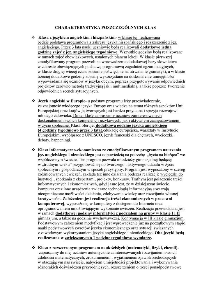 CHARAKTERYSTYKA POSZCZEGÓLNYCH KLAS Klasa z językiem