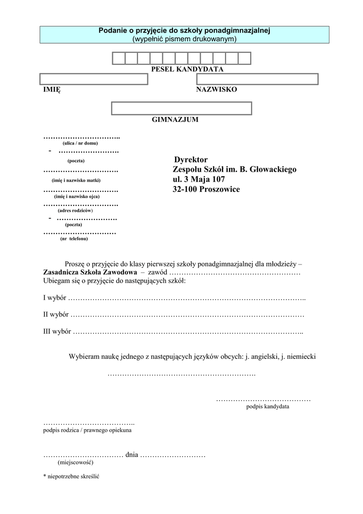 Podanie o przyjęcie do szkoły ponadgimnazjalnej (wypełnić pismem drukowanym) PESEL KANDYDATA IMIĘ NAZWISKO GIMNAZJUM ………………………….. (ulica / nr domu) - ……………………. (poczta) …………………………. (imię i nazwisko matki) …………………………. Dyrektor Zespołu Szkół im. B. Głowackiego ul. 3 Maja 107 32-100 Proszowice (imię i nazwisko ojca) …………………………. (adres rodziców) - ……………………. (poczta) ………………………… (nr telefonu) Proszę o przyjęcie do klasy pierwszej szkoły ponadgimnazjalnej dla młodzieŜy – Zasadnicza Szkoła Zawodowa – zawód ……………………………………………… Ubiegam się o przyjęcie do następujących szkół: I wybór …………………………………………………………………………………….. II wybór …………………………………………………………………………………… III wybór ………………………………………………………………………………….. Wybieram naukę jednego z następujących języków obcych: j. angielski, j. niemiecki ……………………………………………………. ………………………………… podpis kandydata ……………………………….. podpis rodzica / prawnego opiekuna …………………………… dnia ……………………… (miejscowość) * niepotrzebne skreślić