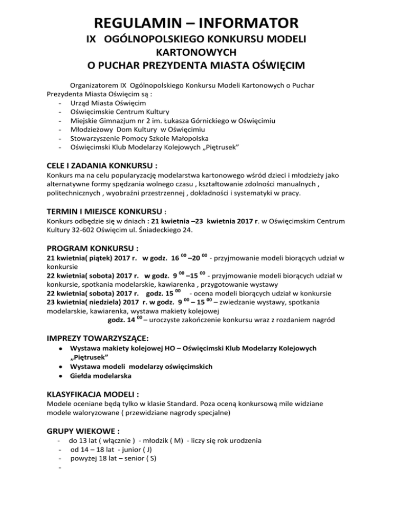 REGULAMIN – INFORMATOR IX OGÓLNOPOLSKIEGO KONKURSU MODELI KARTONOWYCH O PUCHAR PREZYDENTA MIASTA OŚWIĘCIM Organizatorem IX Ogólnopolskiego Konkursu Modeli Kartonowych o Puchar Prezydenta Miasta Oświęcim są : - Urząd Miasta Oświęcim - Oświęcimskie Centrum Kultury - Miejskie Gimnazjum nr 2 im. Łukasza Górnickiego w Oświęcimiu - Młodzieżowy Dom Kultury w Oświęcimiu - Stowarzyszenie Pomocy Szkole Małopolska - Oświęcimski Klub Modelarzy Kolejowych „Piętrusek” CELE I ZADANIA KONKURSU : Konkurs ma na celu popularyzację modelarstwa kartonowego wśród dzieci i młodzieży jako alternatywne formy spędzania wolnego czasu , kształtowanie zdolności manualnych , politechnicznych , wyobraźni przestrzennej , dokładności i systematyki w pracy. TERMIN I MIEJSCE KONKURSU : Konkurs odbędzie się w dniach : 21 kwietnia –23 kwietnia 2017 r. w Oświęcimskim Centrum Kultury 32-602 Oświęcim ul. Śniadeckiego 24. PROGRAM KONKURSU : 21 kwietnia( piątek) 2017 r. w godz. 16 00 –20 00 - przyjmowanie modeli biorących udział w konkursie 22 kwietnia( sobota) 2017 r. w godz. 9 00 –15 00 - przyjmowanie modeli biorących udział w konkursie, spotkania modelarskie, kawiarenka , przygotowanie wystawy 22 kwietnia( sobota) 2017 r. godz. 15 00 - ocena modeli biorących udział w konkursie 23 kwietnia( niedziela) 2017 r. w godz. 9 00 – 15 00 – zwiedzanie wystawy, spotkania modelarskie, kawiarenka, wystawa makiety kolejowej godz. 14 00 – uroczyste zakooczenie konkursu wraz z rozdaniem nagród IMPREZY TOWARZYSZĄCE: Wystawa makiety kolejowej HO – Oświęcimski Klub Modelarzy Kolejowych „Piętrusek” Wystawa modeli modelarzy oświęcimskich Giełda modelarska KLASYFIKACJA MODELI : Modele oceniane będą tylko w klasie Standard. Poza oceną konkursową mile widziane modele waloryzowane ( przewidziane nagrody specjalne) GRUPY WIEKOWE : - do 13 lat ( włącznie ) - młodzik ( M) - liczy się rok urodzenia - od 14 – 18 lat - junior ( J) - powyżej 18 lat – senior ( S) - KLASY MODELI : - statki , okręty ( MP) żaglowce ( MŻ) samoloty jednosilnikowe śmigłowe (S1) samoloty wielosilnikowe śmigłowe ( S2) odrzutowce( S3) śmigłowce( S4) pojazdy kołowe , szynowe ( PK) pojazdy gąsienicowe( PG) artyleria(MA) budowle ( MB) budowle kolejowe( MK) figurki ( MF) rakiety ( MR) POSTANOWIENIA OGÓLNE : 1. 2. 3. 4. Udział biorą modelarze indywidualni , modelarnie , kluby modelarskie. Wystawiane modele mogą pochodzid z wycinanek polskich i zagranicznych. Mile widziane modele wystawiane po raz pierwszy. W przypadku wątpliwości co do autorstwa zgłoszonego modelu organizatorzy przewidują rozmowy wyjaśniające z zawodnikiem. 5. Każdy uczestnik może zgłosid do konkursu nie więcej niż ( 4 ) modele . Nie więcej niż dwa w danej klasie. 6. Modele dostarczone są i odbierane na koszt własny uczestnika 7. Organizator nie zapewnia noclegów uczestnikom konkursu. ZASADY OCENY I NAGRODY : 1. Ocena modeli dokonana będzie przez powołaną przez organizatora komisję ( wg zasad ustalonych przez komisję ) 2. W grupie wiekowej młodzik trzy pierwsze miejsca w każdej klasie nagrodzone są dyplomami oraz nagrodami rzeczowymi . 3. W grupie wiekowej junior trzy pierwsze miejsca w każdej klasie zostaną nagrodzone dyplomami oraz nagrodami rzeczowymi 4. W grupie wiekowej senior trzy pierwsze miejsca w każdej klasie nagrodzone będą dyplomami . 5. Organizator przewiduje nagrody specjalne. 6. Organizator przewiduje Puchar Prezydenta Miasta Oświęcim za najlepiej wykonany model Konkursu oraz nagrody specjalne w poszczególnych grupach wiekowych. Uwaga ! Wyniki ogłoszone przez Komisję są ostateczne i nie podlegają oprotestowaniu . Wszystkie informację można uzyskad pod numerem telefonu : 033/ 842-48-71 lub 697734567 – Dariusz Pawlica 033/ 842-23-386 Miejskie Gimnazjum nr 2 im. Łukasza Górnickiego 32-600 Oświęcim ul. Olszewskiego 2 a 033/842-42-64 Młodzieżowy Dom Kultury w Oświęcimiu ul. Olszewskiego 1 Regulamin konkursu dostępny na stronie internetowej: www.ock.org.pl www.mdkoswiecim.pl www.mg2osw.pl Oświęcim 2017 r.