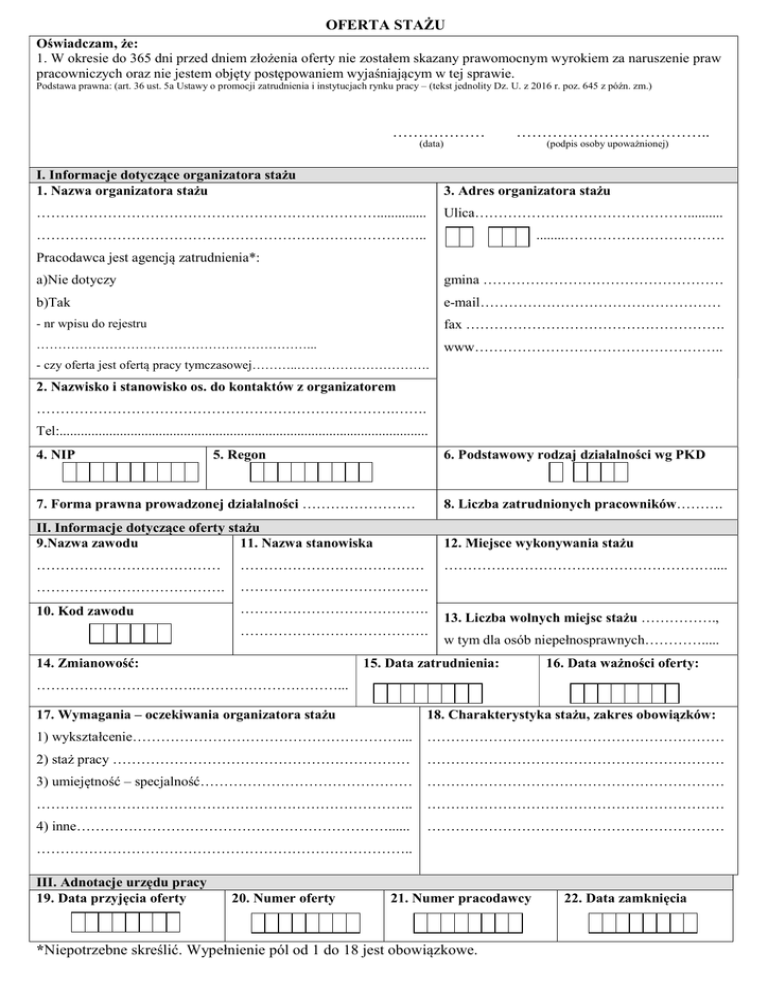 OFERTA STAŻU Oświadczam, że: 1. W okresie do 365 dni przed dniem złożenia oferty nie zostałem skazany prawomocnym wyrokiem za naruszenie praw pracowniczych oraz nie jestem objęty postępowaniem wyjaśniającym w tej sprawie. Podstawa prawna: (art. 36 ust. 5a Ustawy o promocji zatrudnienia i instytucjach rynku pracy – (tekst jednolity Dz. U. z 2016 r. poz. 645 z późn. zm.) ……………… (data) I. Informacje dotyczące organizatora stażu 1. Nazwa organizatora stażu ……………………………….. (podpis osoby upoważnionej) 3. Adres organizatora stażu ……………………………………………………………….............. Ulica……………………………………….......... ……………………………………………………………………….. ........……………………………. Pracodawca jest agencją zatrudnienia*: a)Nie dotyczy gmina …………………………………………… - nr wpisu do rejestru fax ………………………………………………. b)Tak e-mail…………………………………………… ………………………………………………………... - czy oferta jest ofertą pracy tymczasowej………..…………………………. www…………………………………………….. 2. Nazwisko i stanowisko os. do kontaktów z organizatorem ………………………………………………………………….……. Tel:........................................................................................................ 4. NIP 5. Regon 7. Forma prawna prowadzonej działalności …………………… 8. Liczba zatrudnionych pracowników………. II. Informacje dotyczące oferty stażu 9.Nazwa zawodu 11. Nazwa stanowiska 12. Miejsce wykonywania stażu ………………………………… ………………………………… 10. Kod zawodu …………………………………. …………………………………. …………………………………. …………………………………. 14. Zmianowość: …………………………….…………………………... 6. Podstawowy rodzaj działalności wg PKD ………………………………………………….... 13. Liczba wolnych miejsc stażu ……………., w tym dla osób niepełnosprawnych…………..... 15. Data zatrudnienia: 16. Data ważności oferty: 17. Wymagania – oczekiwania organizatora stażu 18. Charakterystyka stażu, zakres obowiązków: 2) staż pracy ……………………………………………………… ……………………………………………………… 1) wykształcenie…………………………………………………... ……………………………………………………… 3) umiejętność – specjalność……………………………………… ……………………………………………………… …………………………………………………………………….. 4) inne…………………………………………………………...... …………………………………………………………………….. III. Adnotacje urzędu pracy 19. Data przyjęcia oferty 20. Numer oferty ……………………………………………………… ……………………………………………………… 21. Numer pracodawcy *Niepotrzebne skreślić. Wypełnienie pól od 1 do 18 jest obowiązkowe. 22. Data zamknięcia Lp. 1 2 3 4 5 Data wydania skierowania REALIZACJA OFERTY STAŻU Imię i nazwisko osoby kierowanej Data przyjęcia na staż Przyczyna niezakwalifikowania na staż Data KONTAKTY Z PRACODAWCĄ (ORGANIZATOREM STAŻU) Ustalenia Data POMOC PRACODAWCY W REKRUTACJI PRZEZ DORADCĘ ZAWODOWEGO Ustalenia