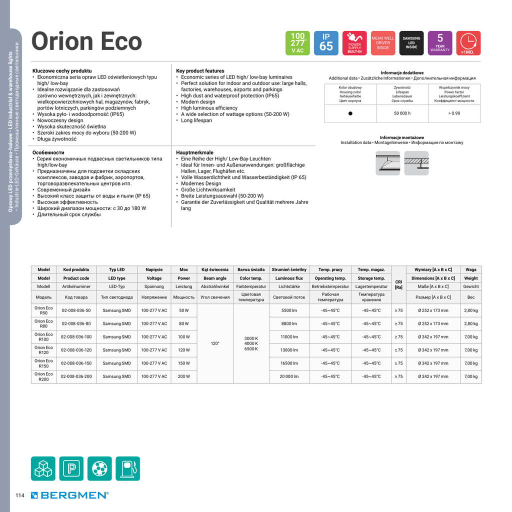 Oprawy LED przemysłowo-halowe • LED industrial & warehouse lights • Industrie-LED-Gehäuse • Промышленные светодиодные светильники 114 - Orion Eco 100 277 V AC Kluczowe cechy produktu • Ekonomiczna seria opraw LED oświetleniowych typu high/ low-bay • Idealne rozwiązanie dla zastosowań zarówno wewnętrznych, jak i zewnętrznych: wielkopowierzchniowych hal, magazynów, fabryk, portów lotniczych, parkingów podziemnych • Wysoka pyło- i wodoodporność (IP65) • Nowoczesny design • Wysoka skuteczność świetlna • Szeroki zakres mocy do wyboru (50-200 W) • Długa żywotność Key product features • Economic series of LED high/ low-bay luminaires • Perfect solution for indoor and outdoor use: large halls, factories, warehouses, airports and parkings • High dust and waterproof protection (IP65) • Modern design • High luminous efficiency • A wide selection of wattage options (50-200 W) • Long lifespan Oсобенности • Серия економичных подвесных светильников типа high/low-bay • Предназначены для подсветки складских комплексов, заводов и фабрик, аэропортов, торговоразвлекательных центров итп. • Современный дизайн • Высокий класс защиты от воды и пыли (IP 65) • Высокая эффективность • Широкий диапазон мощности: с 30 до 180 W • Длительный срок службы Hauptmerkmale • Eine Reihe der High/ Low-Bay-Leuchten • Ideal für Innen- und Außenanwendungen: großflächige Hallen, Lager, Flughäfen etc. • Volle Wasserdichtheit und Wasserbeständigkeit (IP 65) • Modernes Design • Große Lichtwirksamkeit • Breite Leistungsauswahl (50-200 W) • Garantie der Zuverlässigkeit und Qualität mehrere Jahre lang IP 65 POWER SUPPLY BUILT-IN MEAN WELL DRIVER INSIDE SAMSUNG LED INSIDE - 5 YEAR WARRANTY >1MO. Informacje dodatkowe Additional data • Zusätzliche Informationen • Дополнительная информация Kolor obudowy Housing color Gehäusefarbe Цвет корпуса Żywotność Lifespan Lebensdauer Срок службы Współczynnik mocy Power factor Leistungskoeffizient Коэффициент мощности 50 000 h > 0.90 Informacje montażowe Installation data • Montagehinweise • Информация по монтажу 3M Model Kod produktu Typ LED Napięcie Moc Kąt świecenia Barwa światła Strumień świetlny Temp. pracy Temp. magaz. Wymiary [A x B x C] Waga Model Product code LED type Voltage Power Beam angle Color temp. Luminous flux Operating temp. Storage temp. Dimensions [A x B x C] Weight Modell Artikelnummer LED-Typ Spannung Leistung Abstrahlwinkel Farbtemperatur Lichtstärke Betriebstemperatur Lagertemperatur Модель Код товара Тип светодиода Напряжение Мощность Угол свечения Цветовая температура Световой поток Рабочая температура Температура хранения Orion Eco R50 02-008-036-50 Samsung SMD 100-277 V AC 50 W 5500 lm -45~45°C -45~45°C Orion Eco R80 02-008-036-80 Samsung SMD 100-277 V AC 80 W 8800 lm -45~45°C Orion Eco R100 02-008-036-100 Samsung SMD 100-277 V AC 100 W 11000 lm Orion Eco R120 02-008-036-120 Samsung SMD 100-277 V AC 120 W Orion Eco R150 02-008-036-150 Samsung SMD 100-277 V AC Orion Eco R200 02-008-036-200 Samsung SMD 100-277 V AC CRI [Ra] Maße [A x B x C] Gewicht Размер [A x B x C] Bec ≥ 75 Ø 252 x 173 mm 2,80 kg -45~45°C ≥ 75 Ø 252 x 173 mm 2,80 kg -45~45°C -45~45°C ≥ 75 Ø 342 x 197 mm 7,00 kg 13000 lm -45~45°C -45~45°C ≥ 75 Ø 342 x 197 mm 7,00 kg 150 W 16500 lm -45~45°C -45~45°C ≥ 75 Ø 342 x 197 mm 7,00 kg 200 W 20 000 lm -45~45°C -45~45°C ≥ 75 Ø 342 x 197 mm 7,00 kg 120° 3000 K 4000 K 6500 K Oprawy LED przemysłowo-halowe • LED industrial & warehouse lights • Industrie-LED-Gehäuse • Промышленные светодиодные светильники 115