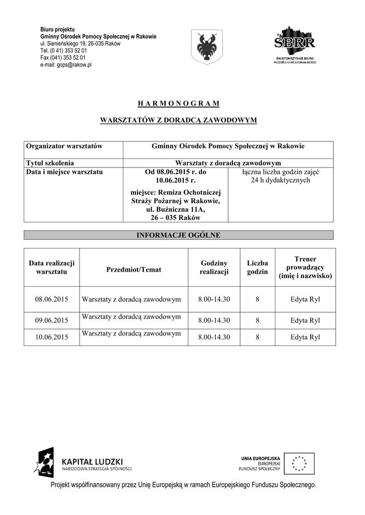 Biuro projektu Gminny Ośrodek Pomocy Społecznej w Rakowie ul. Sienieńskiego 19, 26-035 Raków Tel. (0 41) 353 52 01 Fax (041) 353 52 01 e-mail: [email protected] HARMONOGRAM WARSZTATÓW Z DORADCĄ ZAWODOWYM Organizator warsztatów Tytuł szkolenia Data i miejsce warsztatu Gminny Ośrodek Pomocy Społecznej w Rakowie Warsztaty z doradcą zawodowym łączna liczba godzin zajęć Od 08.06.2015 r. do 24 h dydaktycznych 10.06.2015 r. miejsce: Remiza Ochotniczej Straży Pożarnej w Rakowie, ul. Buźniczna 11A, 26 – 035 Raków INFORMACJE OGÓLNE Data realizacji warsztatu 08.06.2015 09.06.2015 10.06.2015 Przedmiot/Temat Warsztaty z doradcą zawodowym Warsztaty z doradcą zawodowym Warsztaty z doradcą zawodowym Godziny realizacji Liczba godzin Trener prowadzący (imię i nazwisko) 8.00-14.30 8 Edyta Ryl 8.00-14.30 8 Edyta Ryl 8.00-14.30 8 Edyta Ryl Projekt współfinansowany przez Unię Europejską w ramach Europejskiego Funduszu Społecznego. Biuro projektu Gminny Ośrodek Pomocy Społecznej w Rakowie ul. Sienieńskiego 19, 26-035 Raków Tel. (0 41) 353 52 01 Fax (041) 353 52 01 e-mail: [email protected] HARMONOGRAM WARSZTATÓW UMIEJĘTNOŚCI SPOŁECZNYCH Organizator warsztatów Tytuł szkolenia Data i miejsce warsztatu Gminny Ośrodek Pomocy Społecznej w Rakowie Warsztaty umiejętności społecznych łączna liczba godzin zajęć Od 11.06.2015 r. do 24 h dydaktycznych 15.06.2015 r. miejsce: Remiza Ochotniczej Straży Pożarnej w Rakowie, ul. Buźniczna 11A, 26 – 035 Raków INFORMACJE OGÓLNE Data realizacji warsztatu 11.06.2015 12.06.2015 15.06.2015 Przedmiot/Temat Warsztaty umiejętności społecznych Warsztaty umiejętności społecznych Warsztaty umiejętności społecznych Godziny realizacji Liczba godzin Trener prowadzący (imię i nazwisko) 8.00-14.30 8 Adrianna Stokowiec 8.00-14.30 8.00-14.30 8 8 Adrianna Stokowiec Adrianna Stokowiec Projekt współfinansowany przez Unię Europejską w ramach Europejskiego Funduszu Społecznego. Biuro projektu Gminny Ośrodek Pomocy Społecznej w Rakowie ul. Sienieńskiego 19, 26-035 Raków Tel. (0 41) 353 52 01 Fax (041) 353 52 01 e-mail: [email protected] HARMONOGRAM WARSZTATÓW Z PSYCHOLOGIEM Organizator warsztatów Tytuł szkolenia Data i miejsce warsztatu Gminny Ośrodek Pomocy Społecznej w Rakowie Warsztaty z psychologiem łączna liczba godzin zajęć Od 17.06.2015 r. do 24 h dydaktycznych 19.06.2015 r. miejsce: Remiza Ochotniczej Straży Pożarnej w Rakowie, ul. Buźniczna 11A, 26 – 035 Raków INFORMACJE OGÓLNE Data realizacji warsztatu 17.06.2015 18.06.2015 19.06.2015 Przedmiot/Temat Godziny realizacji Liczba godzin Trener prowadzący (imię i nazwisko) Warsztaty z psychologiem 8.00-14.30 8 Adrianna Stokowiec 8.00-14.30 8 8.00-14.30 8 Warsztaty z psychologiem Warsztaty z psychologiem Adrianna Stokowiec Adrianna Stokowiec Projekt współfinansowany przez Unię Europejską w ramach Europejskiego Funduszu Społecznego. Biuro projektu Gminny Ośrodek Pomocy Społecznej w Rakowie ul. Sienieńskiego 19, 26-035 Raków Tel. (0 41) 353 52 01 Fax (041) 353 52 01 e-mail: [email protected] HARMONOGRAM WARSZTATÓW WIZAŻU Organizator warsztatów Tytuł szkolenia Data i miejsce warsztatu Gminny Ośrodek Pomocy Społecznej w Rakowie Warsztaty wizażu łączna liczba godzin zajęć Od 22.06.2015 r. do 24 h dydaktycznych 24.06.2015 r. miejsce: Remiza Ochotniczej Straży Pożarnej w Rakowie, ul. Buźniczna 11A, 26 – 035 Raków INFORMACJE OGÓLNE Data realizacji warsztatu 22.06.2015 23.06.2015 24.06.2015 Przedmiot/Temat Godziny realizacji Liczba godzin Trener prowadzący (imię i nazwisko) Warsztaty wizażu 8.00-14.30 8 Magdalena Tarnopolska 8.00-14.30 8 8.00-14.30 8 Warsztaty wizażu Warsztaty wizażu Magdalena Tarnopolska Magdalena Tarnopolska Projekt współfinansowany przez Unię Europejską w ramach Europejskiego Funduszu Społecznego.